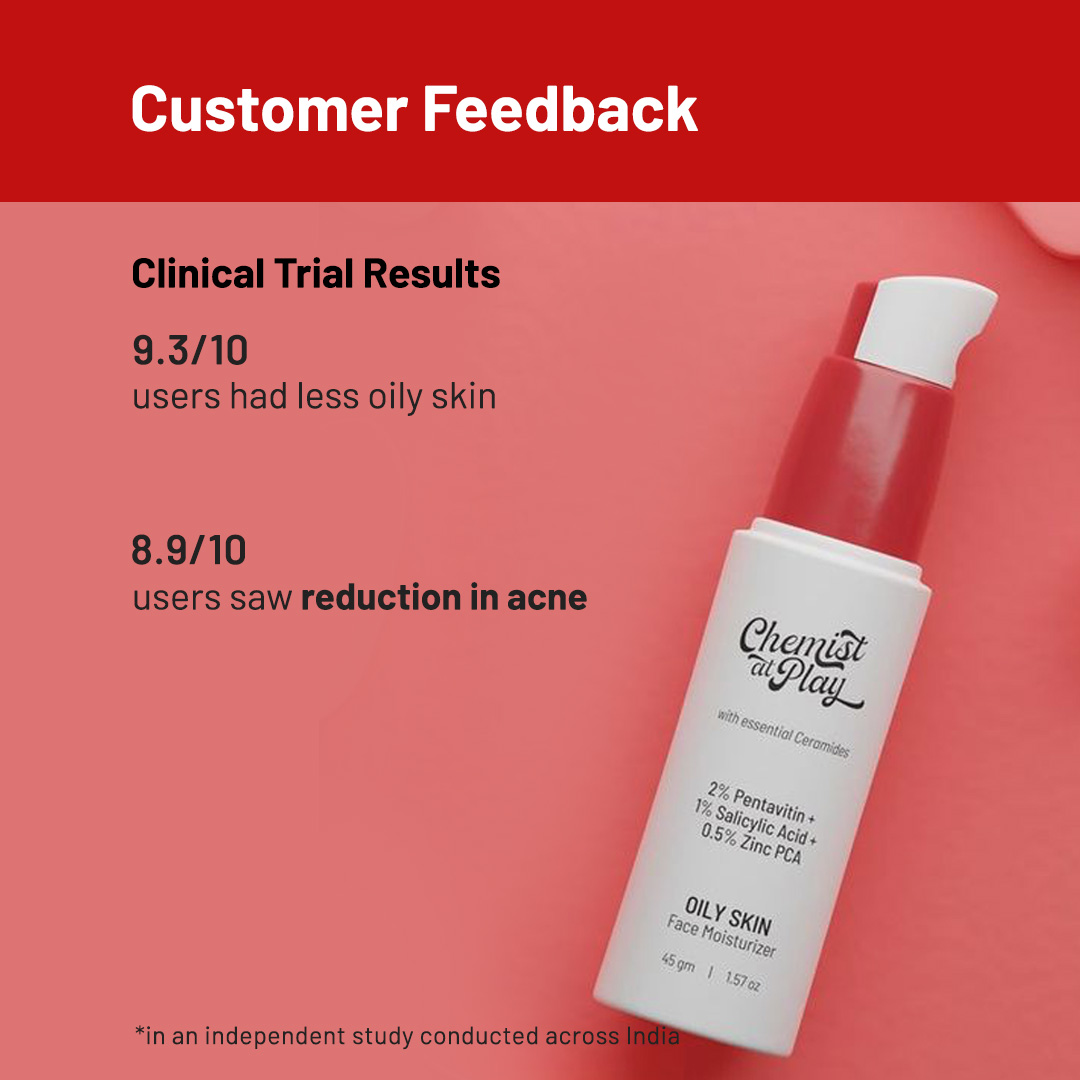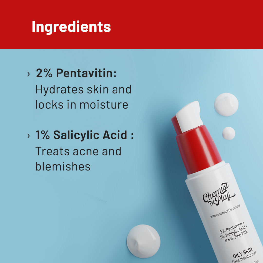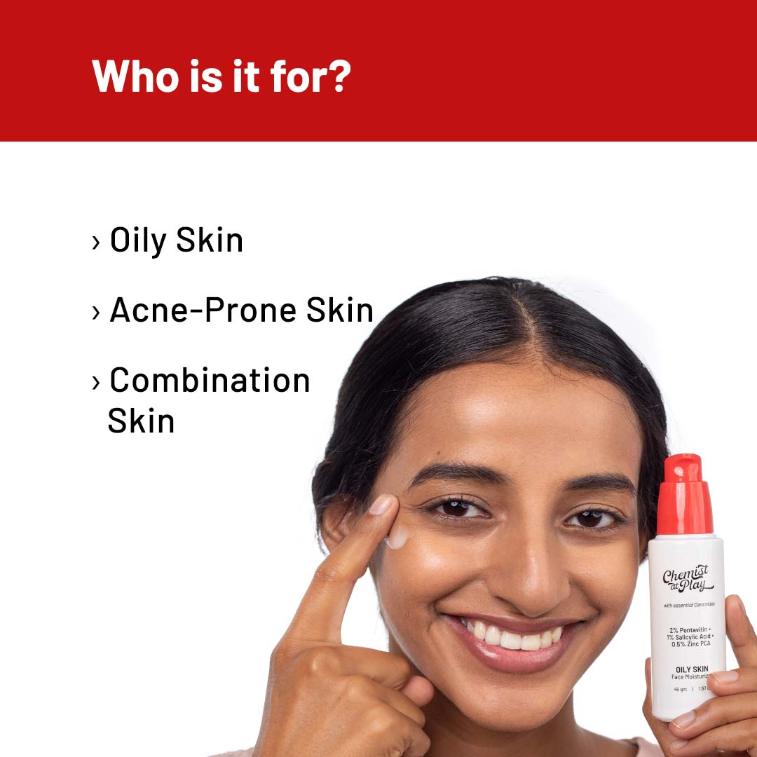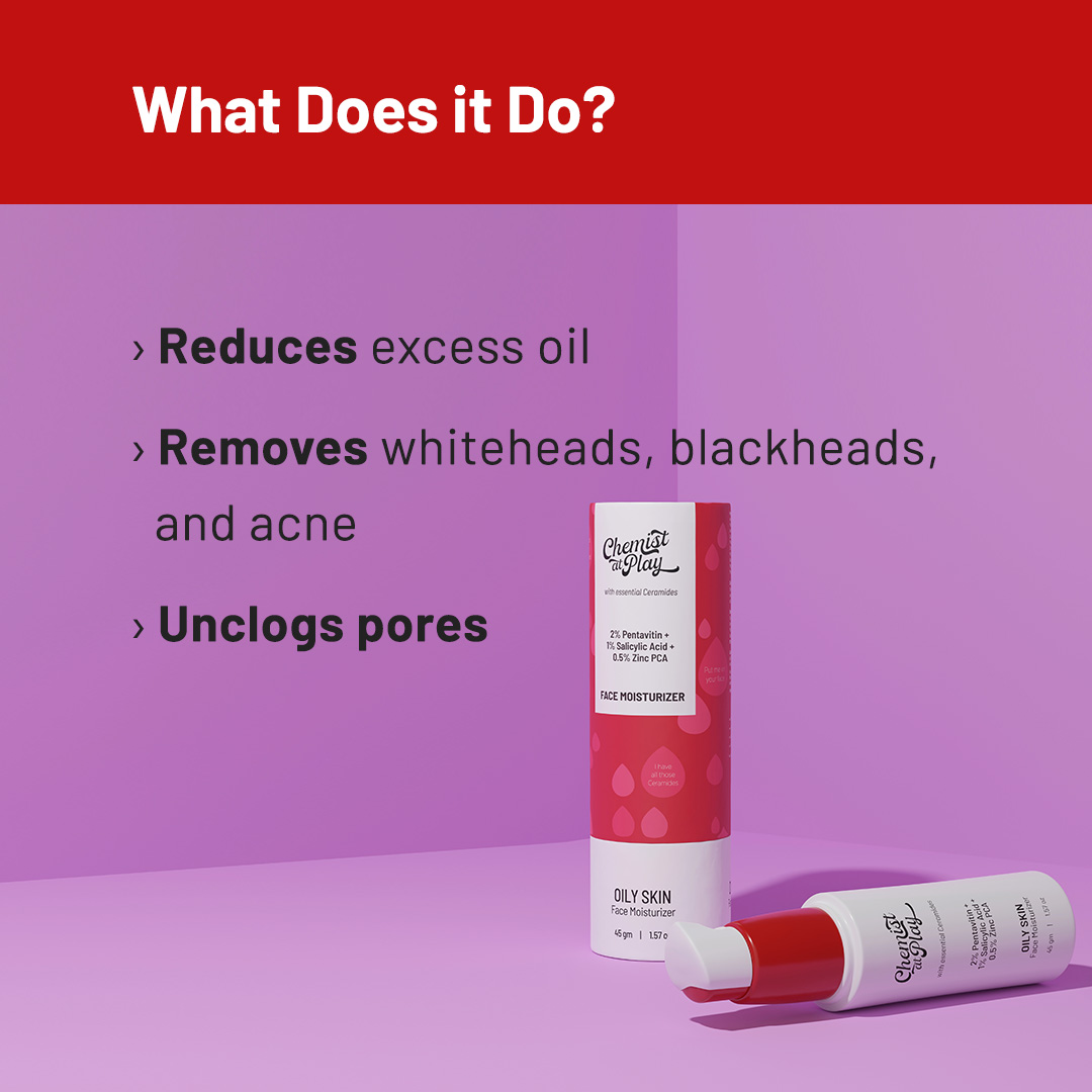 A weightless, non-comedogenic face moisturiser meant for the oily skin type and is enriched with 2% Pentavitin, 1% Salicylic Acid and 0.5% Zinc PCA. Its also infused with Ceramides and glides on the skin like a dream, making sure your skin looks instantly hydrated and radiant. It's perfect for everyone who has oily or acne-prone skin as it controls excess sebum production, aids in acne elimination and ensures you have an oil-free finish throughout the day!