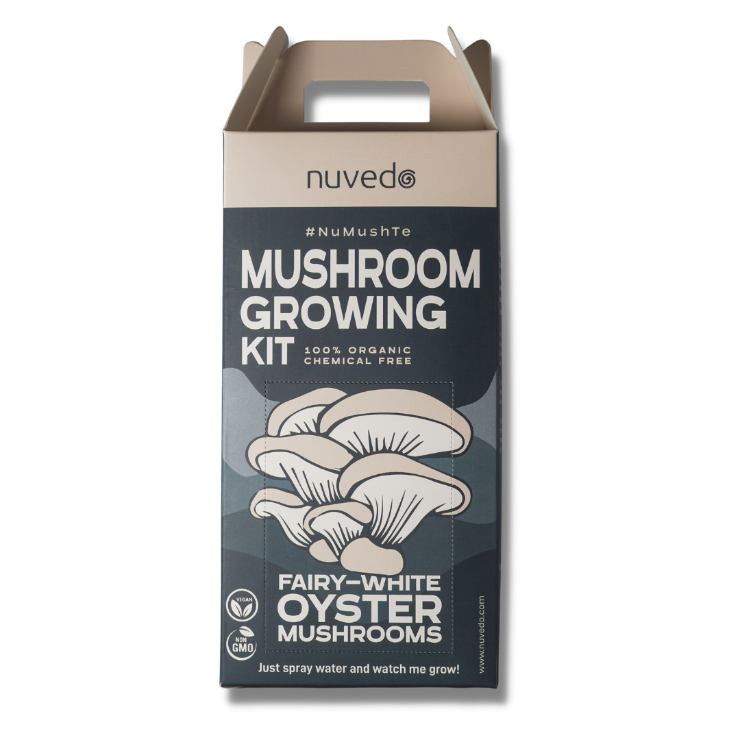 Nuvedoís Mushroom Growing Kit is a hassle-free way to grow your own chemical-free, organic, vegan & gourmet mushrooms at home! Just open, spray daily with our little spray bottle, and in 10 days youíll be harvesting your own mushrooms from the box and straight to your plate.Fairy White Oyster (Pleurotus florida) a variety of oyster mushroom known for its pure white colour, unique texture and rich clusters! For this variety of oyster mushroom, we recommend a temperature of 16 C to 26 C.