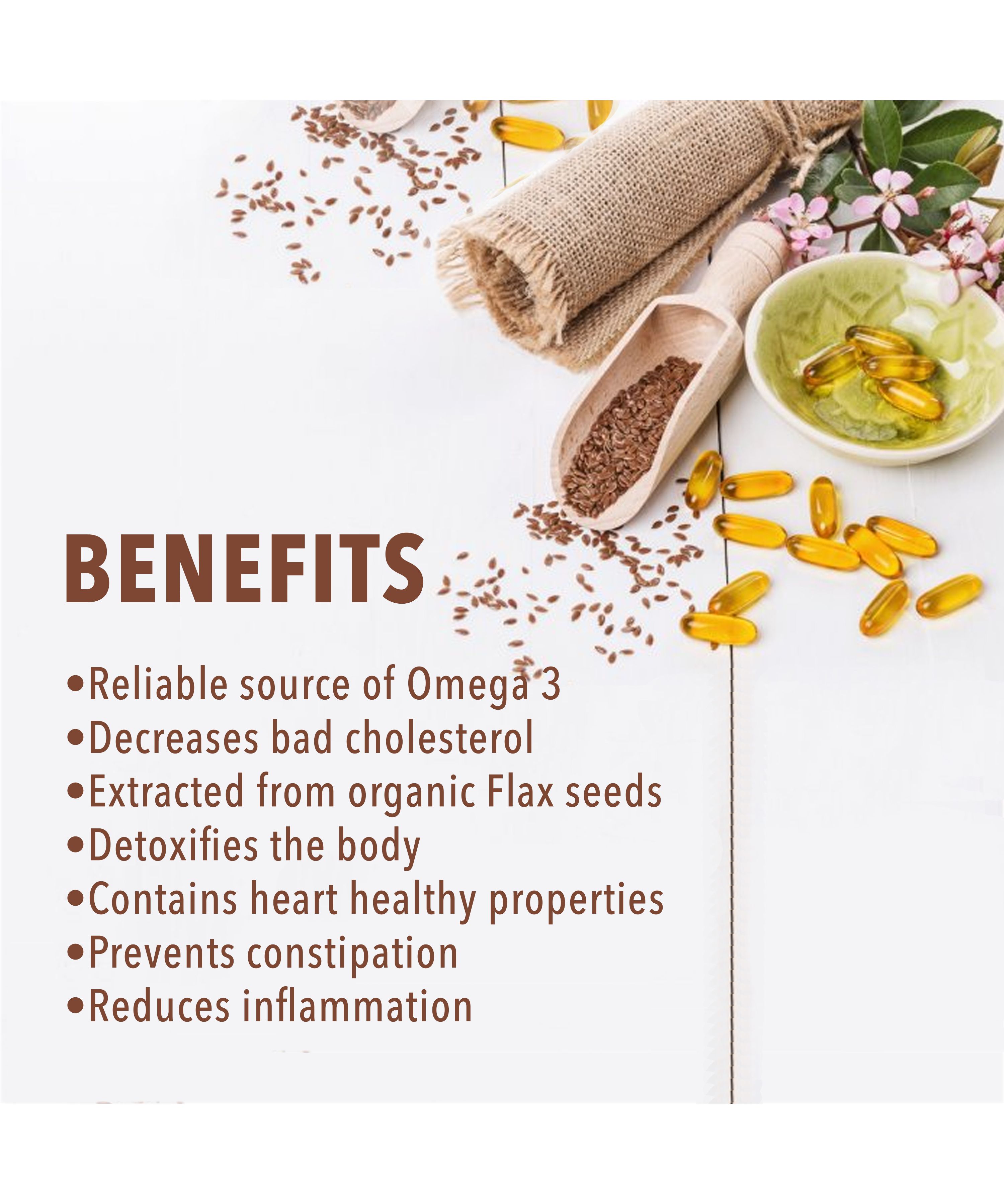 Nutriorg Flax Seed Oil 500 mg capsules made from 100% vegetarian Flaxseeds. It is extracted from the highest quality of organic flaxseeds. The oil is purely organic. It aids the detoxification of the body and reduces obesity. Flaxseed is the most reliable source of Omega-3 for a vegetarian diet. Omega-3 is a major component the cell membranes. The Nutriorg Flaxseed Capsule is rich in Omega -3 heart healthy fatty acids.. It works wonders in improves diarrhea and constipation conditions. Flaxseeds are believed to reduce inflammation.
