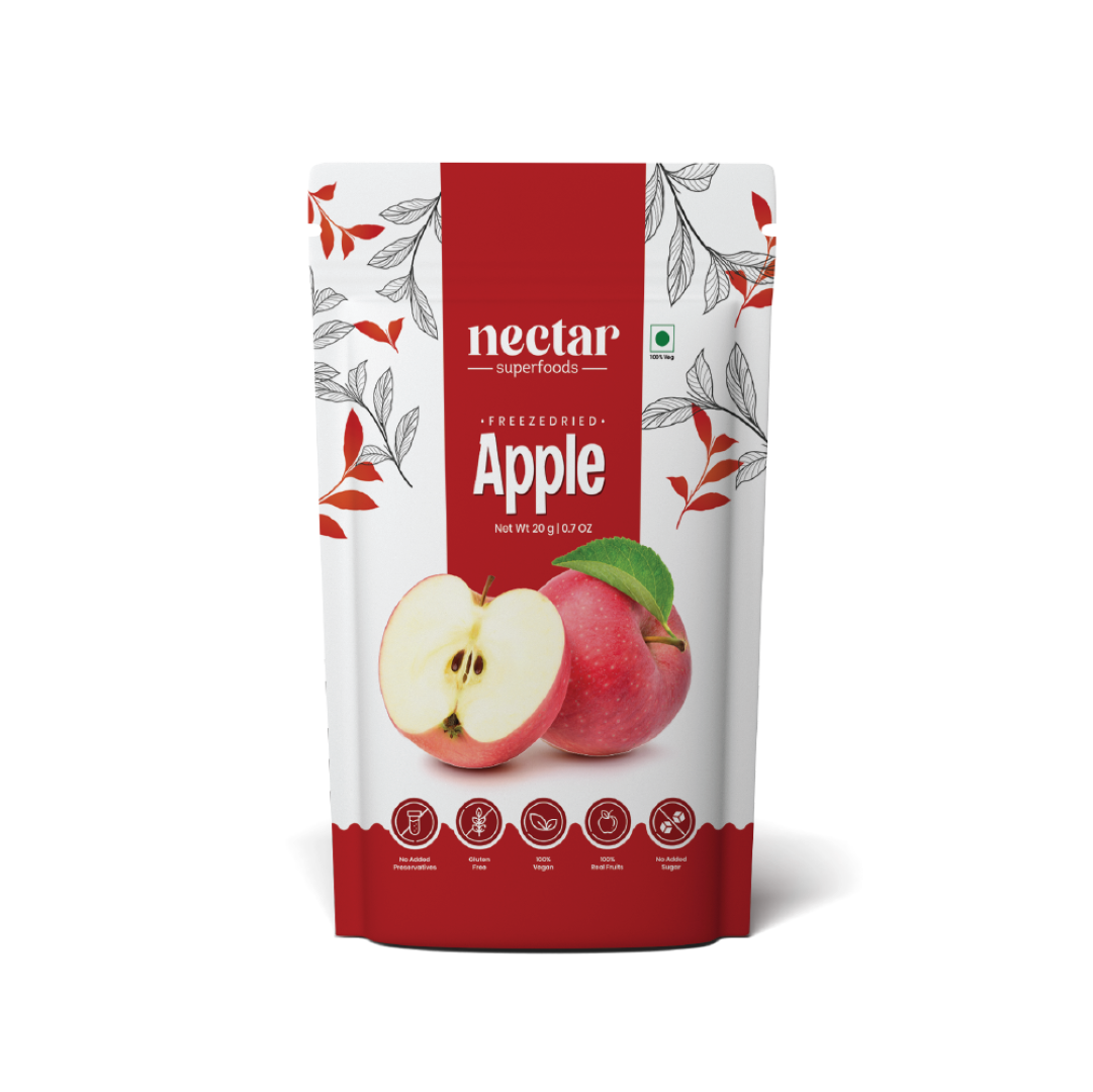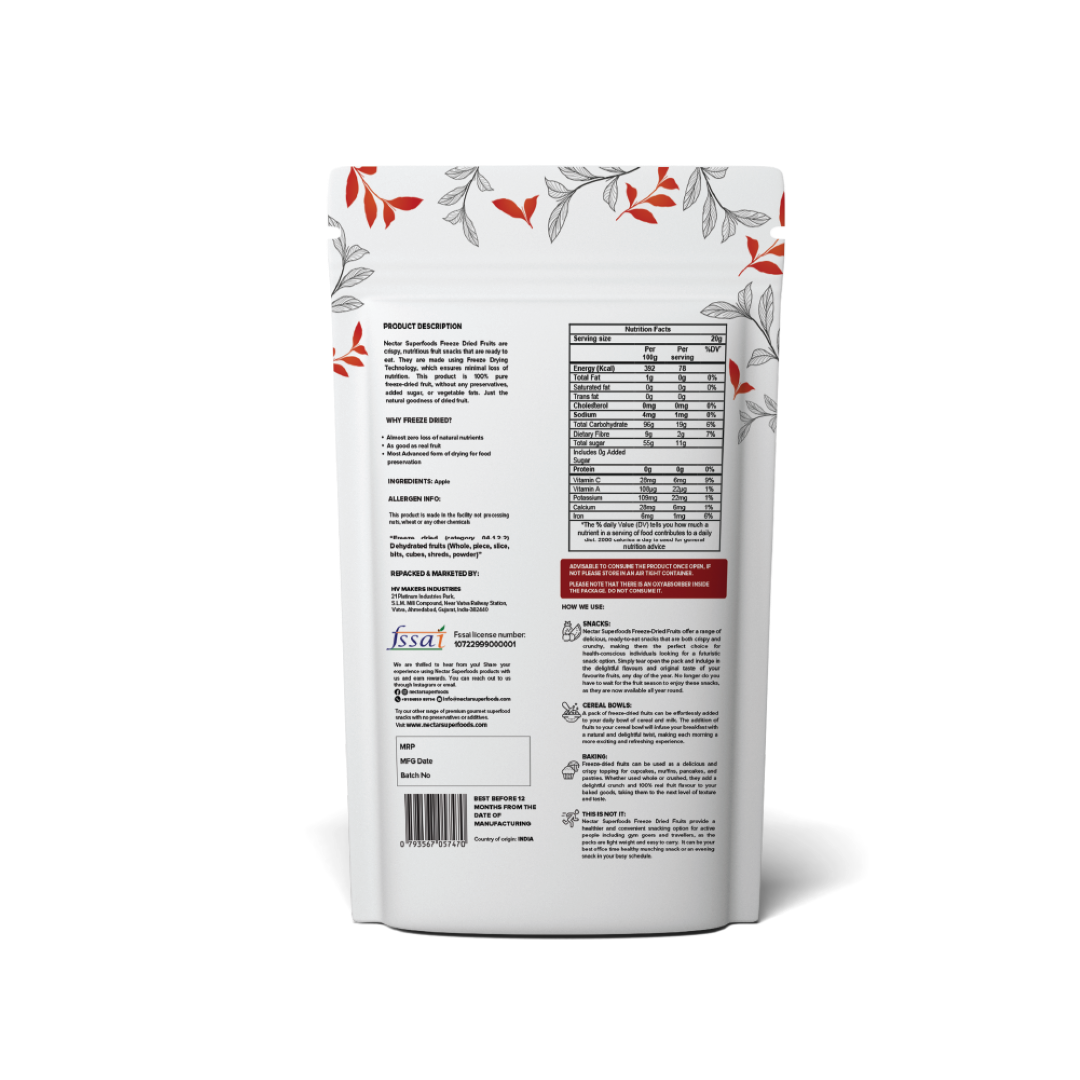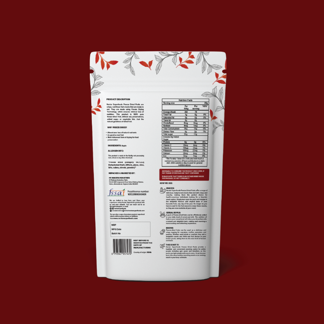 Freeze Dried Fruits : Each pack offers 100% natural ready toeat freeze-dried fruit in cut slices, whole or cubes form. The product is packed in a 3-layer food grade aluminium pouch. It is made using vacuum freeze-drying technology.