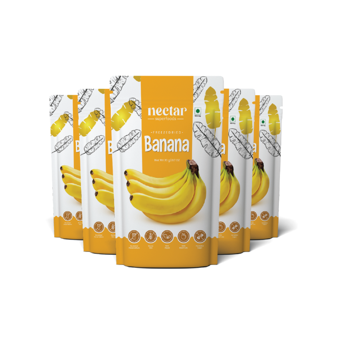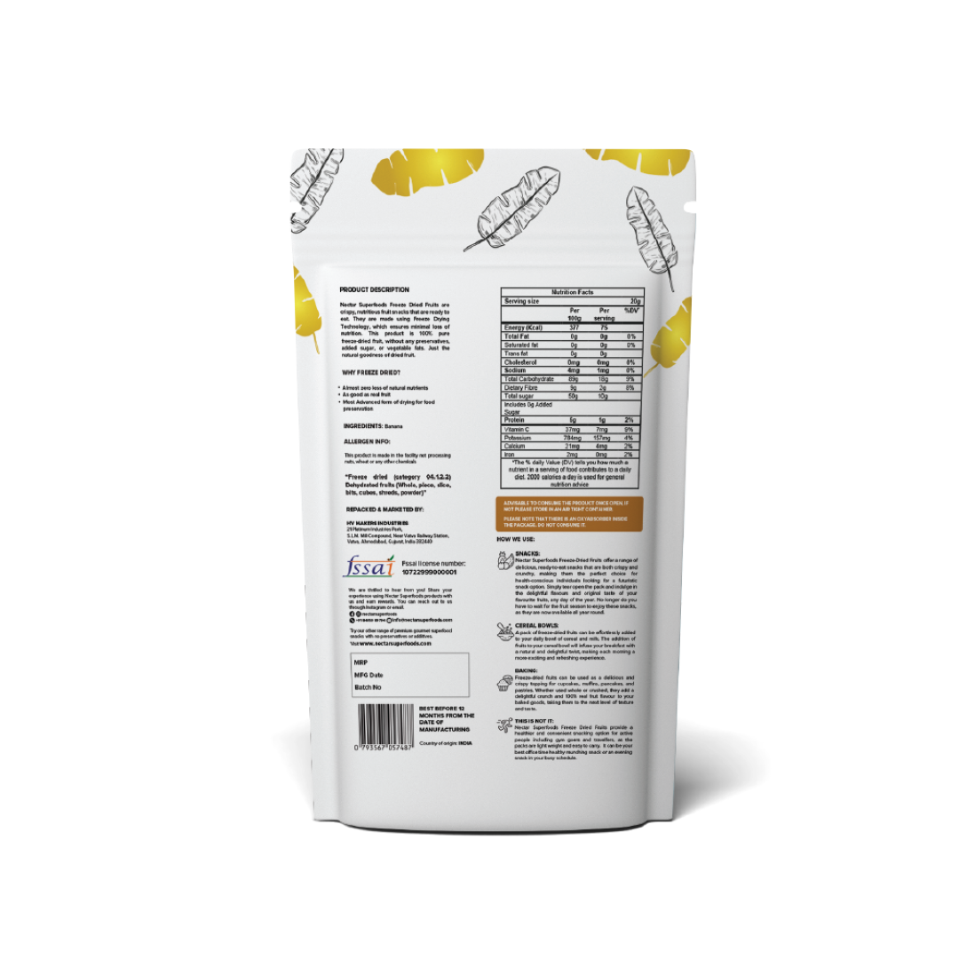 Freeze Dried Fruits : Each pack offers 100% natural ready toeat freeze-dried fruit in cut slices, whole or cubes form. The product is packed in a 3-layer food grade aluminium pouch. It is made using vacuum freeze-drying technology.