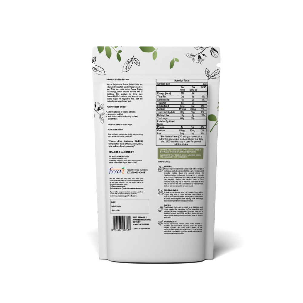 Freeze Dried Fruits : Each pack offers 100% natural ready toeat freeze-dried fruit in cut slices, whole or cubes form. The product is packed in a 3-layer food grade aluminium pouch. It is made using vacuum freeze-drying technology.