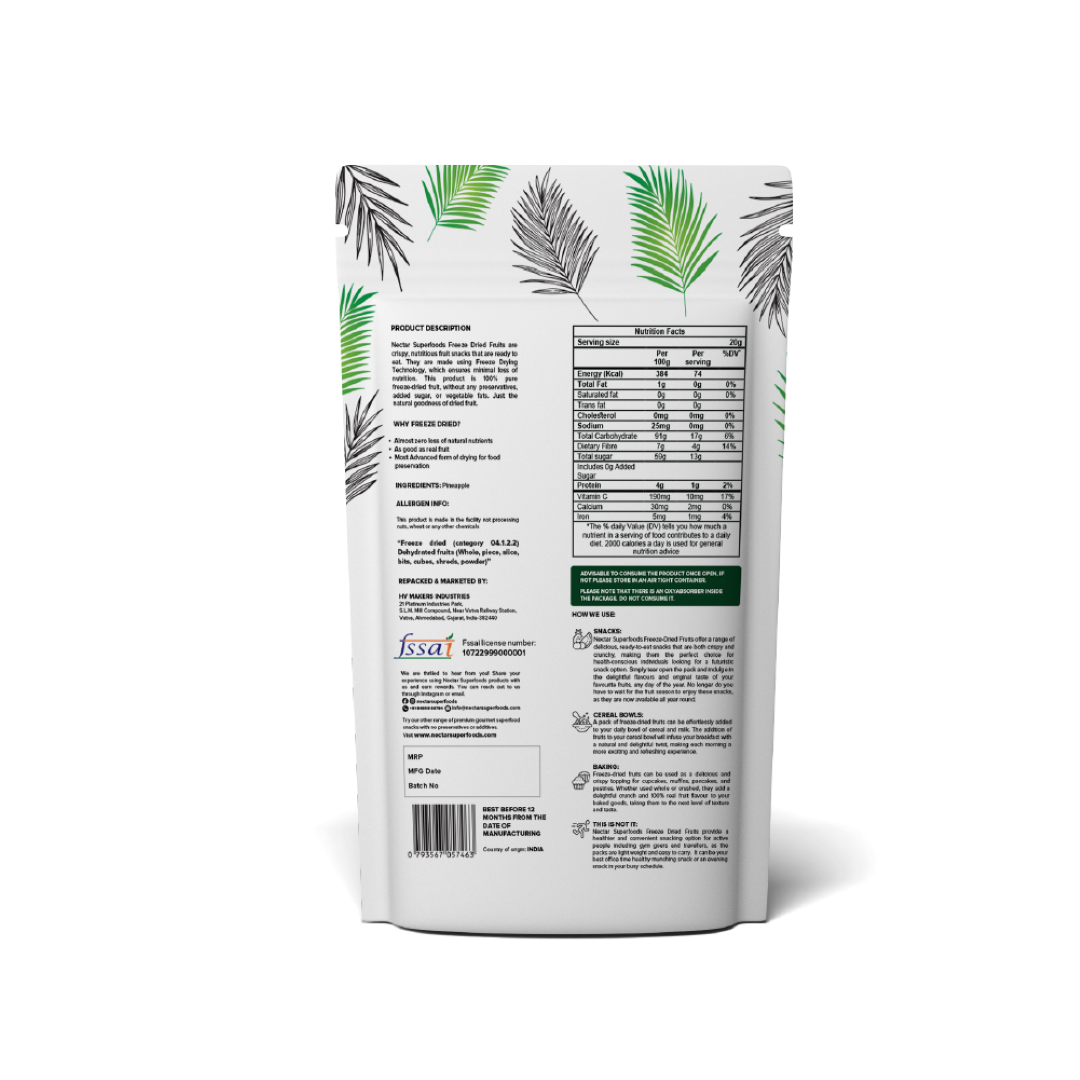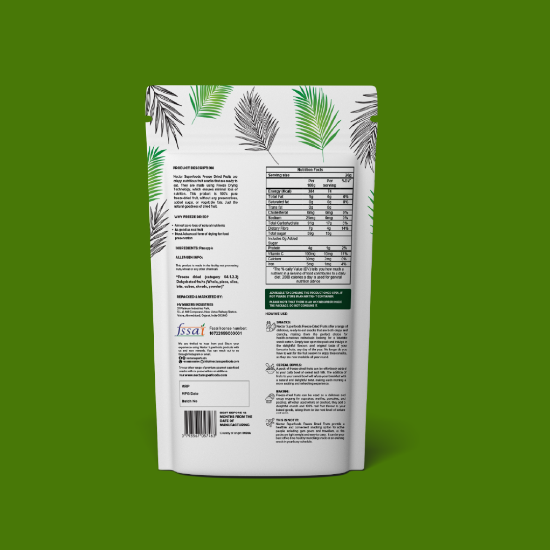 Freeze Dried Fruits : Each pack offers 100% natural ready toeat freeze-dried fruit in cut slices, whole or cubes form. The product is packed in a 3-layer food grade aluminium pouch. It is made using vacuum freeze-drying technology.