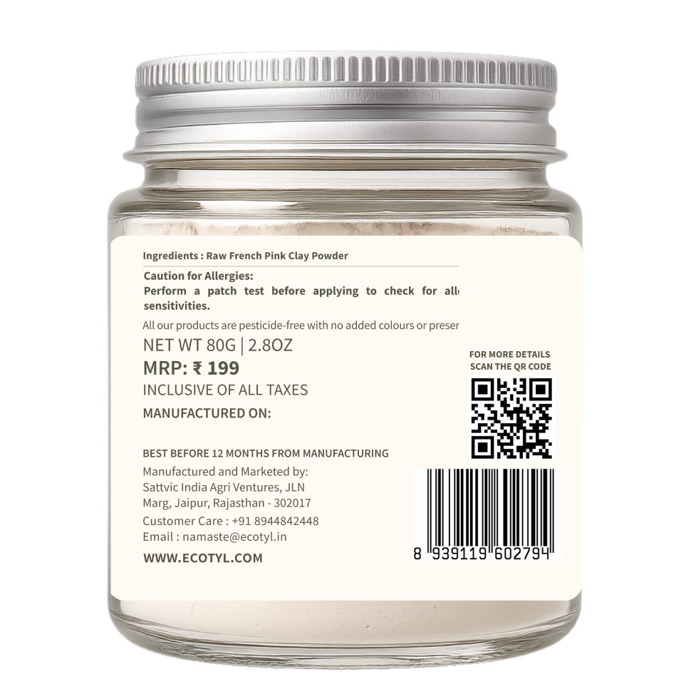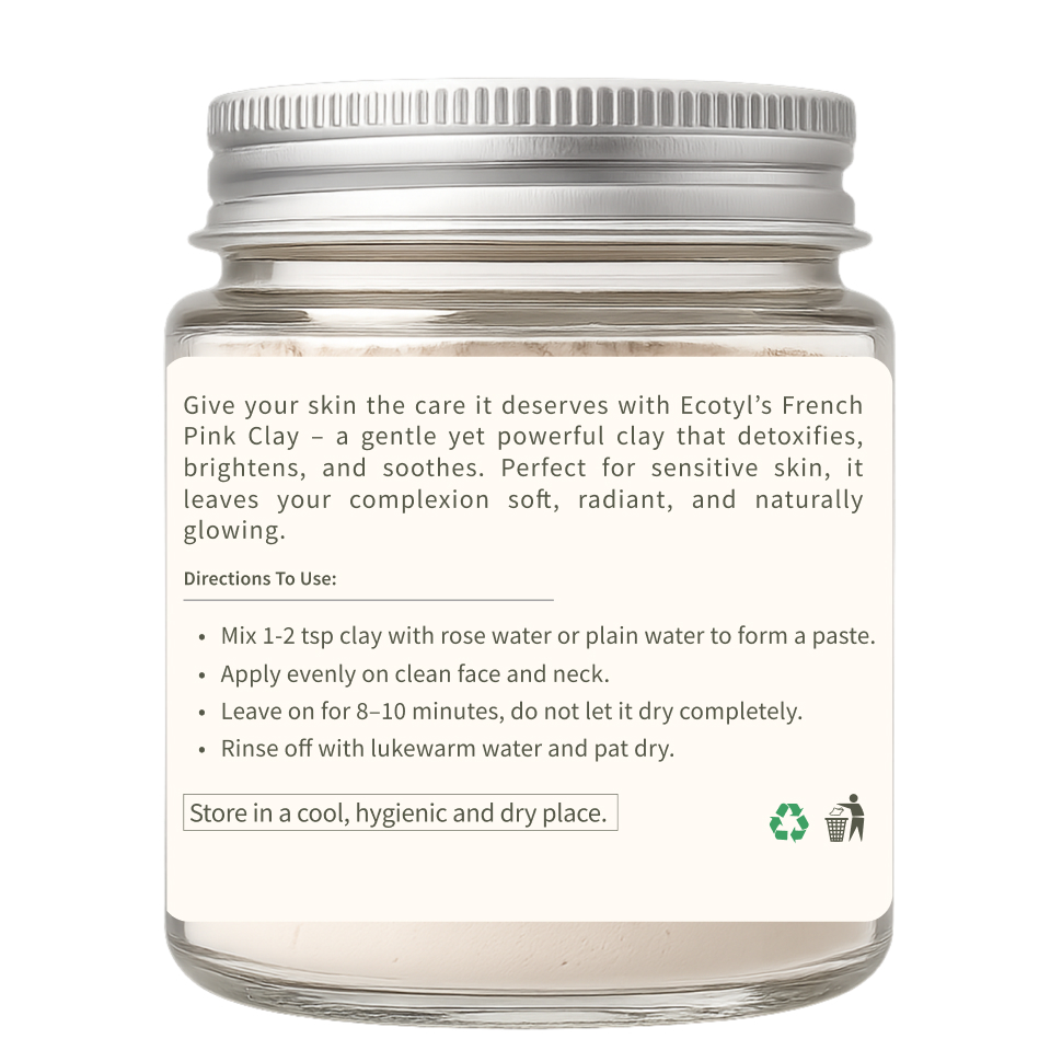 Reveal your skins natural radiance with Ecotyls French Pink Clay - a soothing, mineral-rich blend of red and white clays that detoxifies and nourishes without drying or irritation. Naturally packed with silica, iron, and magnesium, this clay gently draws out impurities, refines pores, and promotes a healthy, balanced glow.