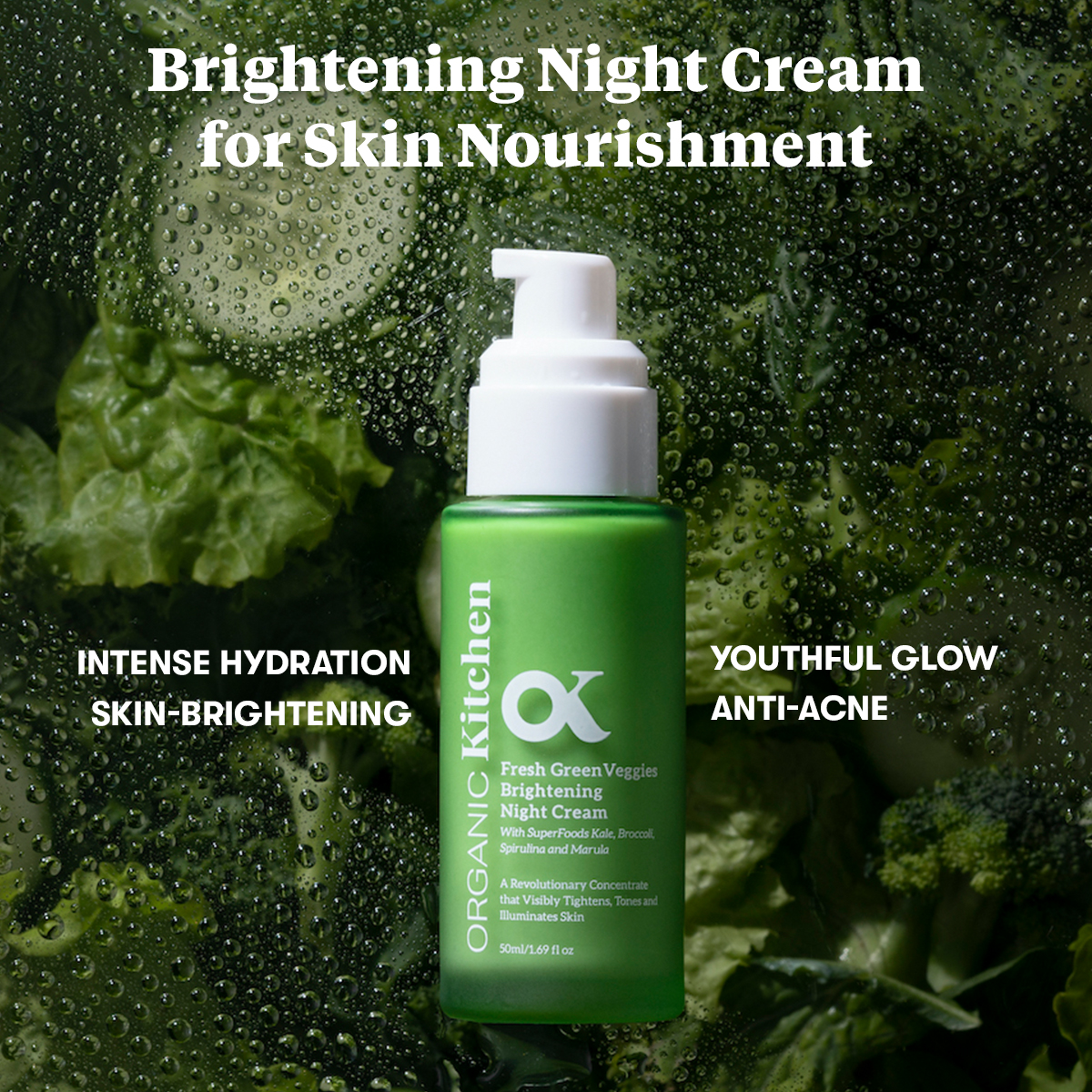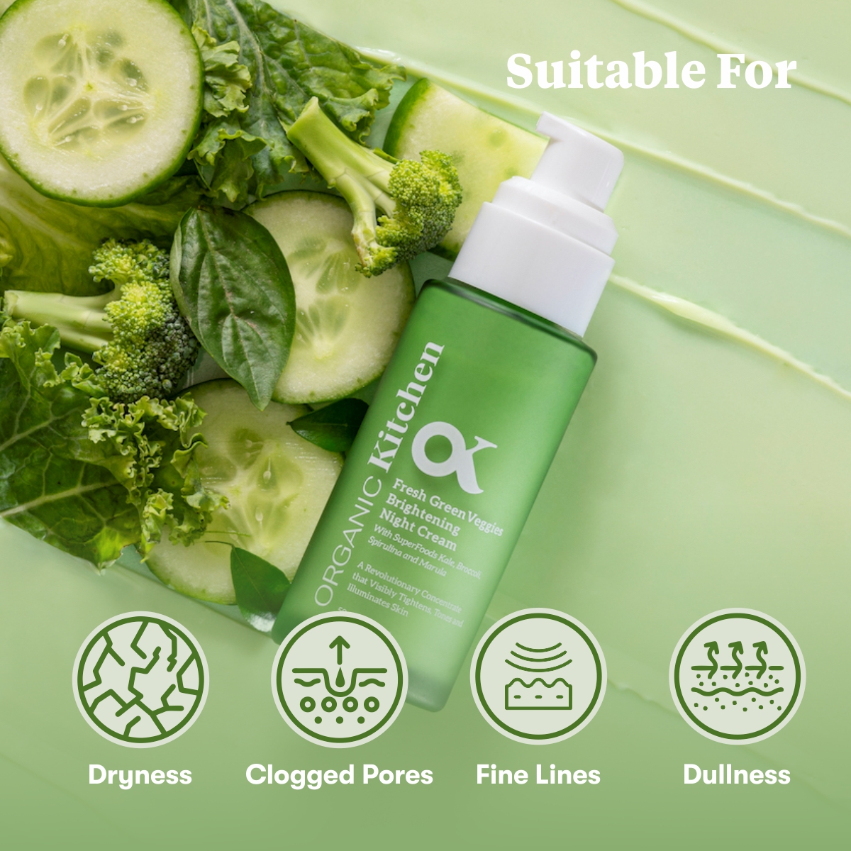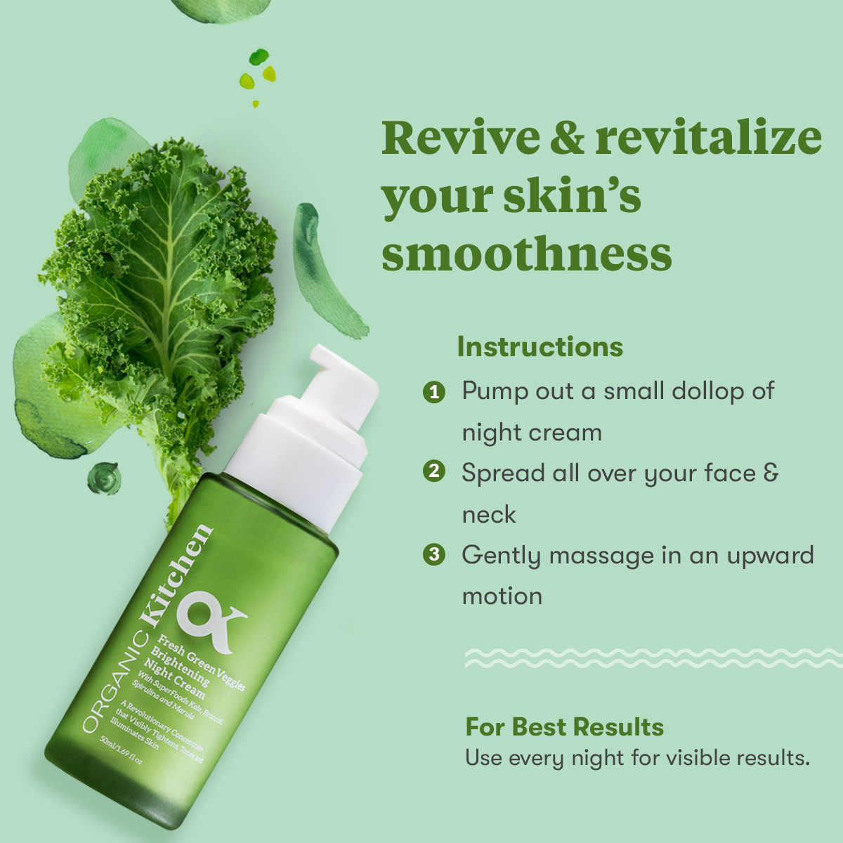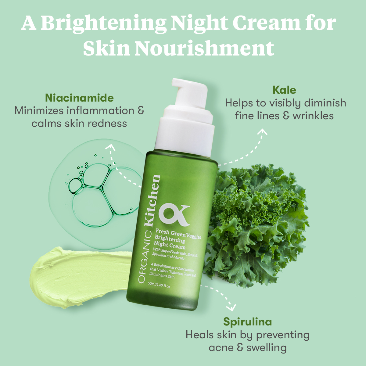 Let your skin glow with the goodness of nature. This Fresh Green Veggies Brightening Night Cream provides you with visibly illuminating and glowing skin with the benefits of Kale, Spirulina, and Niacinamide. Also enriched with vitamin E and Jojoba oil, it softens the skin and keeps it moisturized. Kale and Spirulina reduce fine lines, wrinkles, and pigmentation by preserving the skins collagen. Niacinamide makes skin smooth, healthy, and clear. Achieve smooth and glossy skin with this Fresh Green Veggies Night Cream.