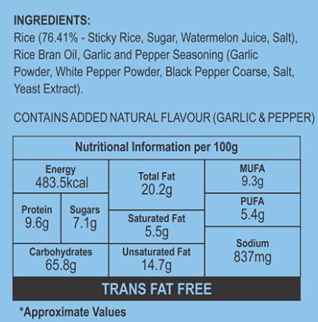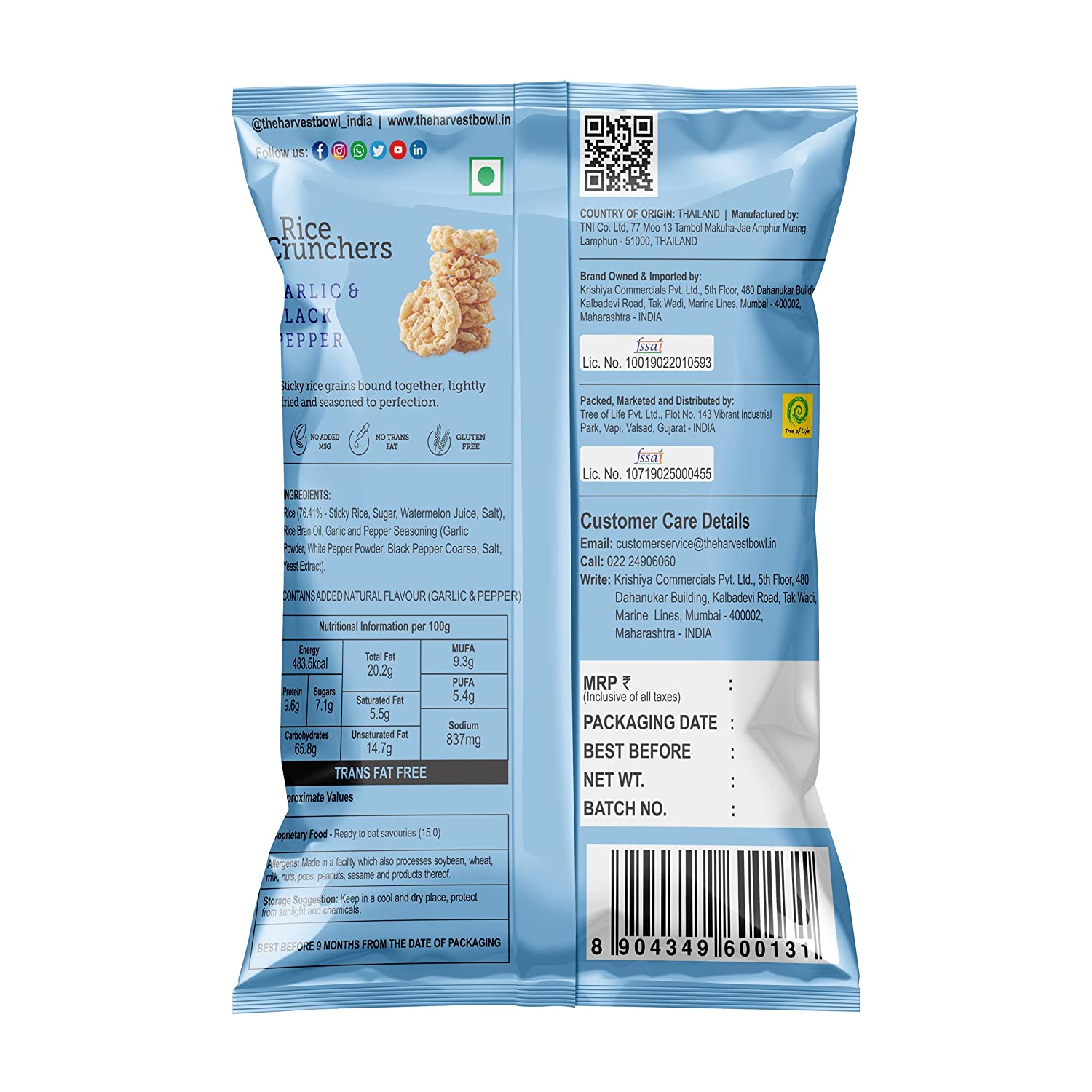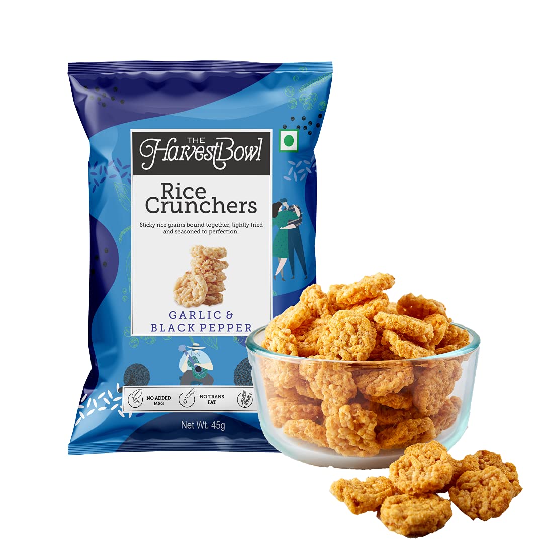 The Harvest Bowl Garlic and Black Pepper Rice Crunchers are healthy crunchers. These crunchers are baked and not fried. It is made with sticky rice, mung beans and black soybeans. They are super crunchy and perfectly seasoned with garlic and black pepper flavour. These crunchers are very healthy and a guilt-free snack. You can eat it straight out of the pack or have it with some dip or as a topping. It does not contain any added trans fats, added MSG, artificial flavours or colouring.BENEFITS