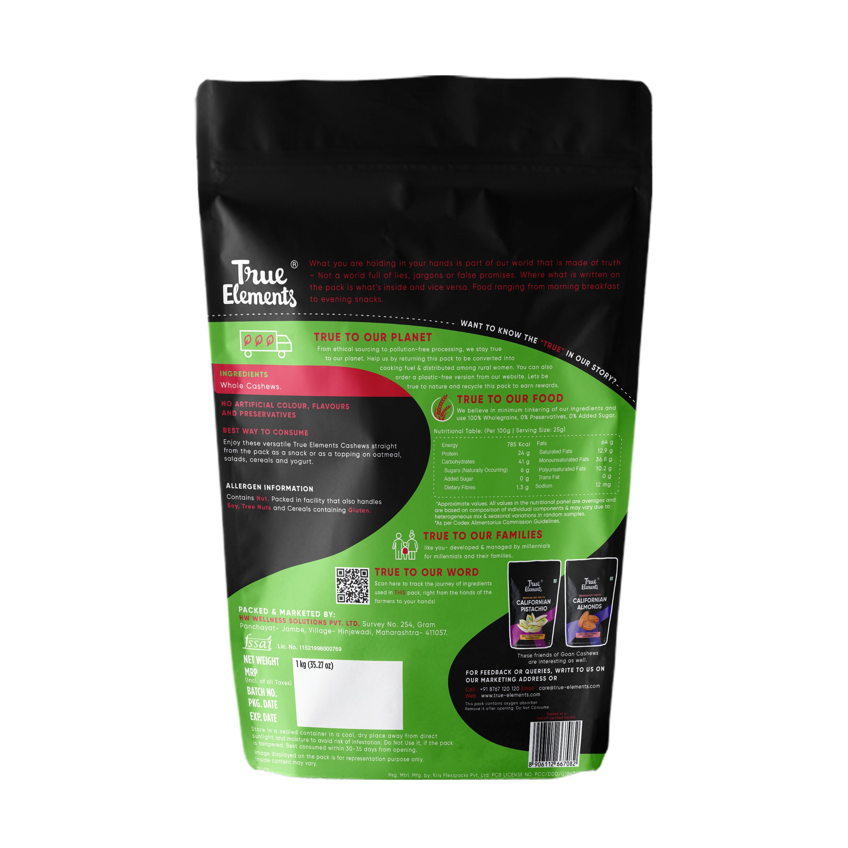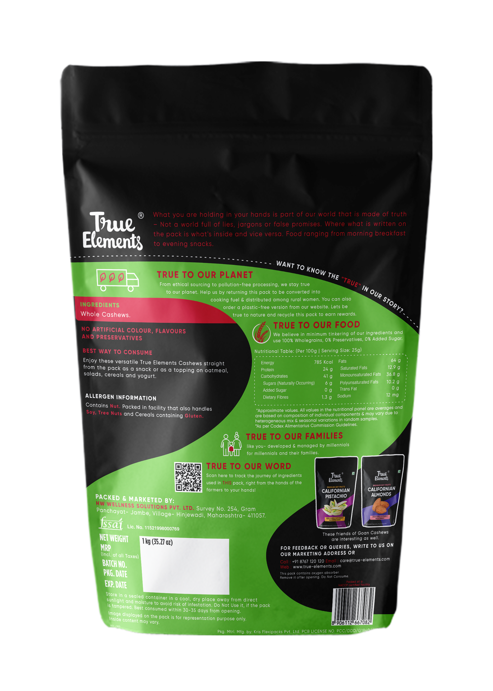Cashews, also known as Kaju are one of the most popular ingredients added in Indian dishes to add an extra aroma & flavour to them. While being extremely delicious, cashews also provide numerous health benefits. True Elements Goan Cashews are handpicked, premium quality, 100% natural & whole cashews that will definitely delight your taste buds with crunch & flavour. They have a mild nutty flavour with a creamy & rich texture. Our cashews are hygienically cleaned & our quality checks ensure that there are no broken pieces or any residues. Being whole and premium means the pack will have no broken pieces, so you can fully enjoy the 100% nutrition & taste. They are rich in protein, magnesium, selenium, & essential fats. From protecting your heart health to giving you supple skin, cashews are a powerhouse of health benefits. Add them to your breakfast bowls/salads, make cashew milk/butter or simply grab a few to munch on.