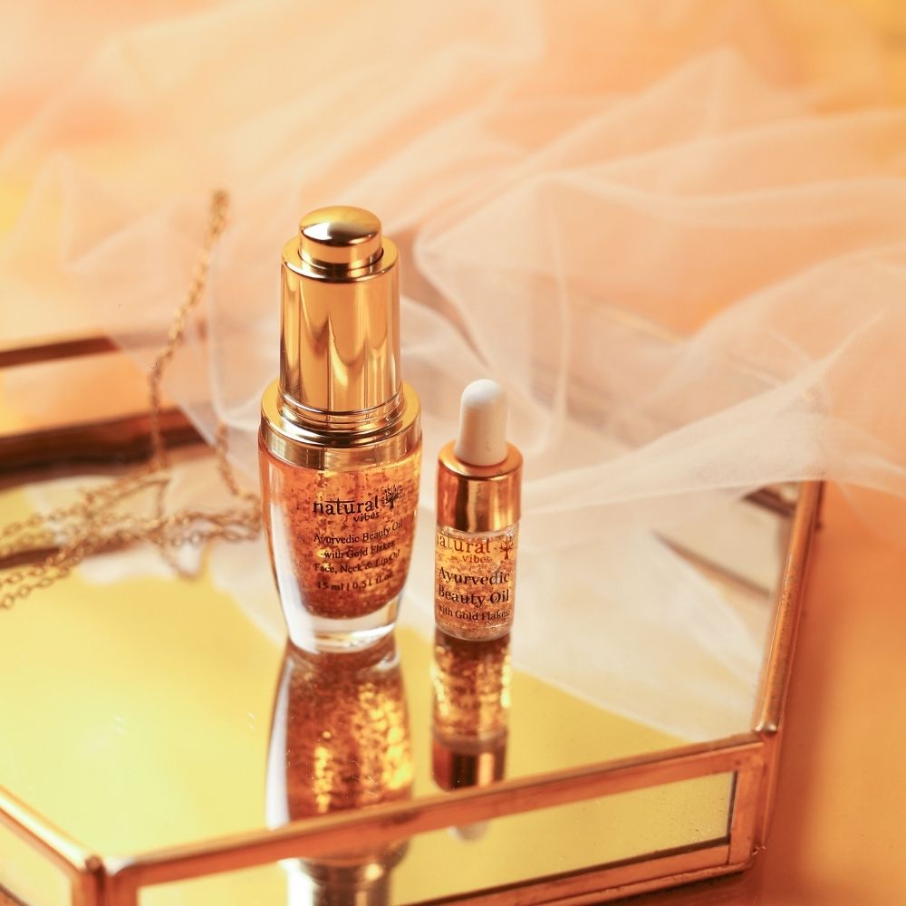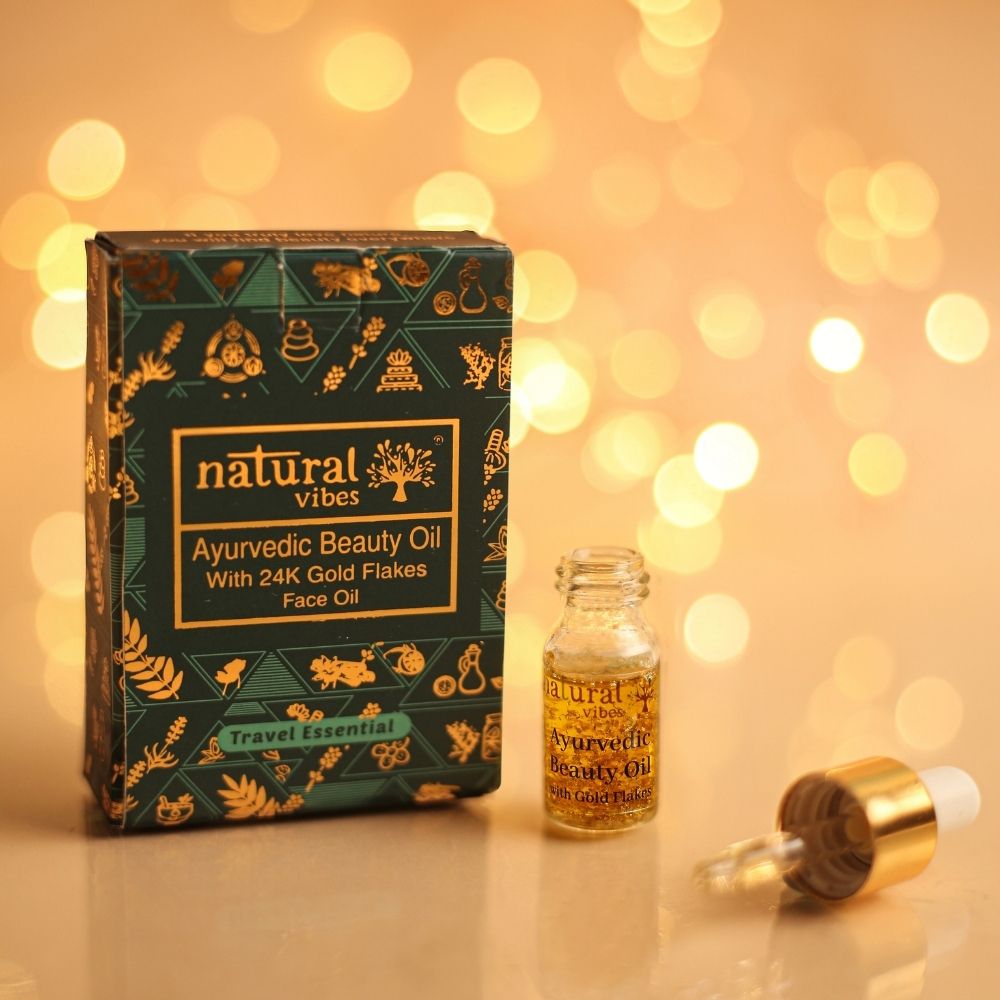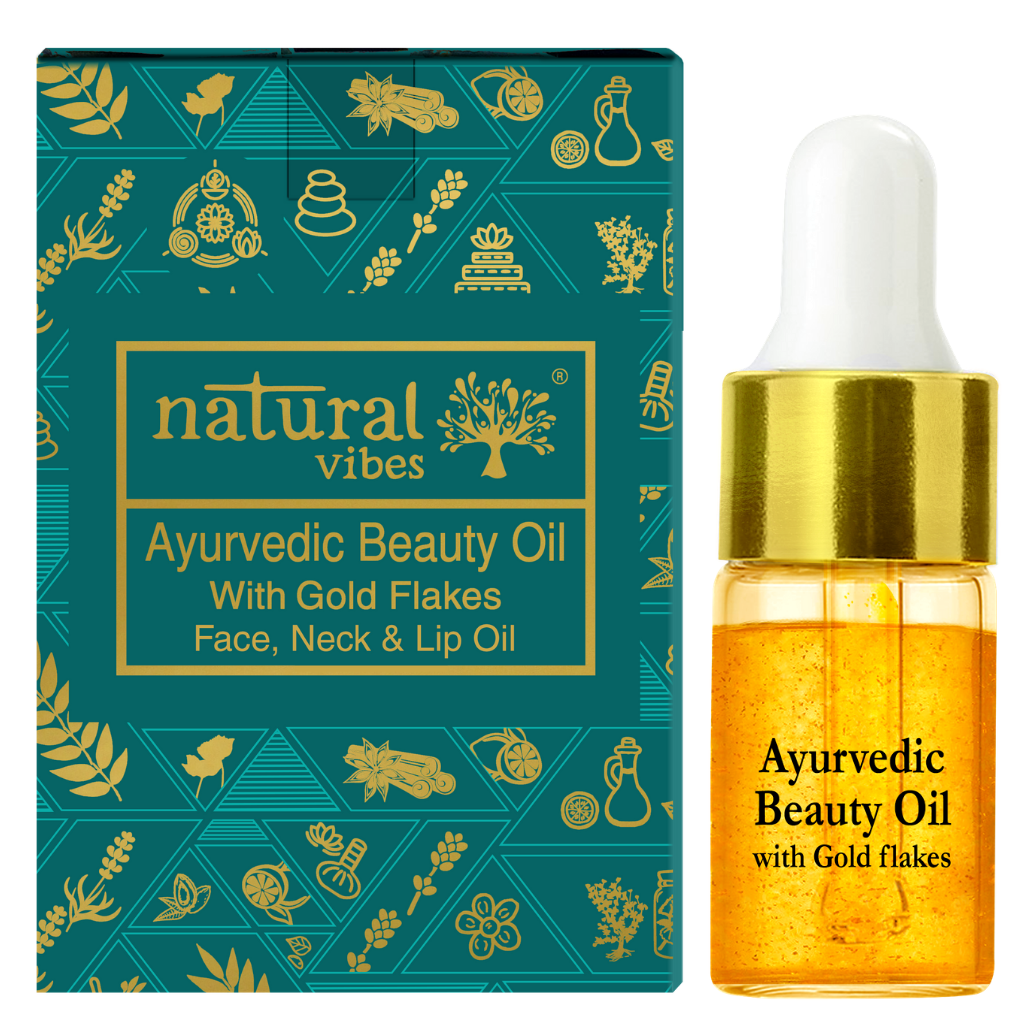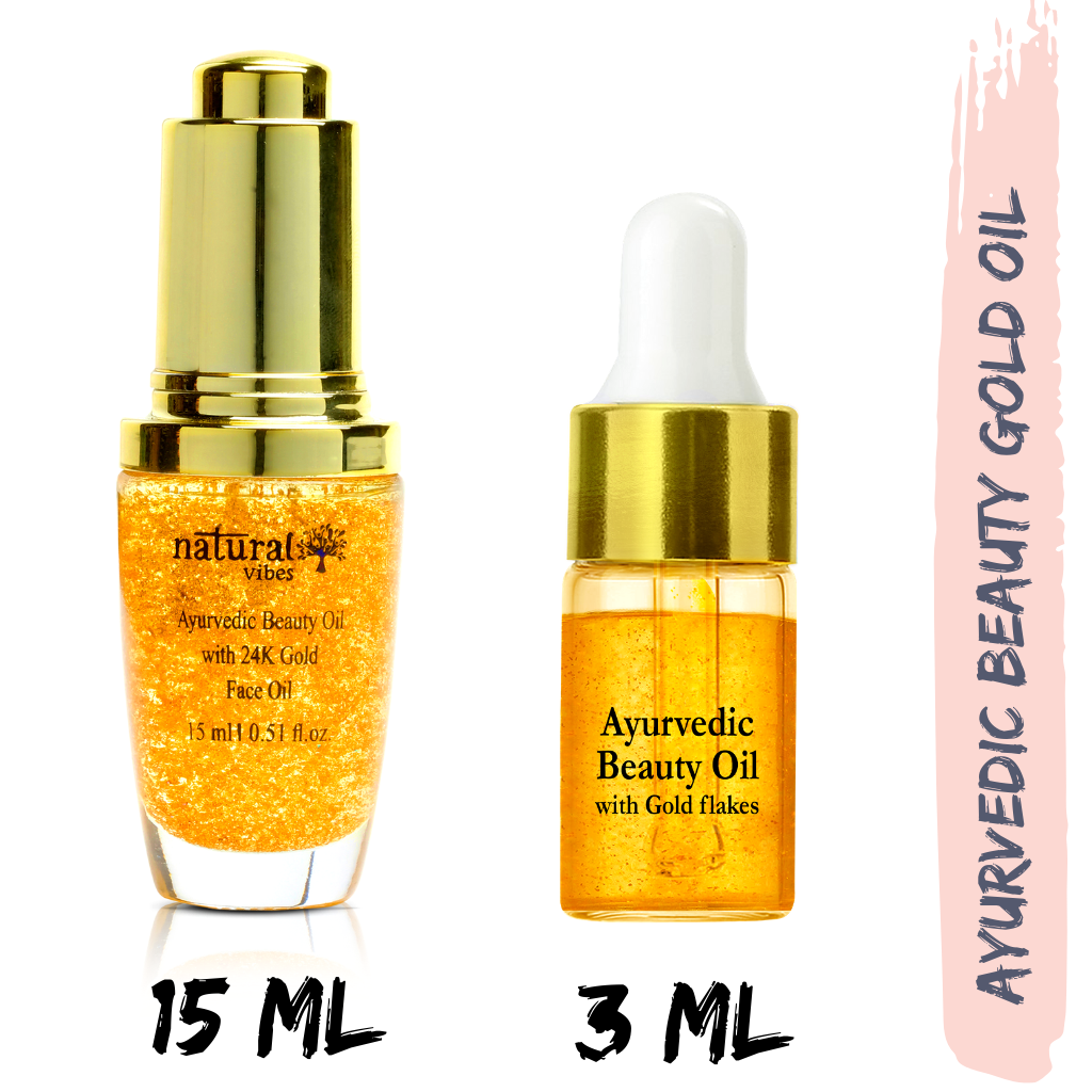 Natural Vibes Ayurvedic Beauty Oil with 24 karat gold flakes is a blend carefully formulated to address all your skincare needs. Made with ingredients that have been integral in Ayurveda for generations, this aromatic elixir is a fusion of Rosemary, Orange Peel, Tea tree, Patchouli, Chamomile, Rose, Pomegranate, Sandalwood, Lavender, Rosehip, Saffron, Lemongrass, Olives and 24K Gold Flakes.