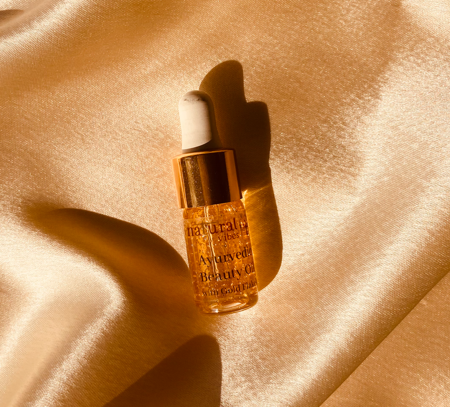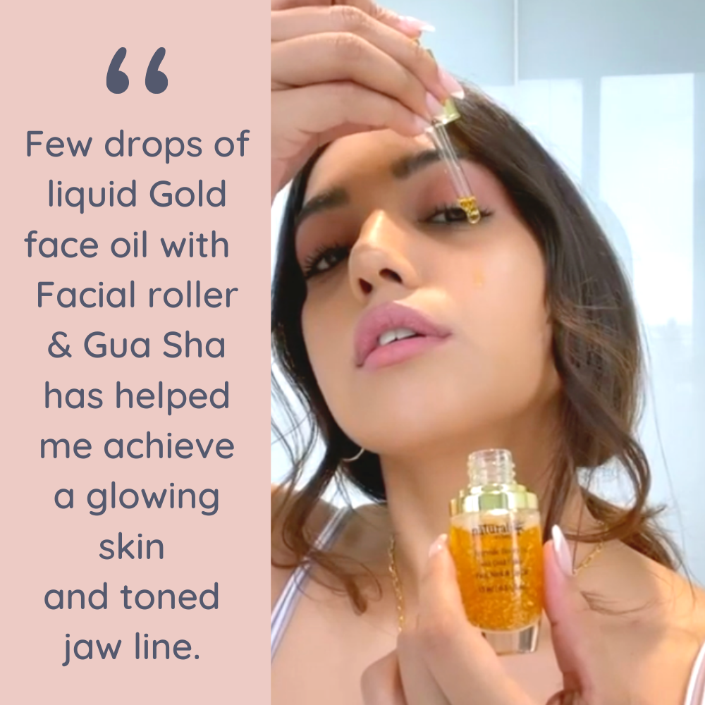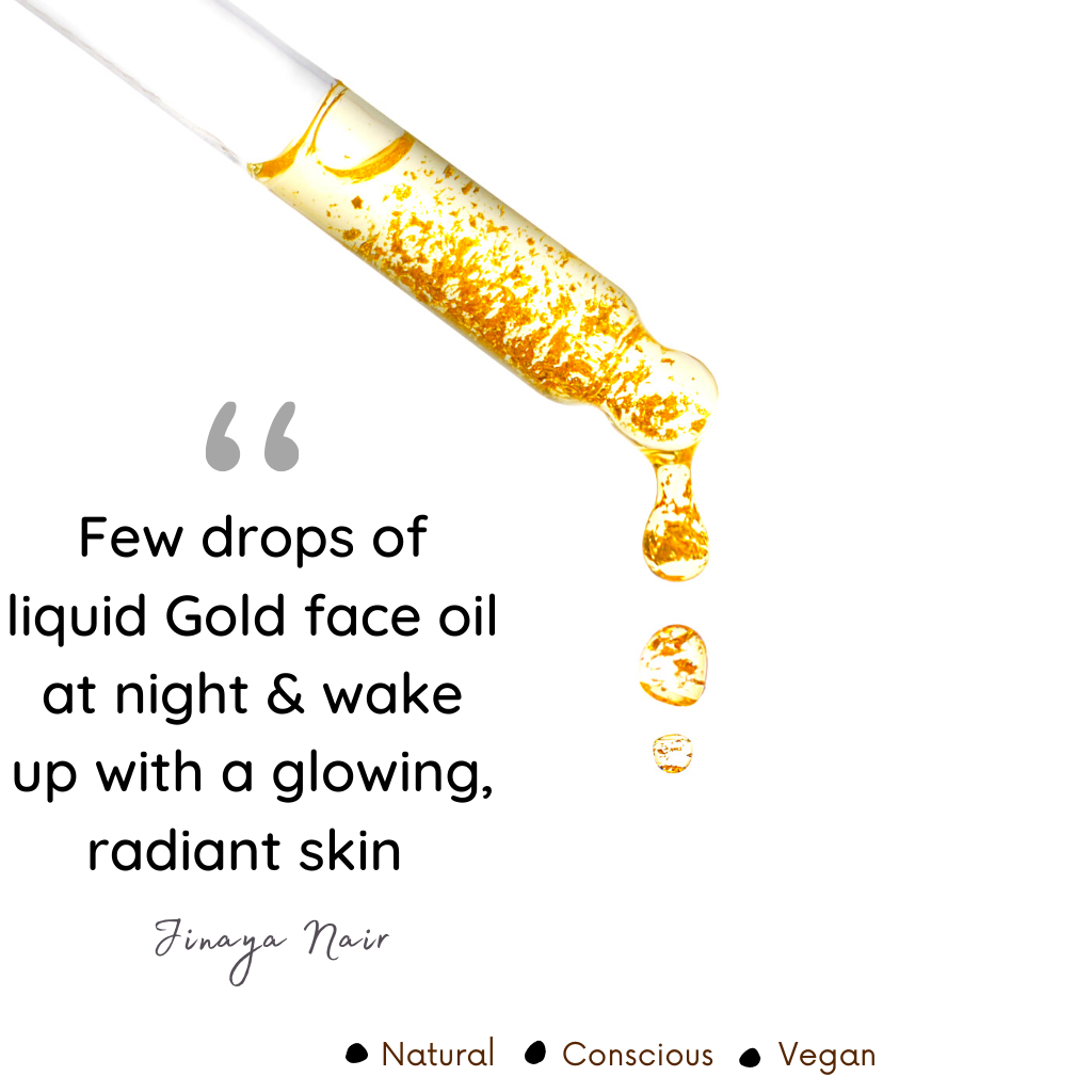 Natural Vibes Ayurvedic Beauty Oil with 24 karat gold flakes is a blend carefully formulated to address all your skincare needs. Made with ingredients that have been integral in Ayurveda for generations, this aromatic elixir is a fusion of Rosemary, Orange Peel, Tea tree, Patchouli, Chamomile, Rose, Pomegranate, Sandalwood, Lavender, Rosehip, Saffron, Lemongrass, Olives and 24K Gold Flakes.