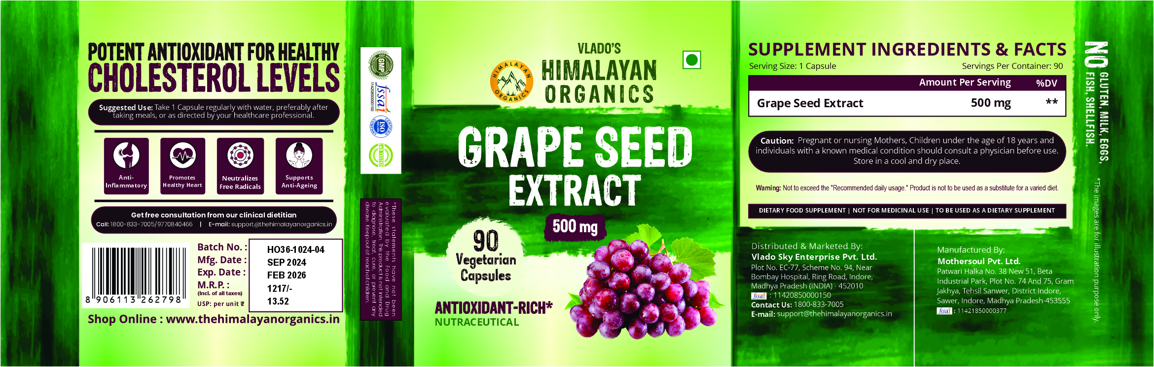 Grape Seed Extract is simply the removal, drying & pulverizing of the bitter-tasting seeds of grapes. Grape Seeds are super-rich in antioxidants including phenolic acids, anthocyanins, flavonoids, and oligomeric proanthocyanidin complexes (OPCs). Due to its high antioxidant content, grapeseed extracts protect against oxidative stress, tissue damage, and inflammation. Grape seeds are an excellent source of vitamins C & E as well as antioxidants known as flavonoids, all of which helps improve skin’s texture and act as an anti-ageing component. Himalayan Organics Grapeseed extract Capsules have rich anti-inflammatory properties that help relieve swelling due to Dermatitis, Infections, Cuts & excessive exposure to the harmful UV rays.