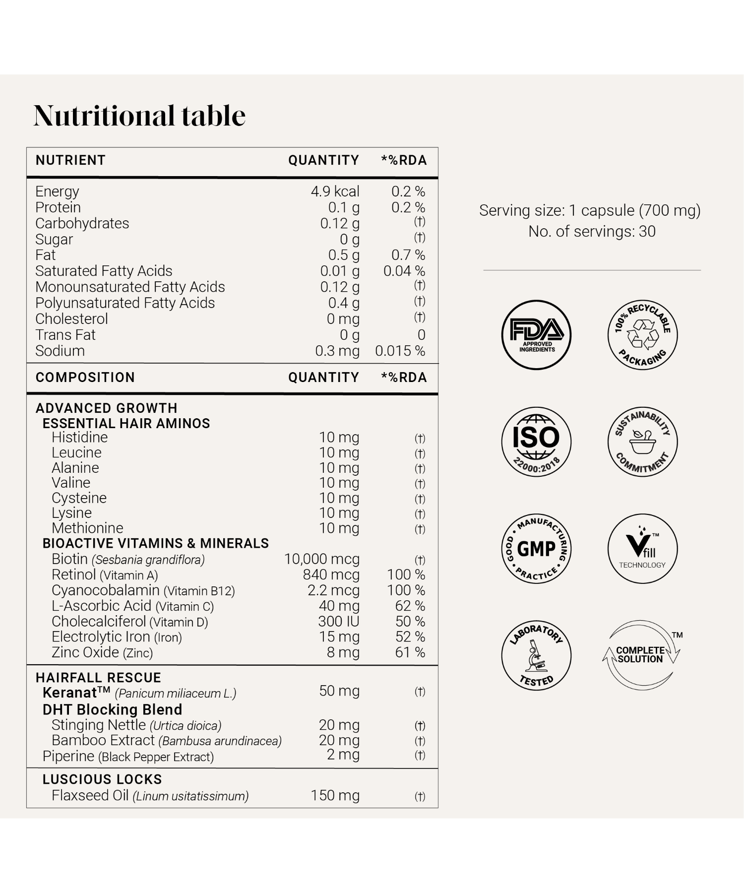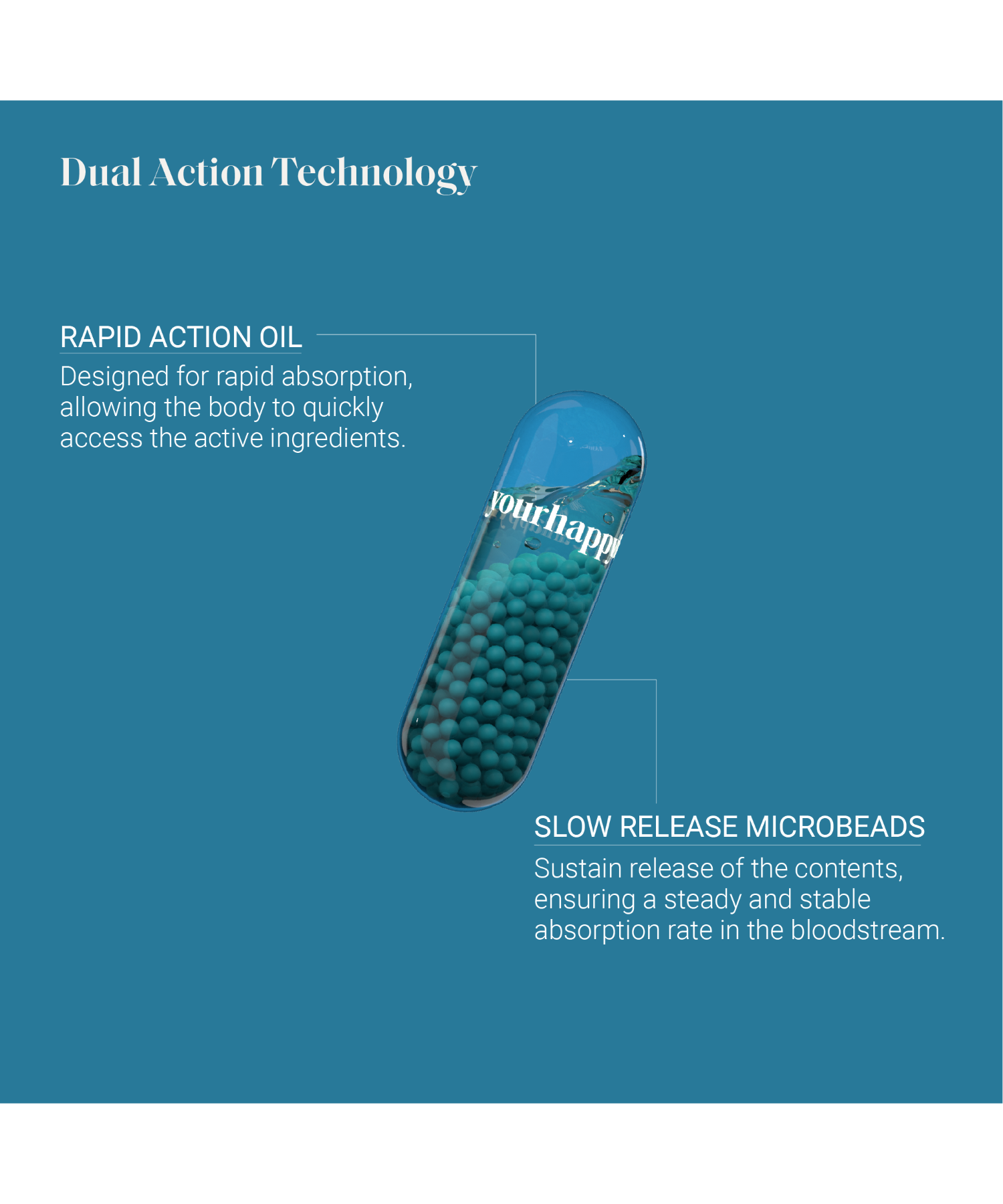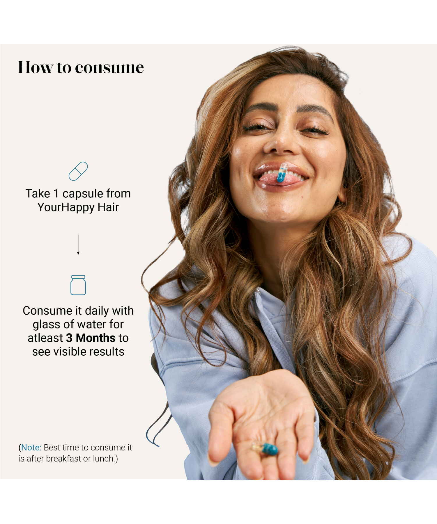 YourHappyLife Hair Capsules is a potent formulation that utilizes patented ingredient Keranat from France (clinically proven to reduce hair fall by 50%), with Essential Aminos and Natural DHT Blocking Blend in Flaxseed Oil for revitalized growth and hairfall control. From the roots, your hair is stronger and healthier. Dual action technology with slow-release microbeads that gradually release their nutrients over an extended period for enhanced bioavailability & efficacy, so that you get the best out of them. Prevents Hairfall & Breakages, Promotes Growth and Enhances Shine & Luste