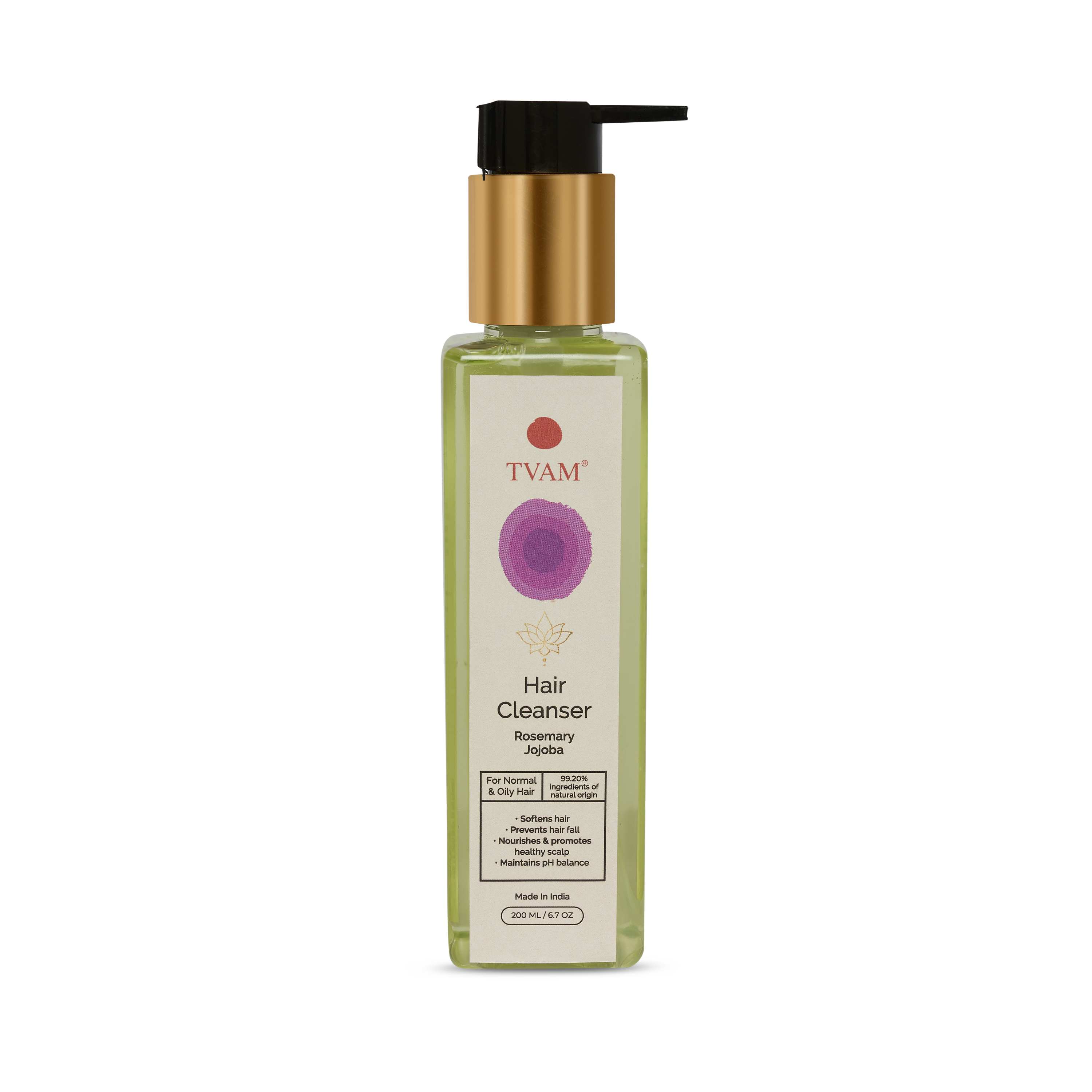 Tvam's Hair Cleanser with Rosemary and Jojoba Oil is a one-stop solution for oiliness, rough textured hair and excessive sebum production. Pamper your scalp with this comforting solution, whose rosemary oil balances sebum production and moisturizes your hair, while basil treats dandruff.