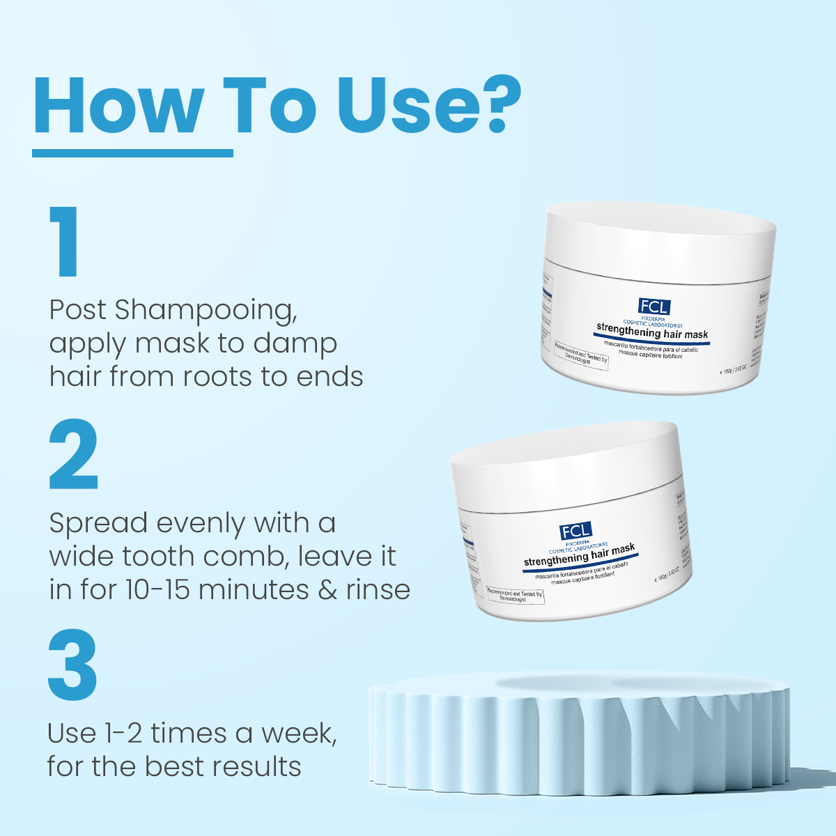 | Our Strengthening Hair Mask is a powerhouse of rejuvenation crafted for hair that needs instant revival and fortification. Formulated with a proprietary blend of proteins and 98% natural nourishing ingredients, our hair mask penetrates deeply, repairing and protecting weakened areas while providing intensive hydration. Specifically designed to breathe new life into weak and damaged hair, each application of this mask delivers a surge of strength and vitality, working on every strand to restore resilience and shine. It coats each strand, infusing it with the nutrients needed for optimal health and resilience. This strengthening hair mask is a proven formulation that visibly reduces hair fall within 4 weeks. |