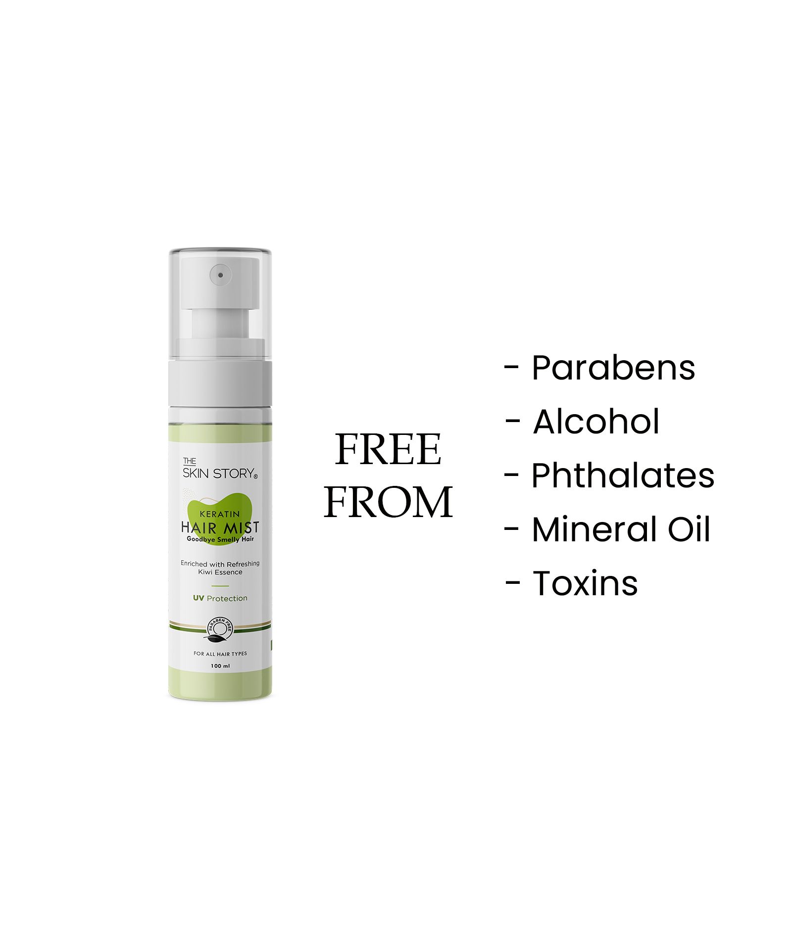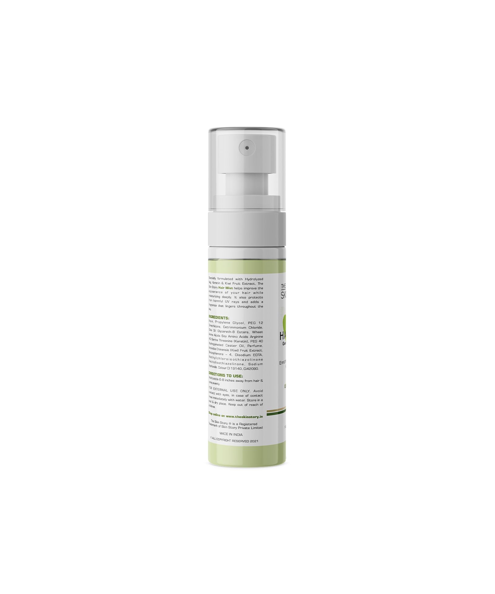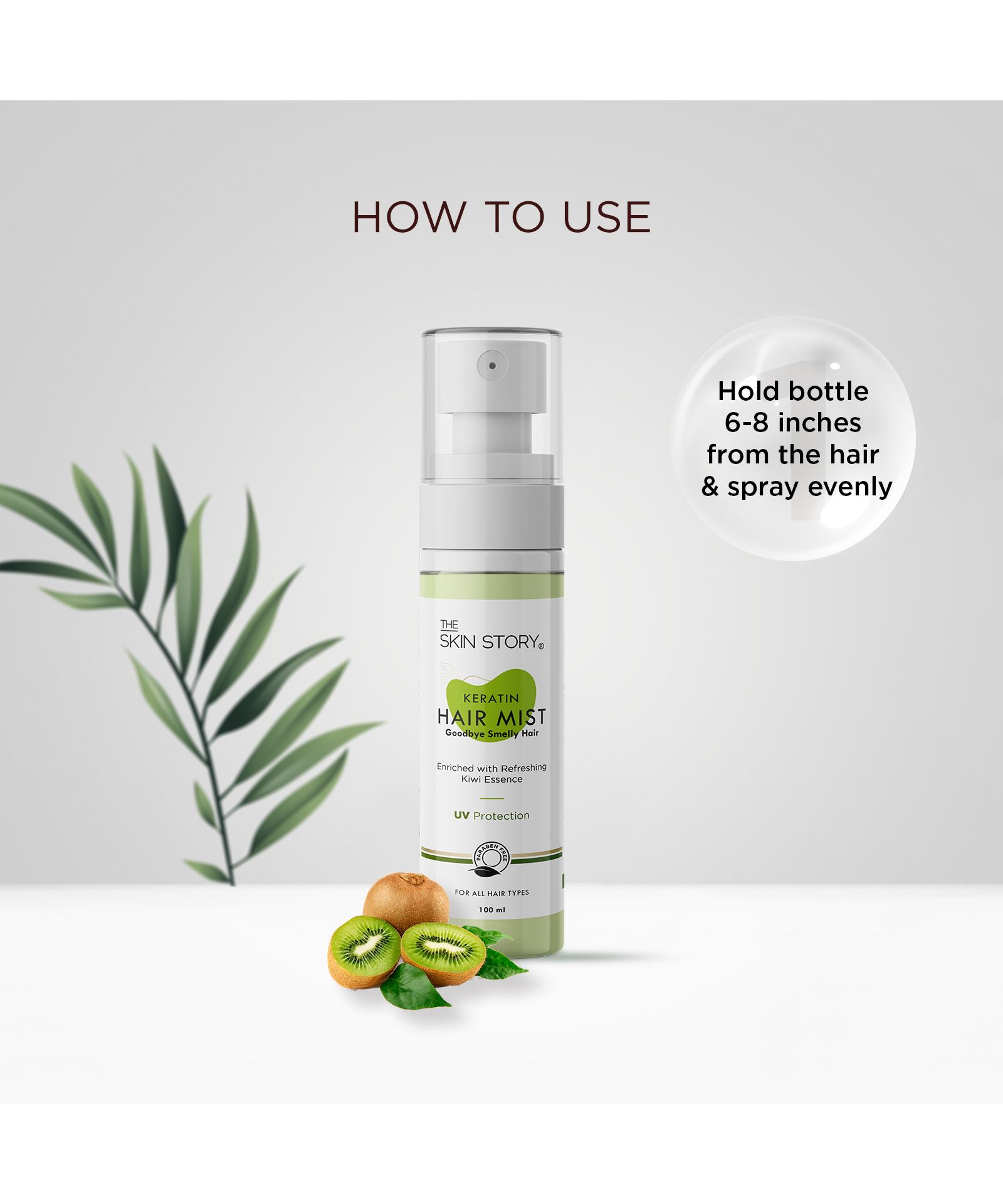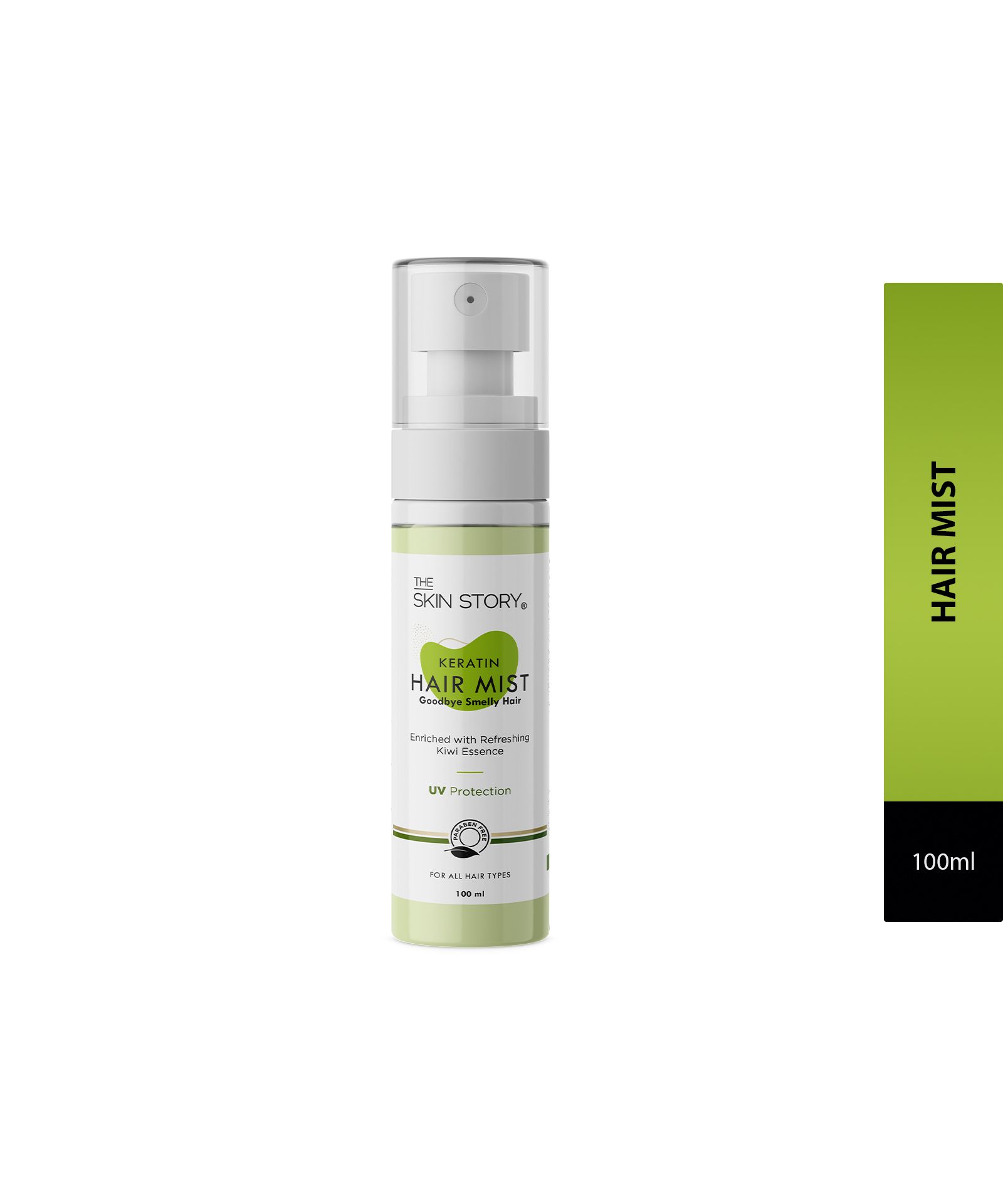 Specially formulated with all natural ingredients like Hydrolyzed Veg. Keratin & Kiwi Fruit Extract, The Skin Story Hair Mist helps improve the appearance and texture of your hair while moisturizing deeply. It detangles frizzy hair leaving behind smother and glossier tresses. It also protects from harmful UV rays.