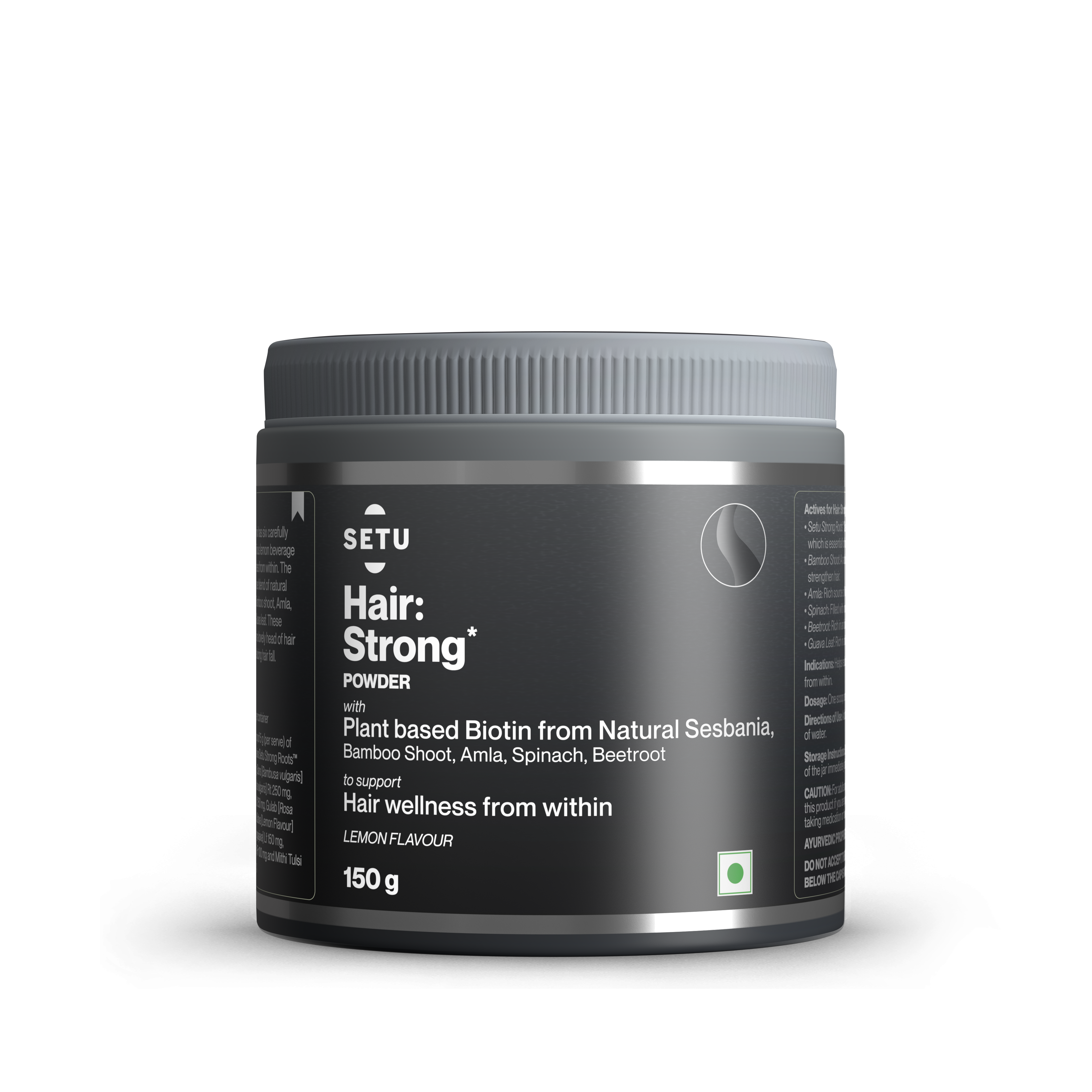 Hair: Strong Powder mix has six carefully chosen actives in a delicious lemon beverage that promotes hair wellness from within. The beverage mix has a unique blend of natural extracts like sesbania bamboo shoot, amla, spinach, beetroot and guava leaf. These activities can help maintain a lovely head of hair by aiding growth and reducing hair fall.
