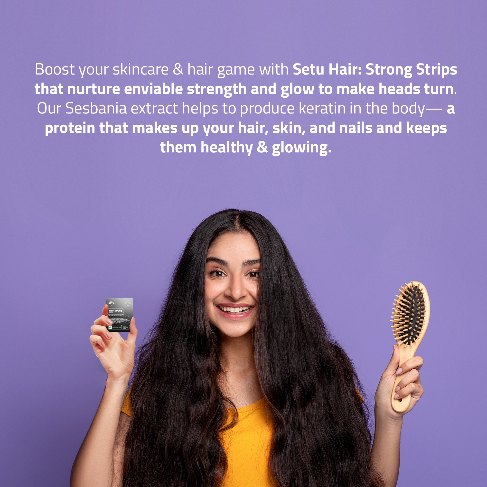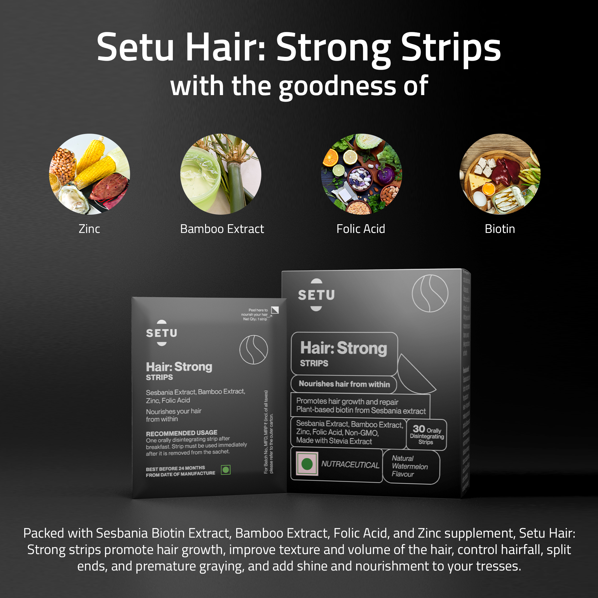 REPLACE TABLETS WITH STRIPS: Make every hair flip fabulous with Hair: Strong Strips that's a new & improved way of taking nutrition to improve your hair & scalp health. These strips are more bioavailable which means they absorb *more* ingredients in the body than traditional capsules pills and gummies.GROW LONG STRONG & THICK HAIR: Packed with Sesbania Biotin Extract Bamboo Extract Folic Acid and Zinc supplement our strips promote hair growth improve texture and volume of the hair control hairfall split ends and premature graying and add shine and nourishment to your tresses.