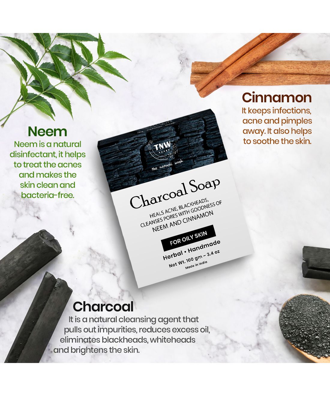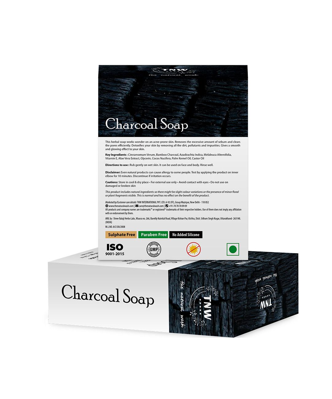 TNW-The Natural Wash Charcoal Soap bar has a unique blend of activated charcoal, neem, cinnamon, castor oil, aloe vera extract and glycerin which help to deal with all kinds of oily skin problems. Activated Charcoal plays a vital role in purifying the skin. It pulls off all the impurities from the skin like a magnet; cleanses it to the core, thereby allowing it to breathe freely. It unclogs the pores of the skin and helps to remove all the dirt and pollutants from it that we unknowingly absorb in our daily life. This, Paraben and Sulphate free, natural charcoal soap helps with blackheads, whiteheads and effectively cleans impurities from the skin naturally. This exclusive handmade charcoal soap bar serves as the anti-pollution soap and is safe to use on both the face and the body.