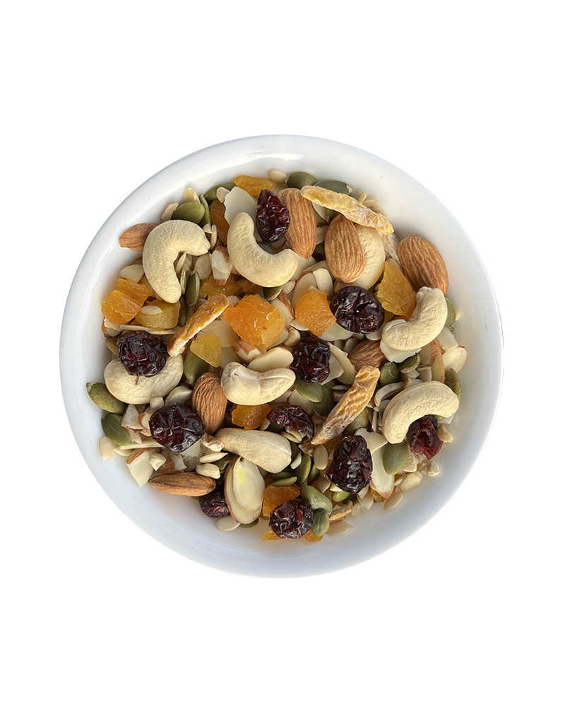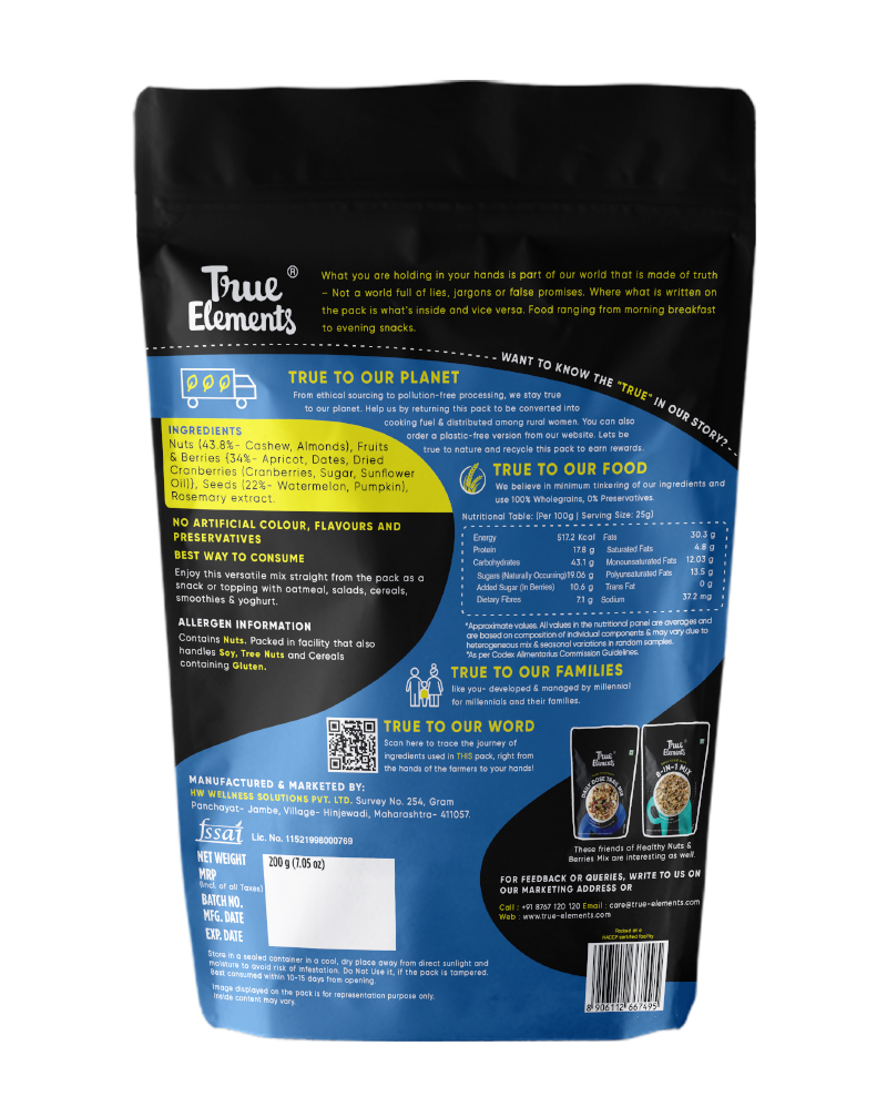 Make snacking time fun & guilt-free with True Elements Healthy Nuts & Berries Mix! A filling & portable snack which will give your tongue a burst of different flavours. Enjoy the sweetness of dried dates, perfectly dry roasted almonds, and the tanginess of cranberries & apricots along with crunchy dry roasted seeds, all together in a mix to give you the perfect mouth-watering, guilt-free snack. The nutrient-dense ingredients will provide you with essential vitamins & minerals like zinc, vitamin E, magnesium, and B Complex vitamins. This premium assortment of fibre & protein-rich Nuts & Berries will give you multiple health benefits while satisfying your hunger pangs