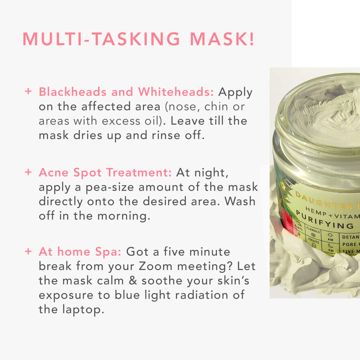 - Combined with Volcanic Earth (Bentonite), Kaolin, and Fuller’s Earth, the mask works to draw out excess oil, and washes off daily pollutants defending against ‘maskne’.