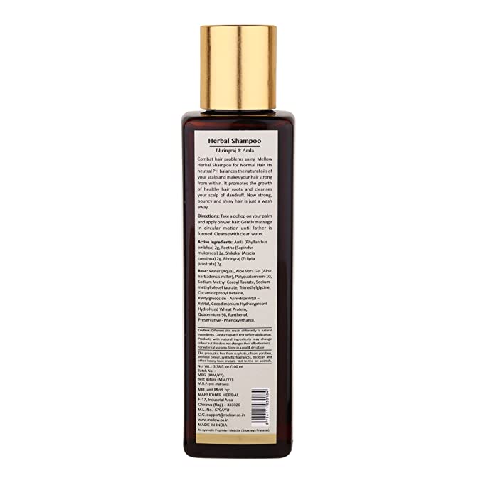 Make your hair strong and healthy with one-stop solution for all your hair related problems. Mellow Herbal Shampoo gently restores the natural oils of your scalp with its neutral PH balance property and effectively helps to remove dandruff. Restore strength, bounce and shine in your hair with Mellow Herbal Shampoo for normal hair. Made from Bhringraj and Shikakai it has a neutral PH which helps to balance scalp oils and promote the growth of healthy hair follicles. The anti-inflammatory properties of Amla to reduce dandruff and itchiness. Reetha helps to moisturise your scalp for a lustrous look to your hair. Now with Mellow, the strong, bouncy and shiny hair is just a wash away.