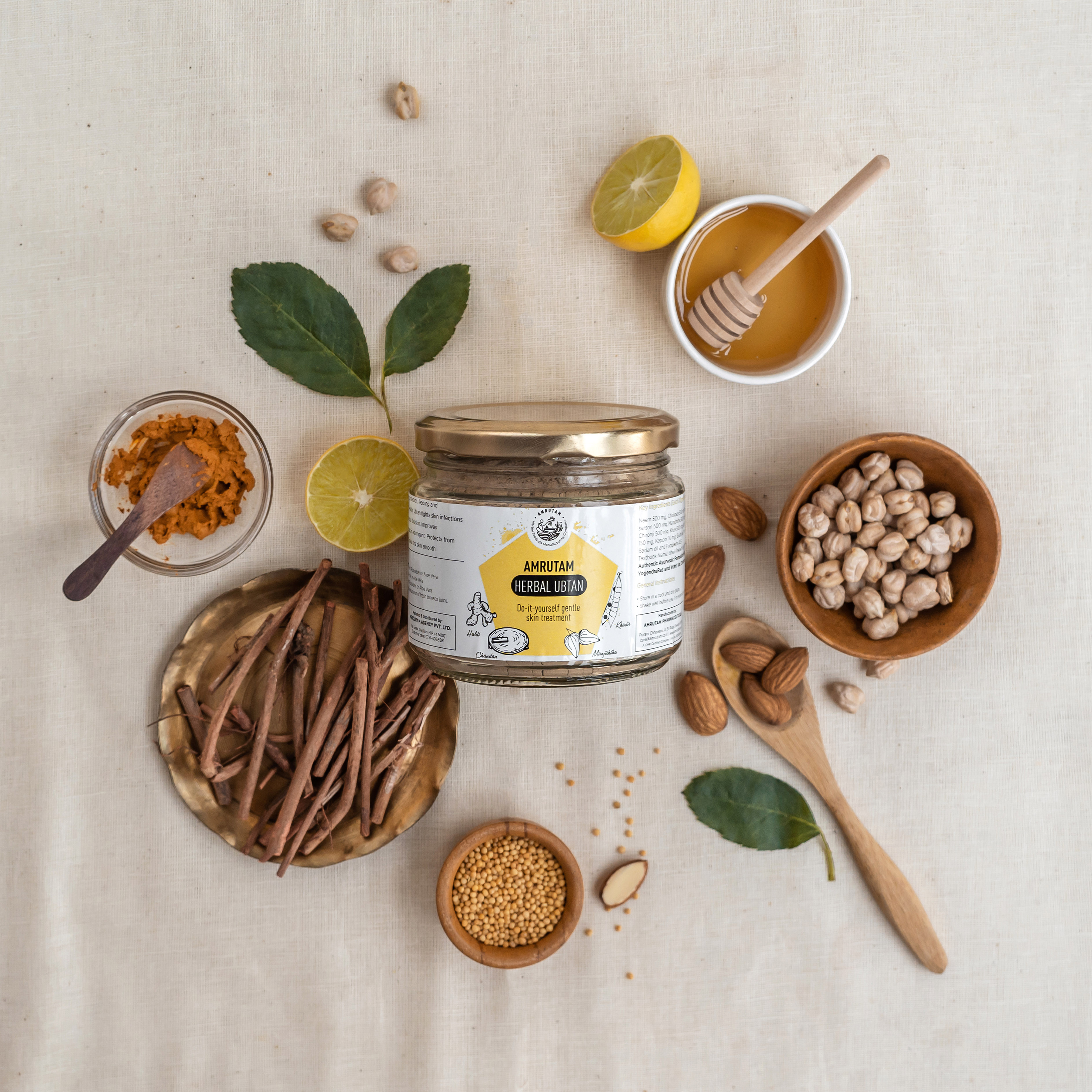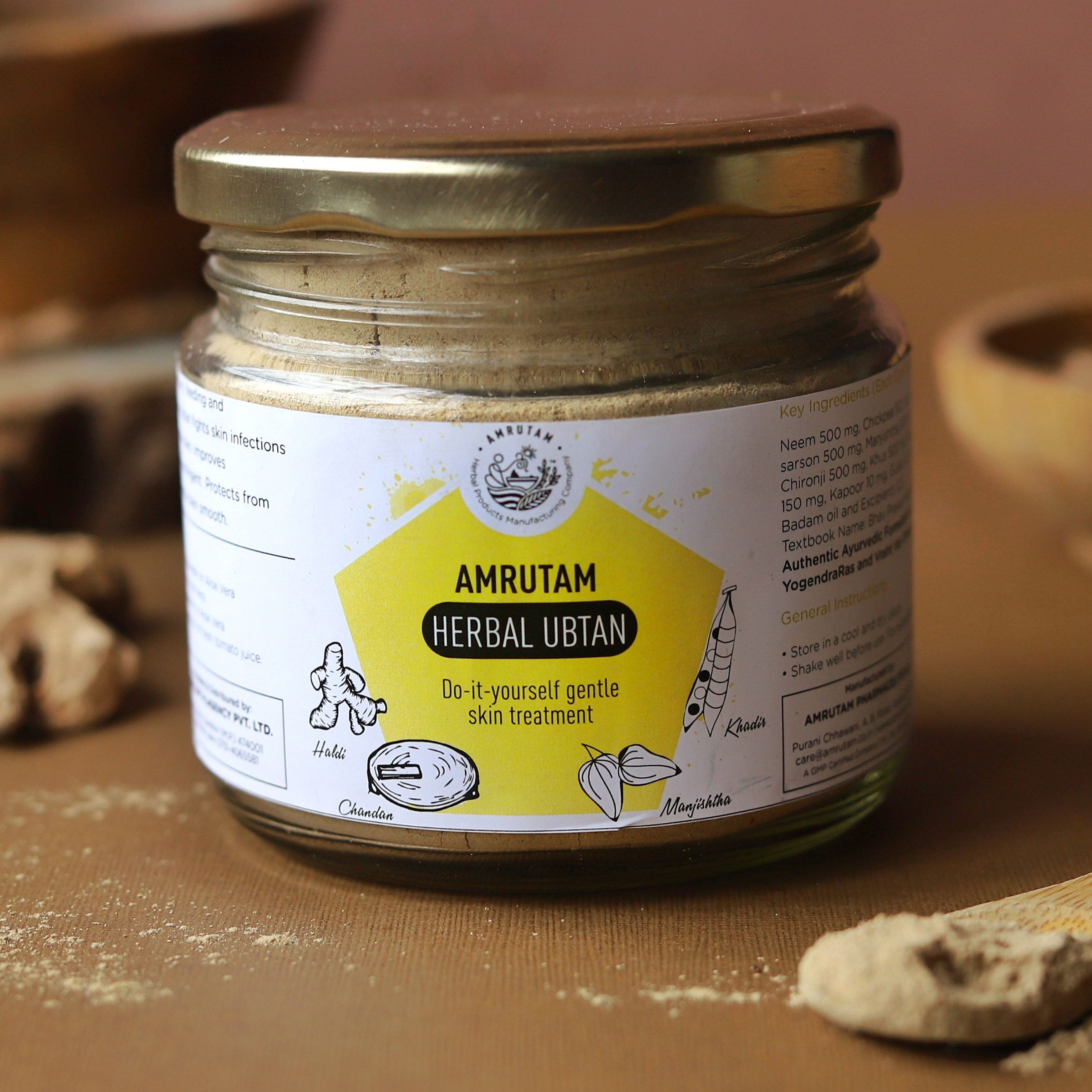 Amrutam Herbal Ubtan uses a 100% herbal formula made of Haldi, Chandan, Manisha, and Khadir to protect and nourish the skin. fIt helps exfoliate dead skin cells, reduce facial hair and maintain overall skin health. This Vedic recipe is also used for protection, smoothening, nourishment, and beautification of the skin protecting it from acne and freckles.