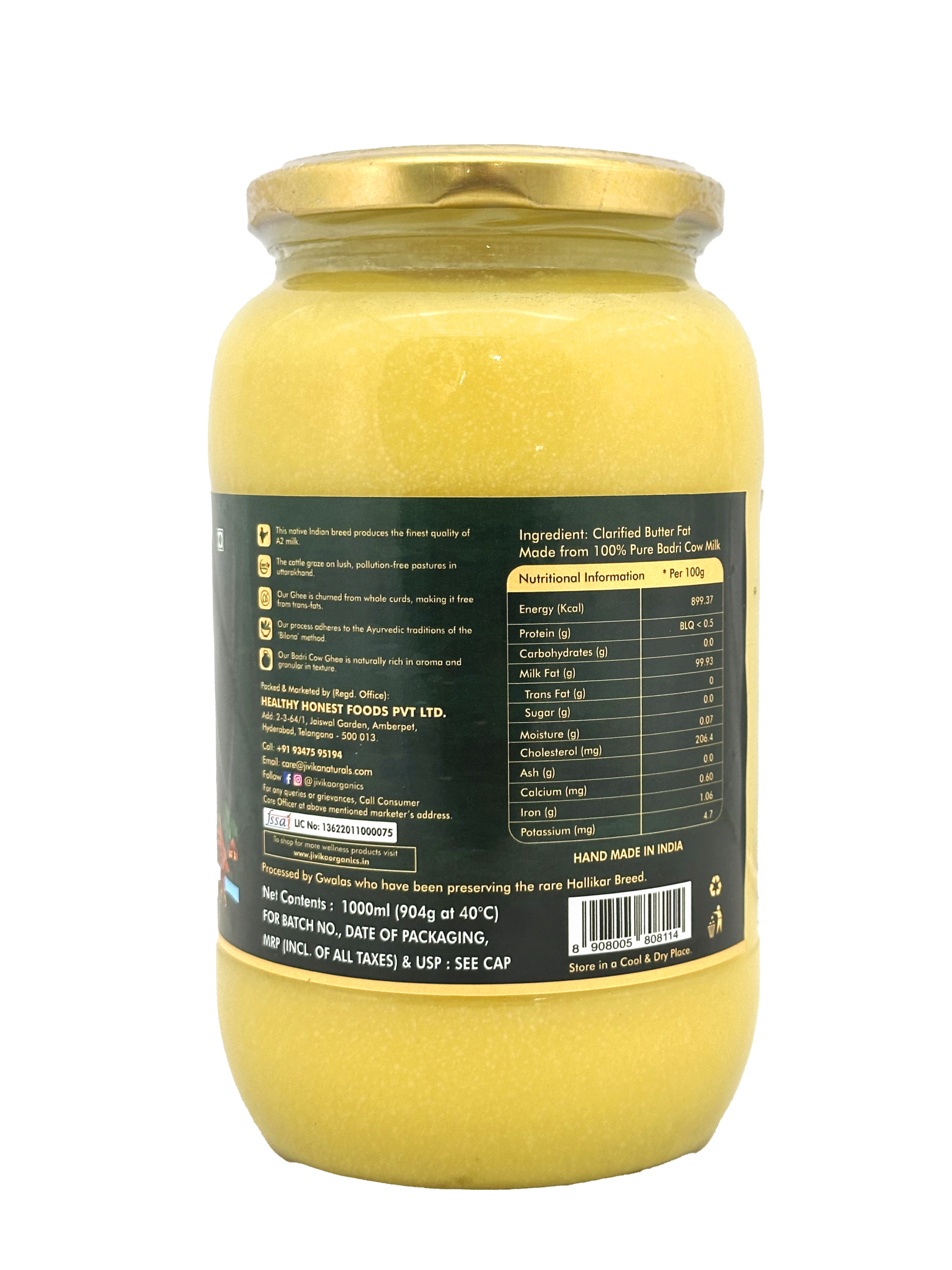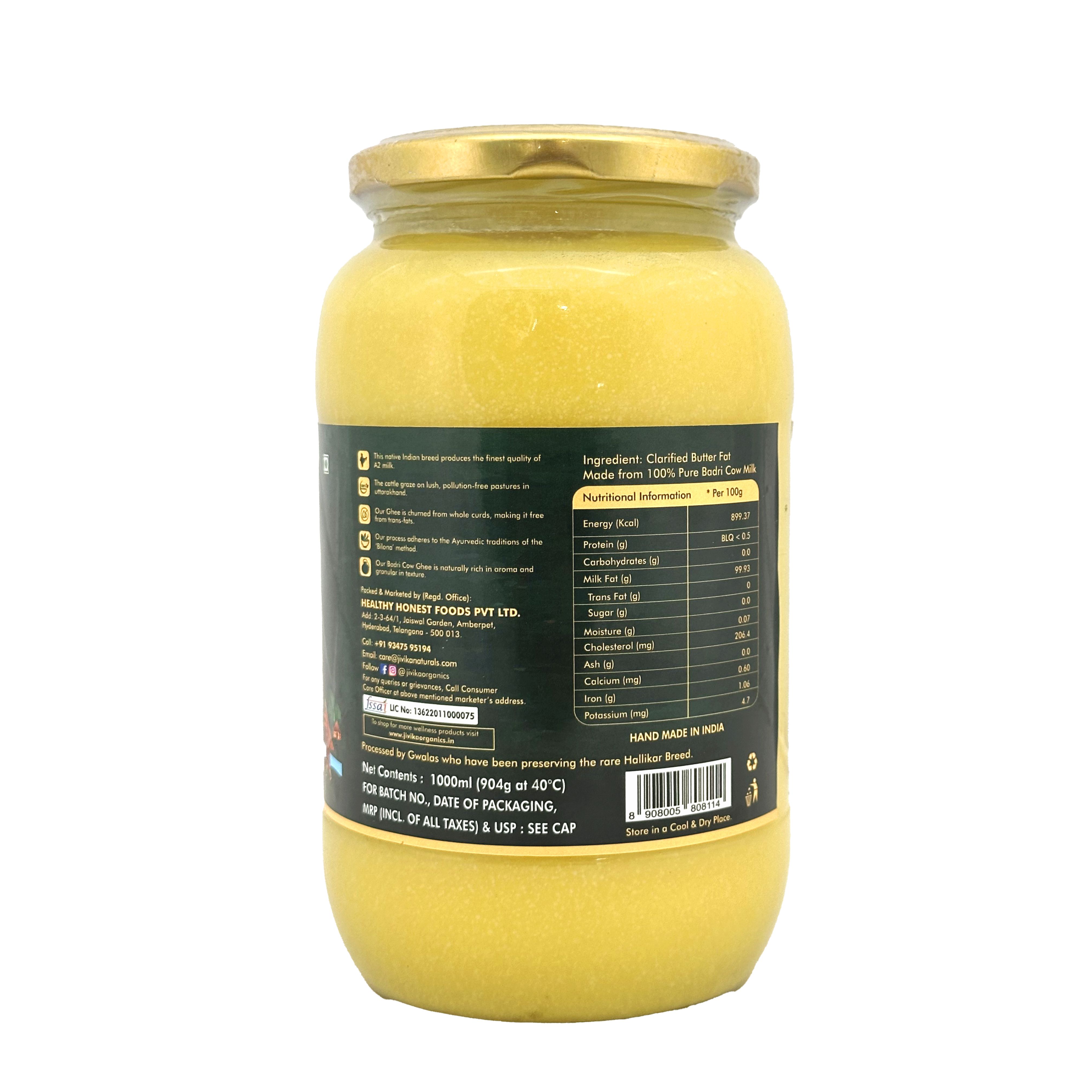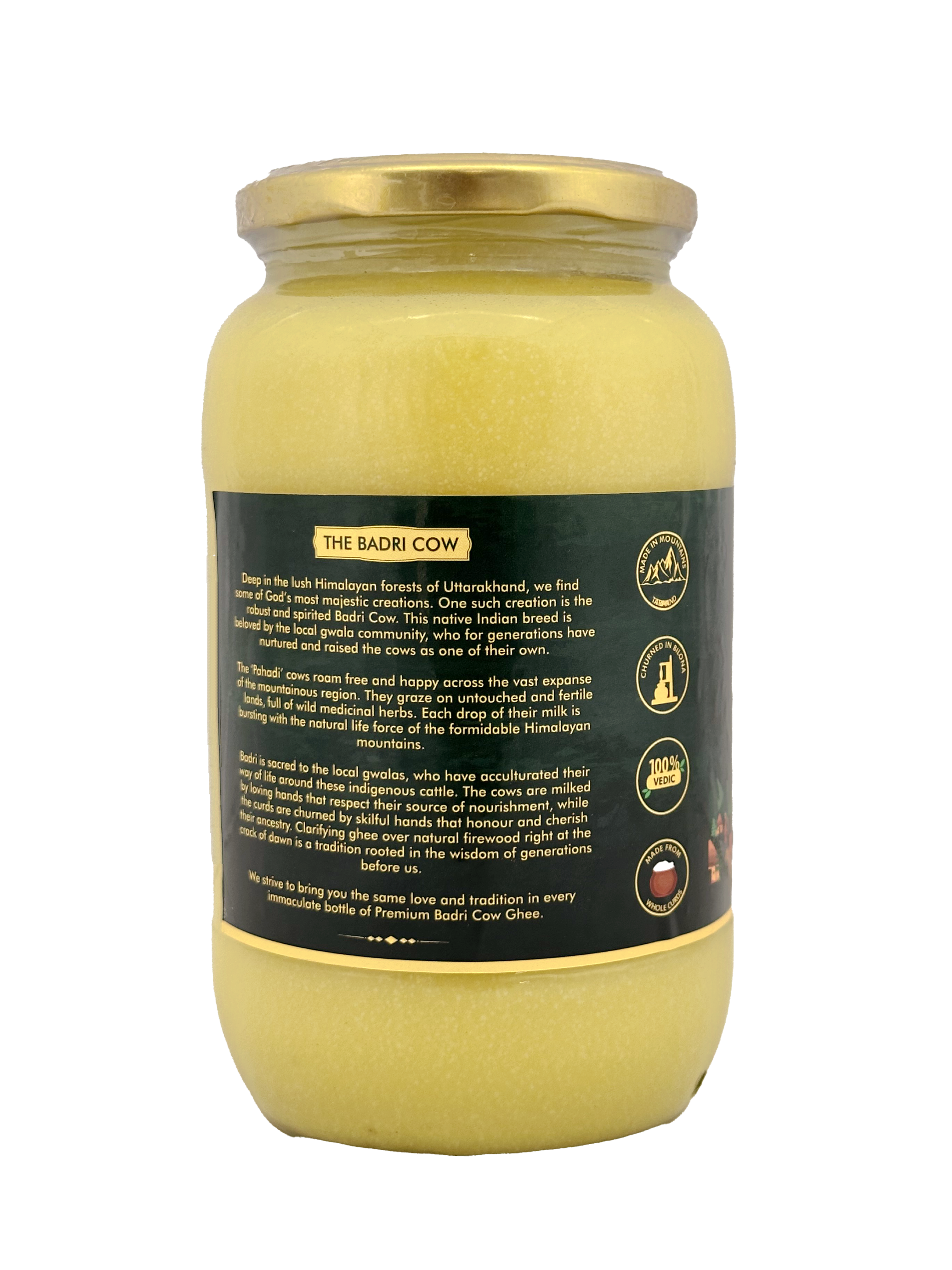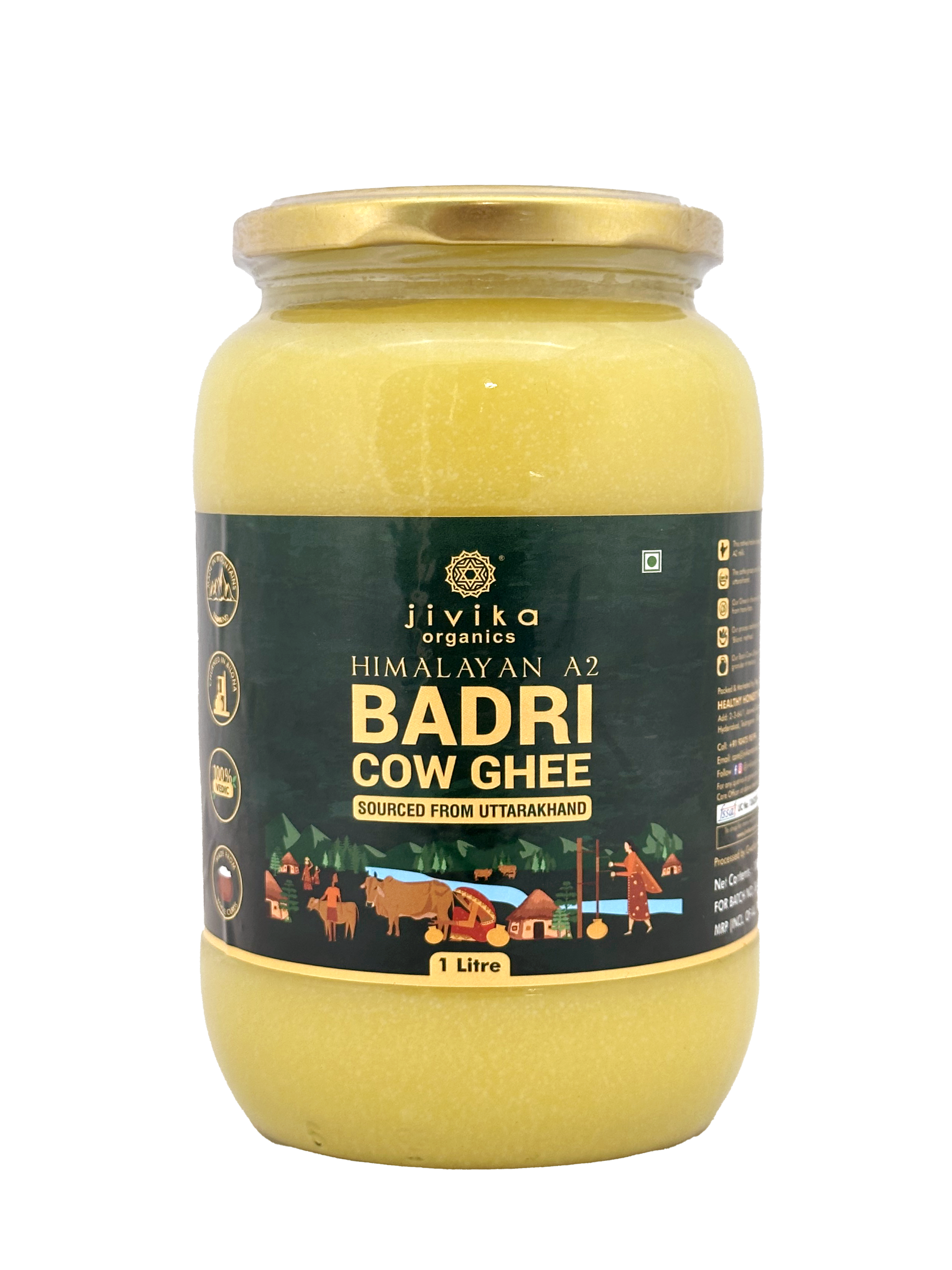 Handcrafted by the native gwalas of Uttarakhand, Jivika Organics A2 Badri Cow Ghee is rich with all the Ayurvedic benefits of traditional Bilona ghee. Churned from the nutritious Whole Curds of A2 Badri Cow Milk, this ghee is free from harmful trans fats and cholesterol. Each drop of Bhadri Cow Ghee is made with the principles of Purity and Authenticity above all.Jivika Organics Himalayan A2 Badri Cow Ghee is made by native gwala communities in Uttarakhand. The Sacred Badri Cows receive the utmost care and attention from the gwalas, and the same goes for each drop of our ghee.Our Ghee is churned in earthen pots in the traditional bilateral method, ensuring quality and purity in every bottle we produce. This method produces the finest grade of nutritious ghee with zero compromise on taste.Badri Cow Ghee is rich in omega-3 and omega-9 fatty acids along with an abundance of antioxidants. It also has a diverse vitamin content of vitamins A, C, D, E and K.