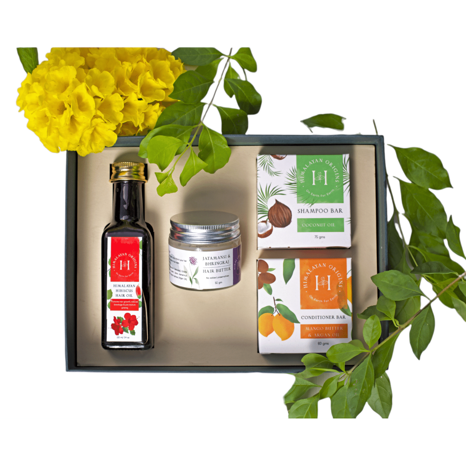 This Combo contains - 1.Himalayan Hibiscus Hair Oil: he Himalayan Hibiscus Hair Oil comes packed with the goodness of nature and may help reduce hair fall, hair breakage, promote healthy hair growth and also reduce premature greying. 2.Jatamansi & Bhringraj Hair Butter: This potent butter will leave your hair soft, nourished and deeply conditioned. 3.Coconut Oil Shampoo Bar: Coconut Oil Shampoo Bar is packed with the goodness of cold pressed coconut oil and hydrolyzed silk extract to give you highly nourished and smooth hair. 4.Mango Butter & Argan Oil Conditioner: his bar will help reverse the damage caused by years of chemical treatments and environmental stress that the hair has been exposed to.