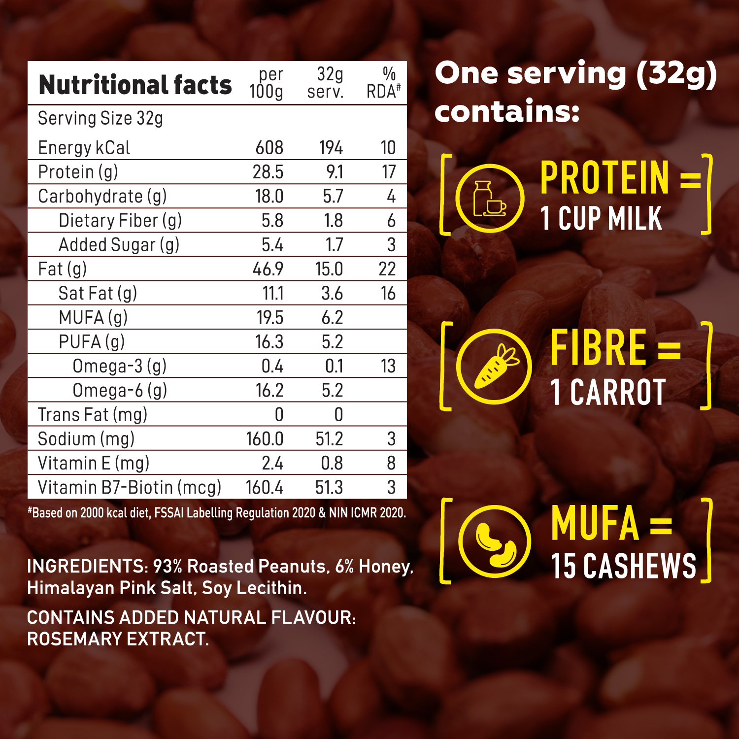 Introducing Yogabar Honey Roasted Peanut butter- the healthiest Nut Butter to give your mornings a nourishing kickstart. Its made with 100% premium peanuts only, slow-roasted and slow ground to give a smooth & creamy texture like no other. Its Gluten-Free, Vegan, Made from NON-GMO Peanuts and contains no added sugar. Don't you love starting the day with something delicious, nourishing, and filled with only the good stuff? It is highly nutritious, dairy-free, no added sugar, vegan, keto-friendly, zero added salt. Also, it is 100% natural and no preservatives or artificial sweeteners.