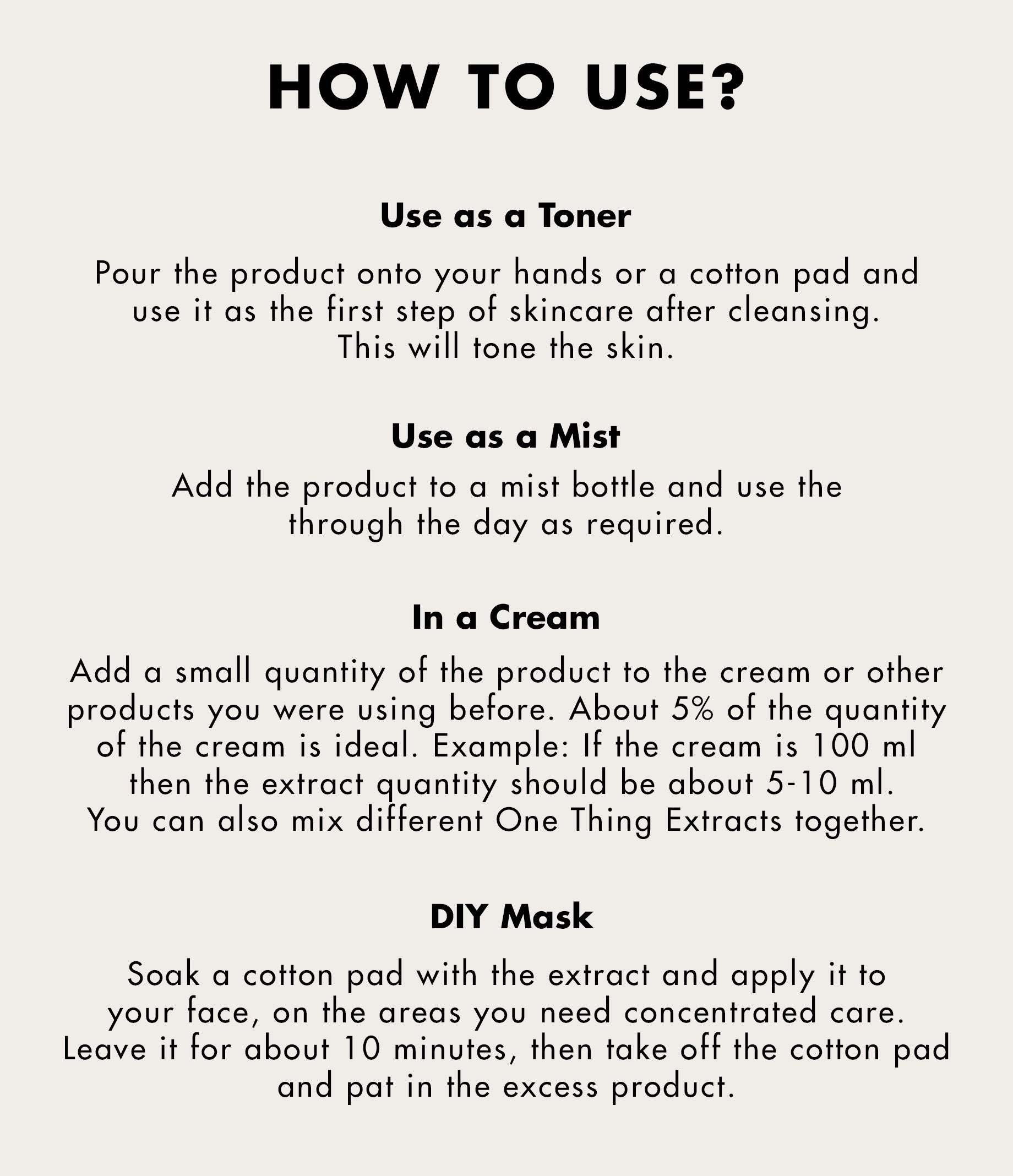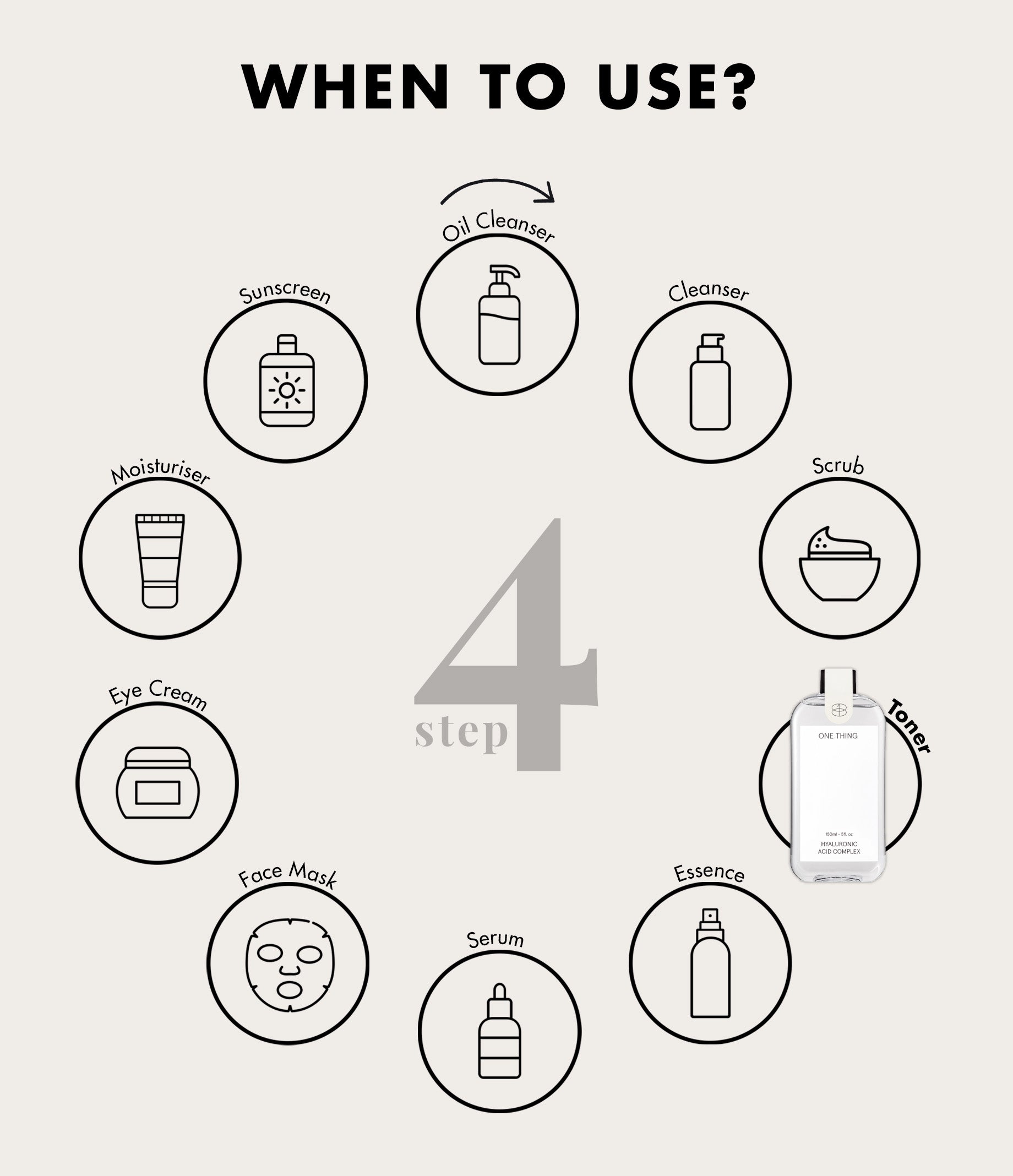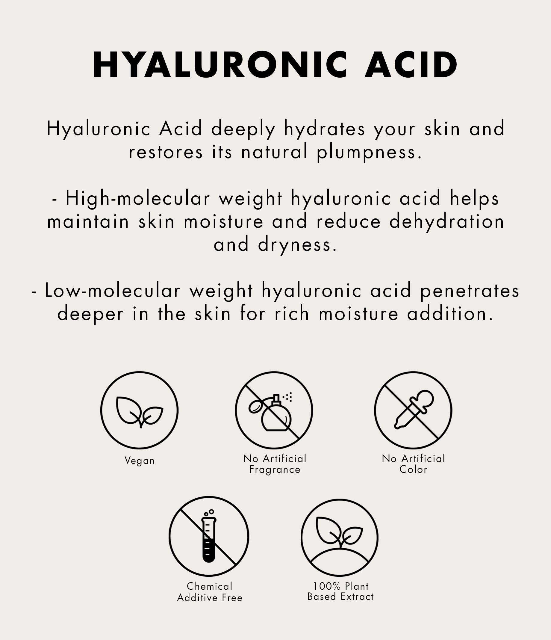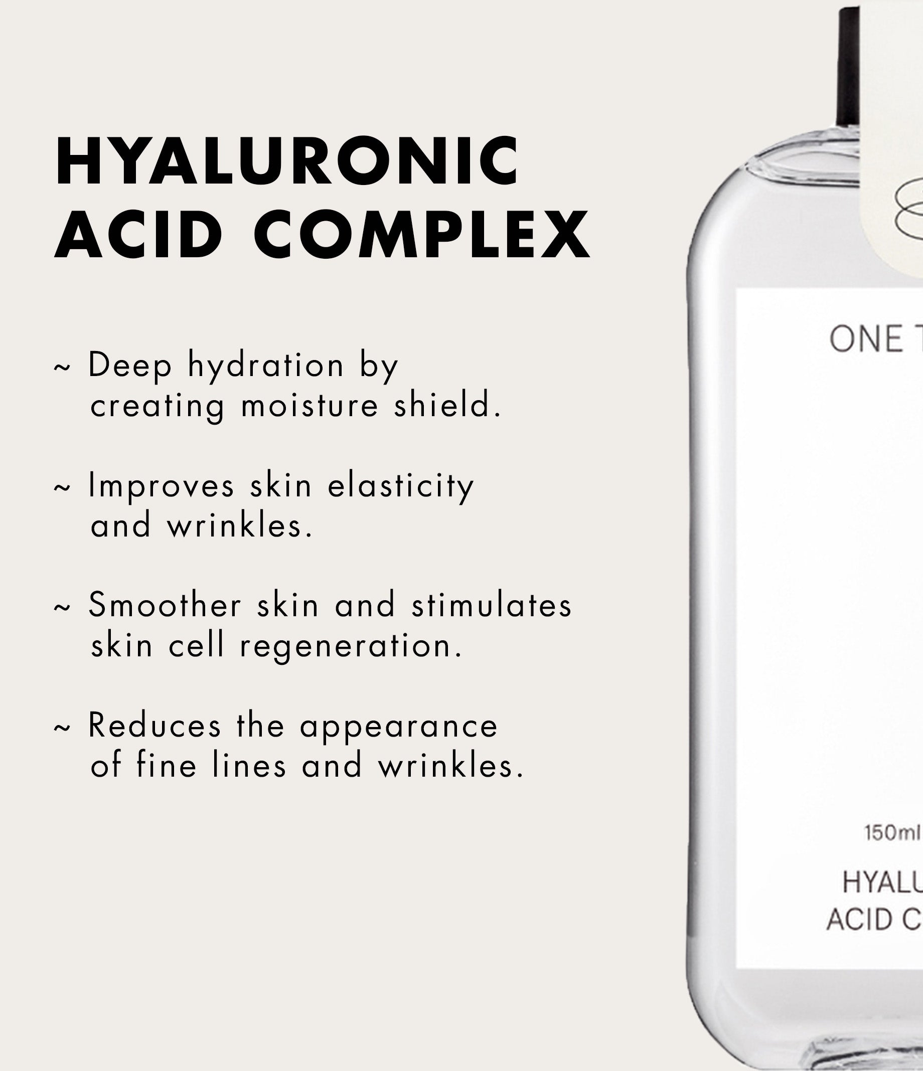 The ONE THING Hyaluronic Acid Complex is formulated using only 100% EWG green-rated raw materials, derived from vegetables. It does not use any artificial additives and is also even produced by our own bodies. With the consistency of an essence, the Hyaluronic Acid Complex can be used by all skin types to restore the skin's natural moisture levels. Hyaluronic Acid penetrates deep into the skin as the Complex uses a combination of low and high-weight hyaluronic molecules to draw moisture into the skin and provide it with rich hydration. Due to Hyaluronic Acid's ability to draw up to 1000 times its own weight in water, it leaves the skin well moisturized from the inside out. The Hyaluronic Acid Complex leaves the skin looking smoother, more plump, and supple; reducing the appearance of fine lines and wrinkles.