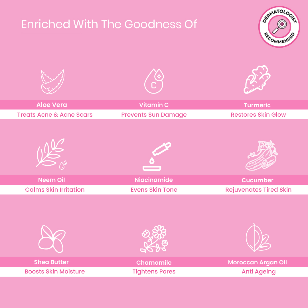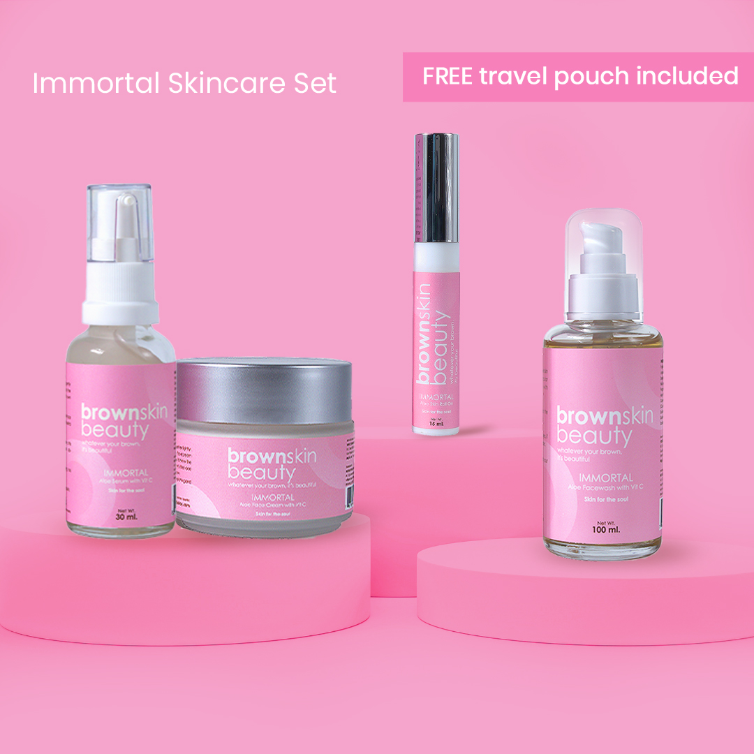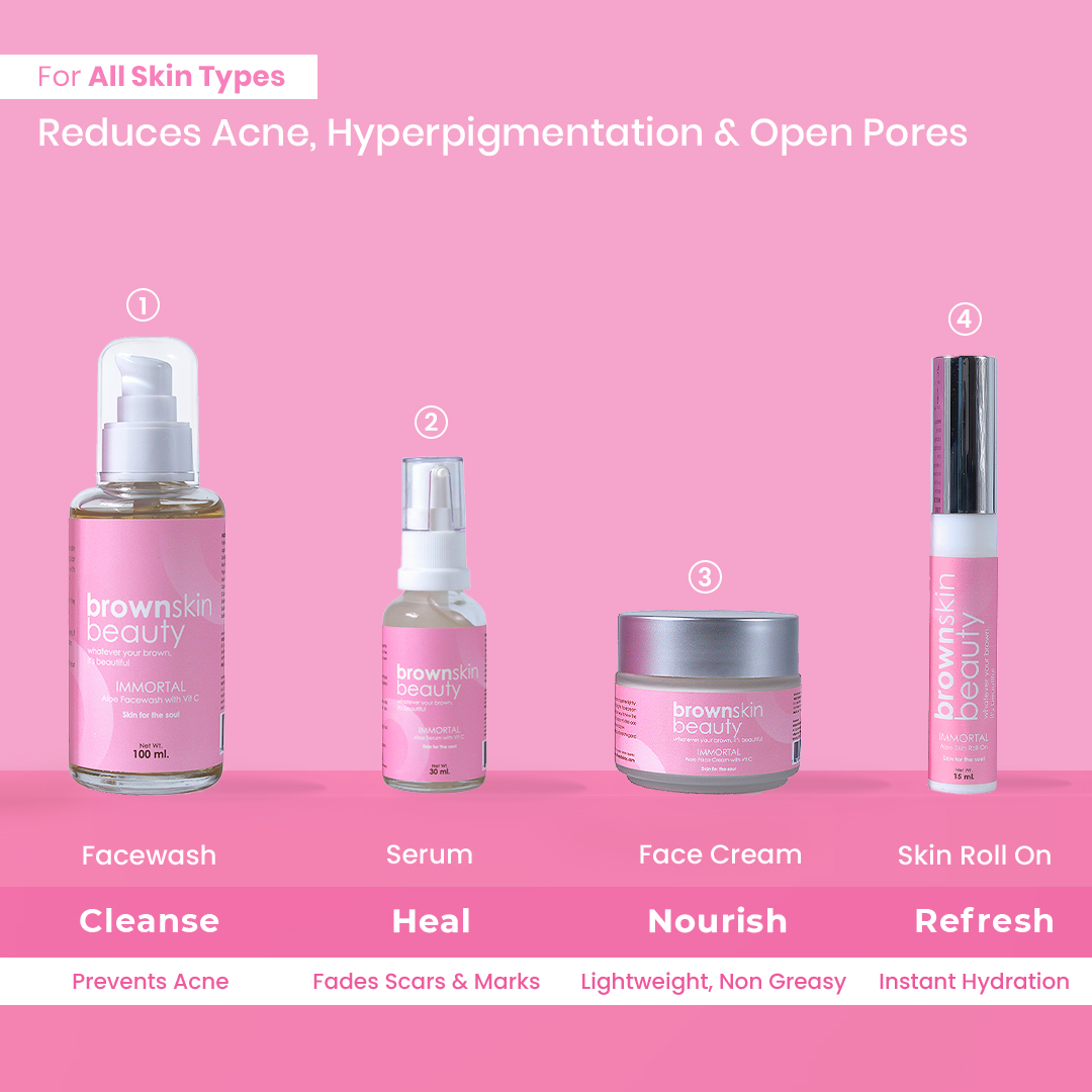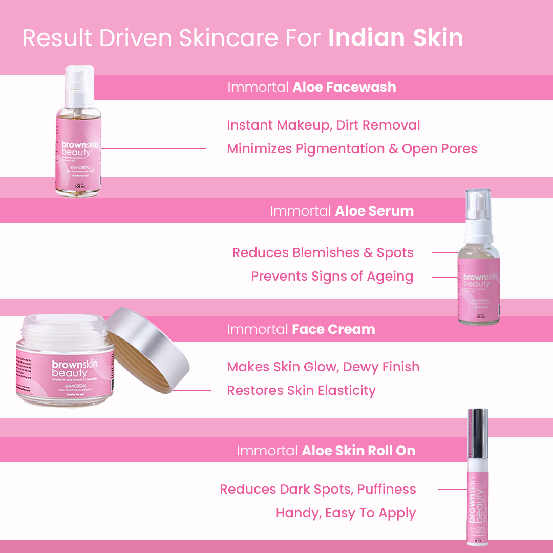 This product contains Immortal Aloe Face Cream, Immortal Aloe Facewash, Immortal Aloe Serum, Immortal Aloe Skin Roll On and BSB Travel Pouch. It works great for all skin types and helps rejuvenate & heal your skin, reduces dryness & dull spots, reduces sun damage & wrinkles and also has amazing anti-inflammatory properties.