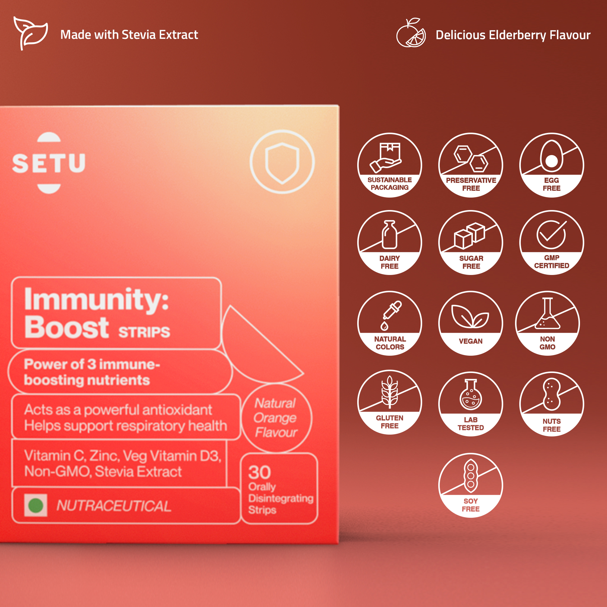 GOODBYE PILLS HELLO STRIPS: Heres a hard pill to swallow: You dont have to anymore! Introducing Immunity: Boost Strips that provide an easy way to take your daily nutrition. Just place a strip on your tongue and let it dissolve. Best part? It gets to work in 15 seconds!SUPERCHARGE YOUR IMMUNITY: Falling sick too often? Our power-packed formula with Vitamin C Vitamin D3 and Zinc has anti-inflammatory properties to fight against seasonal ailments.