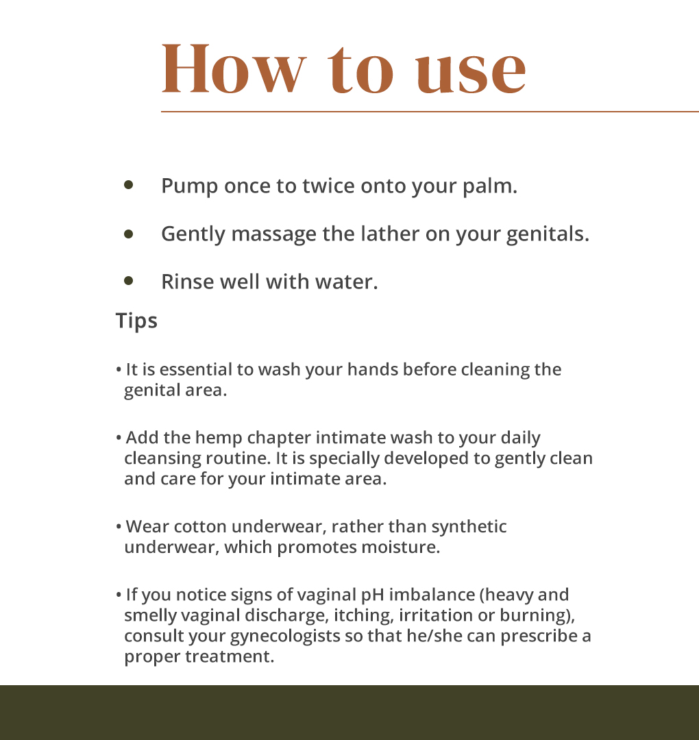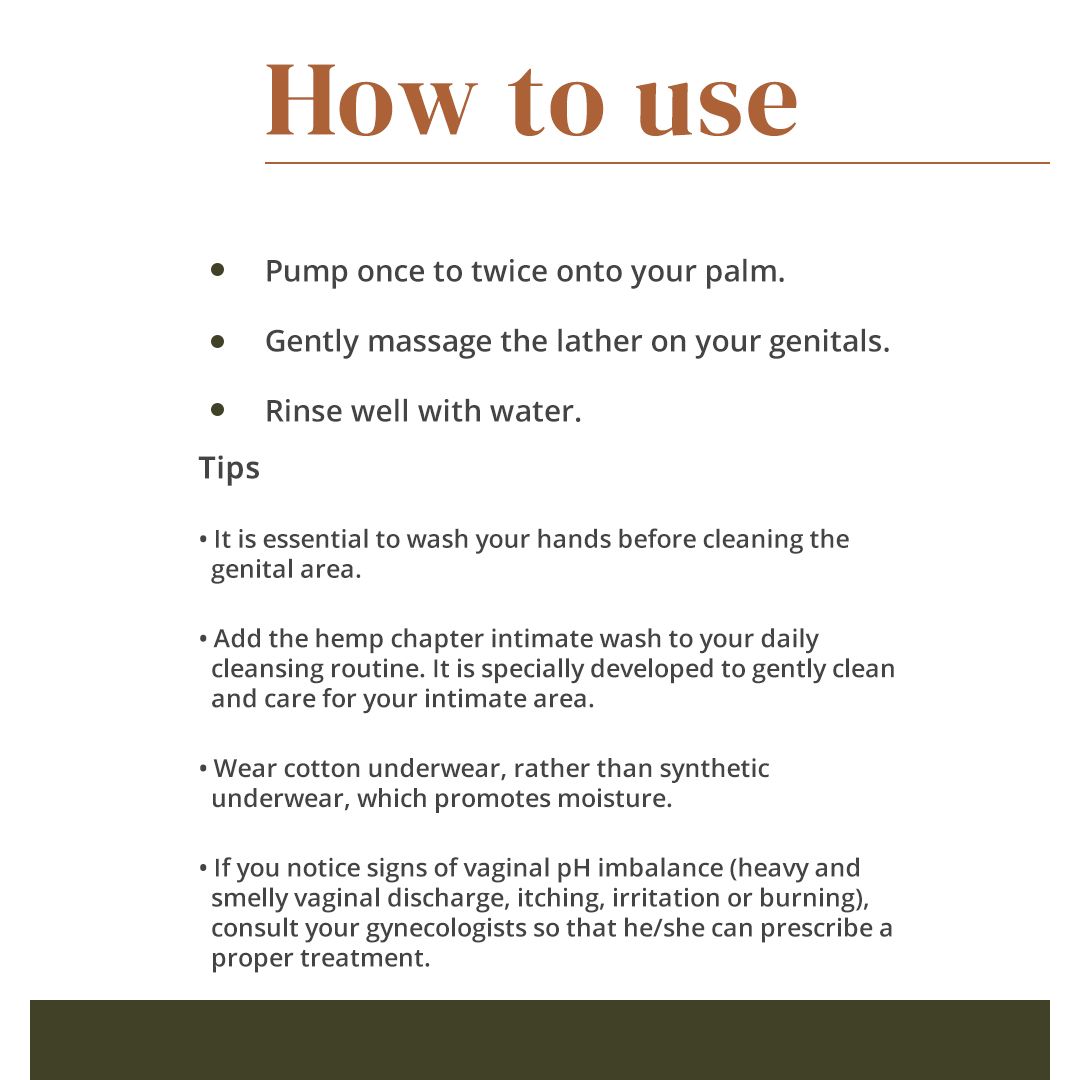 " Pump once to twice onto your palm. Gently massage the lather on your genitals. Rinse well with water."