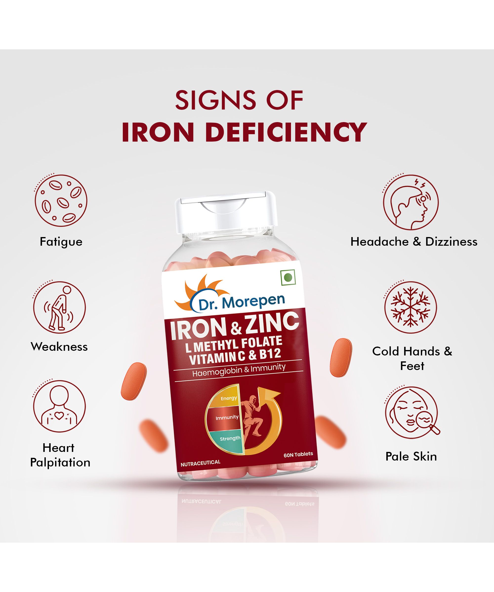 Dr. Morepen Iron Zinc tablets keep sufficient Iron reserve with Vitamin B12 & Iron, maintains HB level along with Zinc to supply oxygen to different parts of the body and keeps Immunity intact with ample Vitamin C & count of RBCs. It is most suitable for the people suffering from iron deficiency or anaemia.