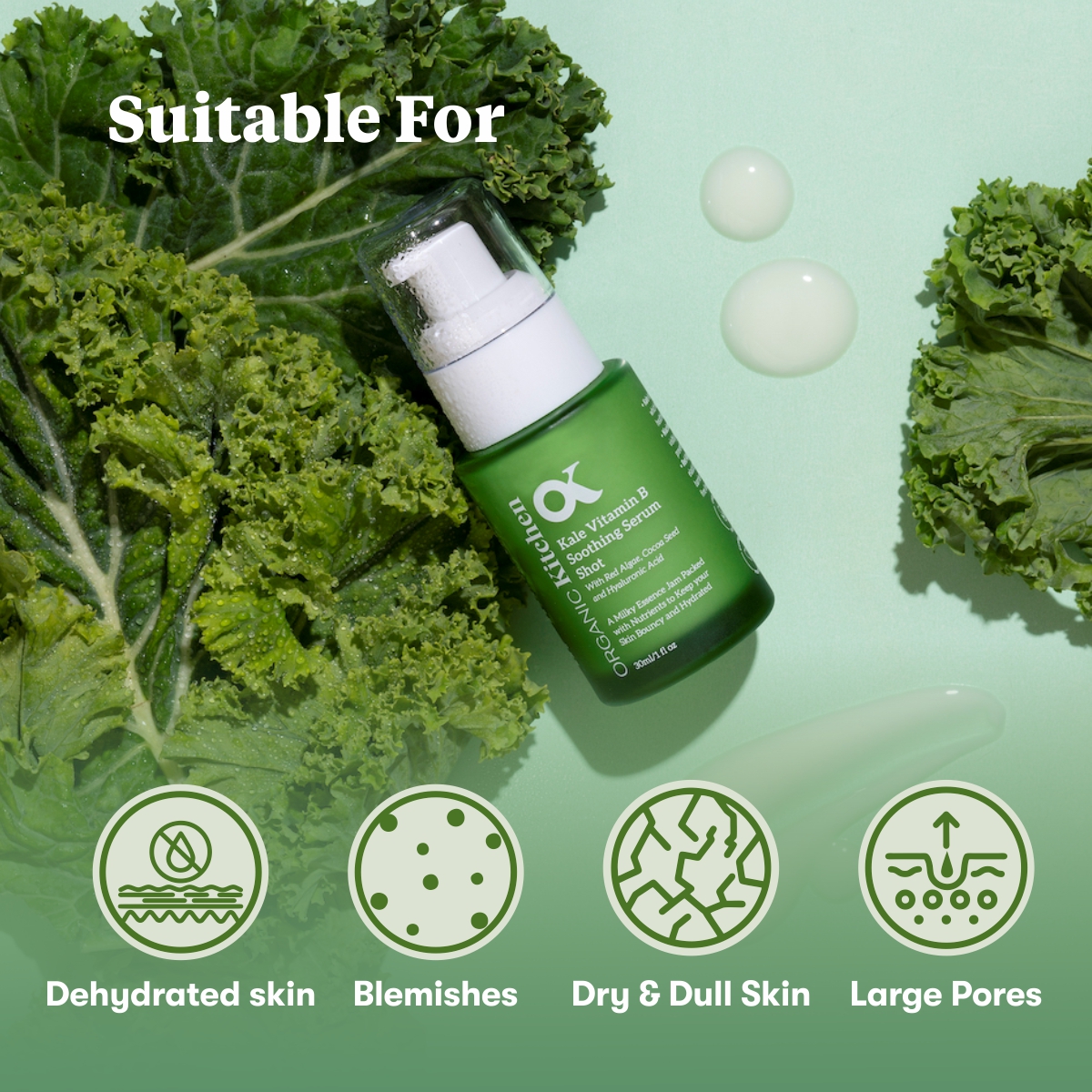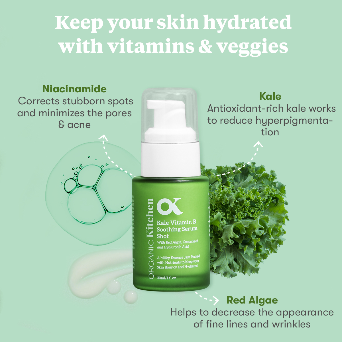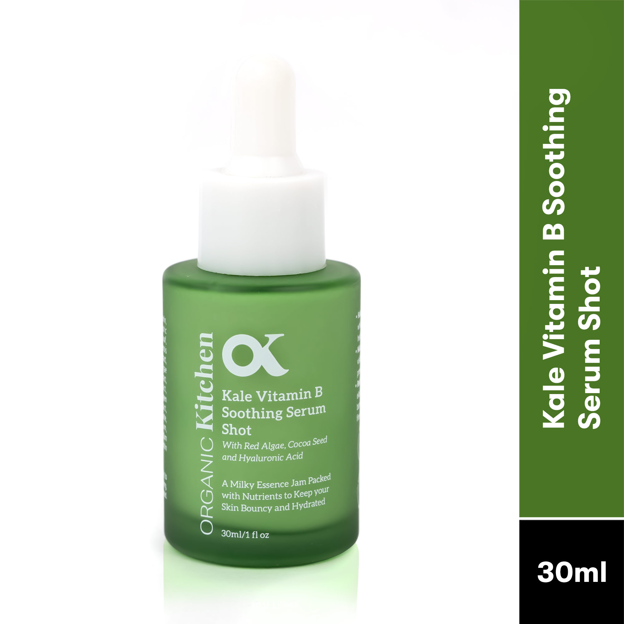 This Organic Kitchen Kale Vitamin B Soothing Serum Shot removes dead skin cells from the surface while deeply moisturizing the skin. It is enriched with Hyaluronic acid, Vitamin B, and plant-based extracts like Kale, Turmeric, Aloe Vera, and Eggplant. Kale and Turmeric provide a brightening effect on the skin and keep it healthy and youthful. Hyaluronic acid helps in attaining glowing skin by increasing hydration. This is a smooth and easy-apply serum, infused with Vitamin B which reduces skin irritation and redness. Make your skin look young and plump and avoid premature aging with the help of this serum.