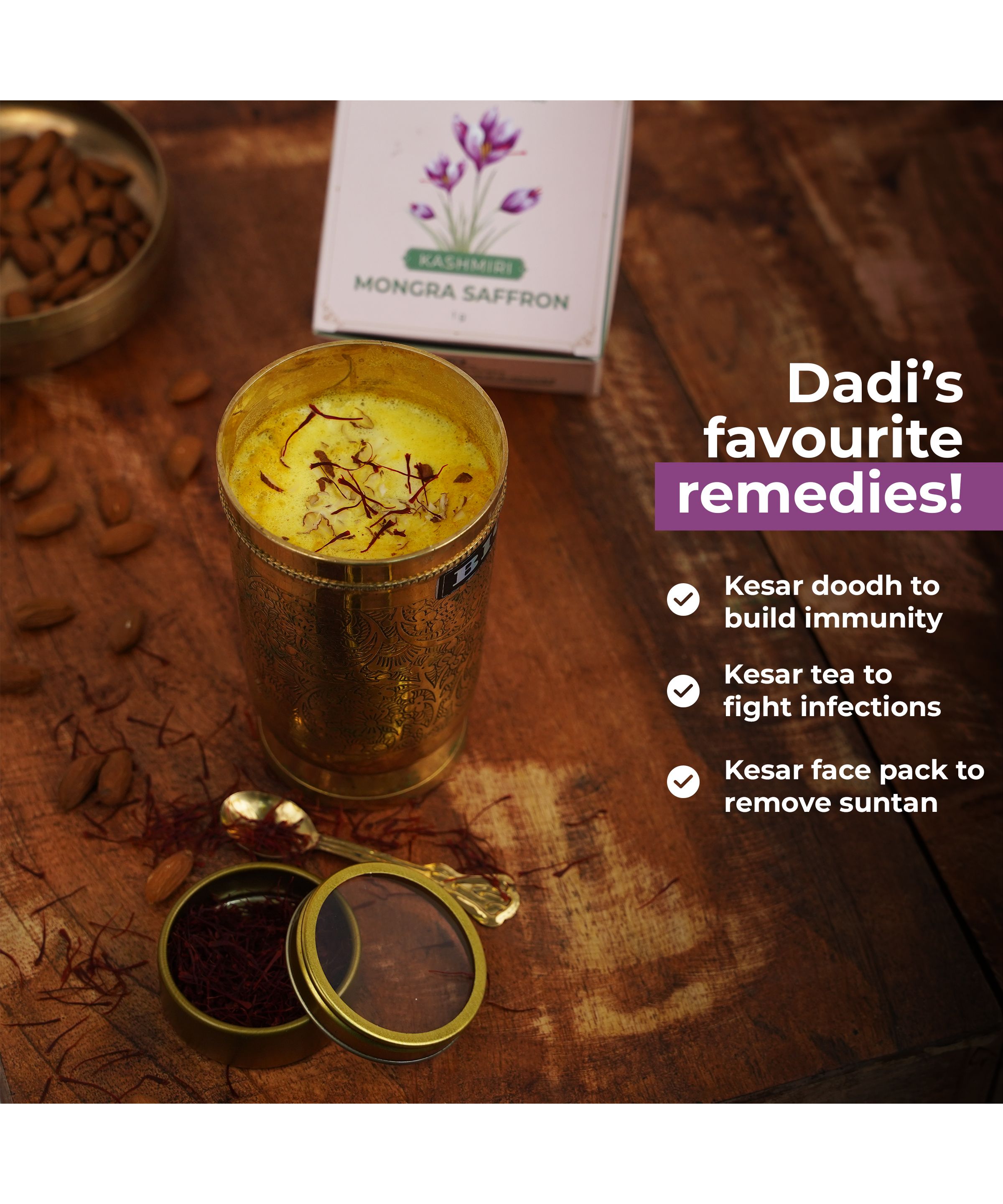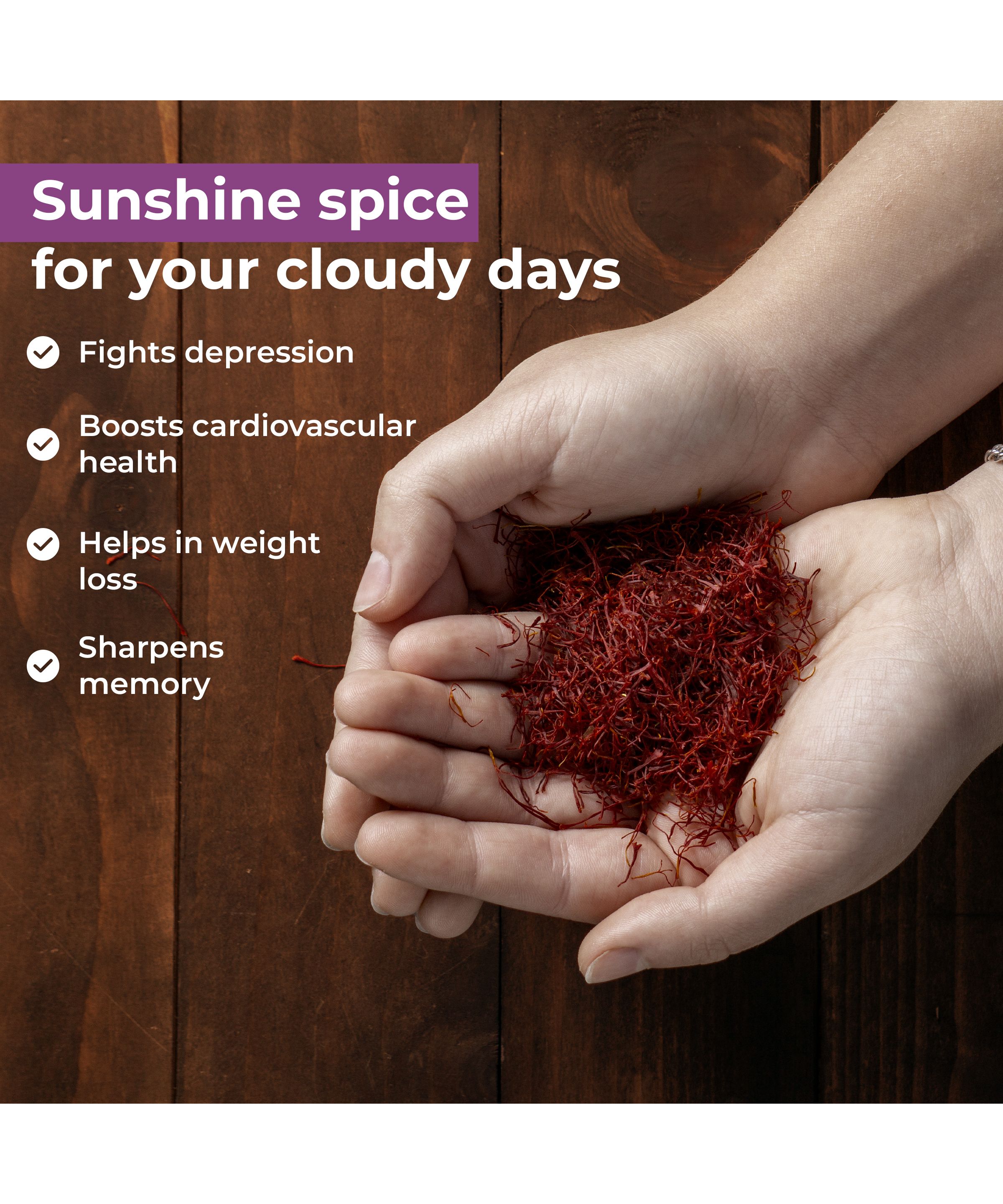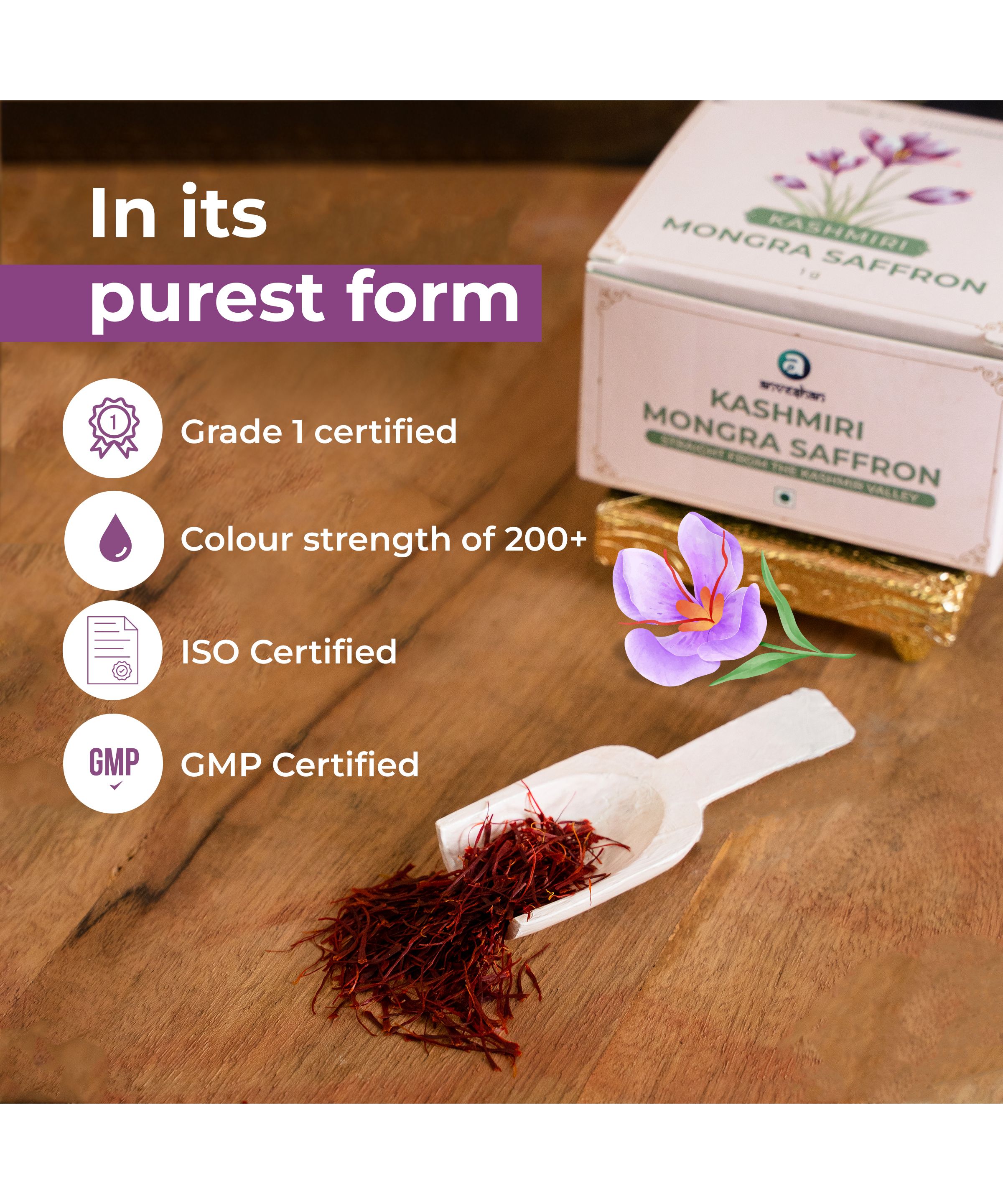 This product is premium quality saffron cultivated by farmers in the lush fields of Pampore, the saffron town of India. It is made by handpicking only the stigma (mongra threads) of the saffron flower, ensuring the finest quality for you. This saffron has a rich flavour, fragrant aroma, thicker strands and a superior colouring strength of 200+. It is 100% natural, with no artificial colours, additives or preservatives. It is packed in airtight containers to preserve the freshness and aroma. Our saffron is Grade 1 certified and goes through 11 lab tests, making it the best available saffron in the market.