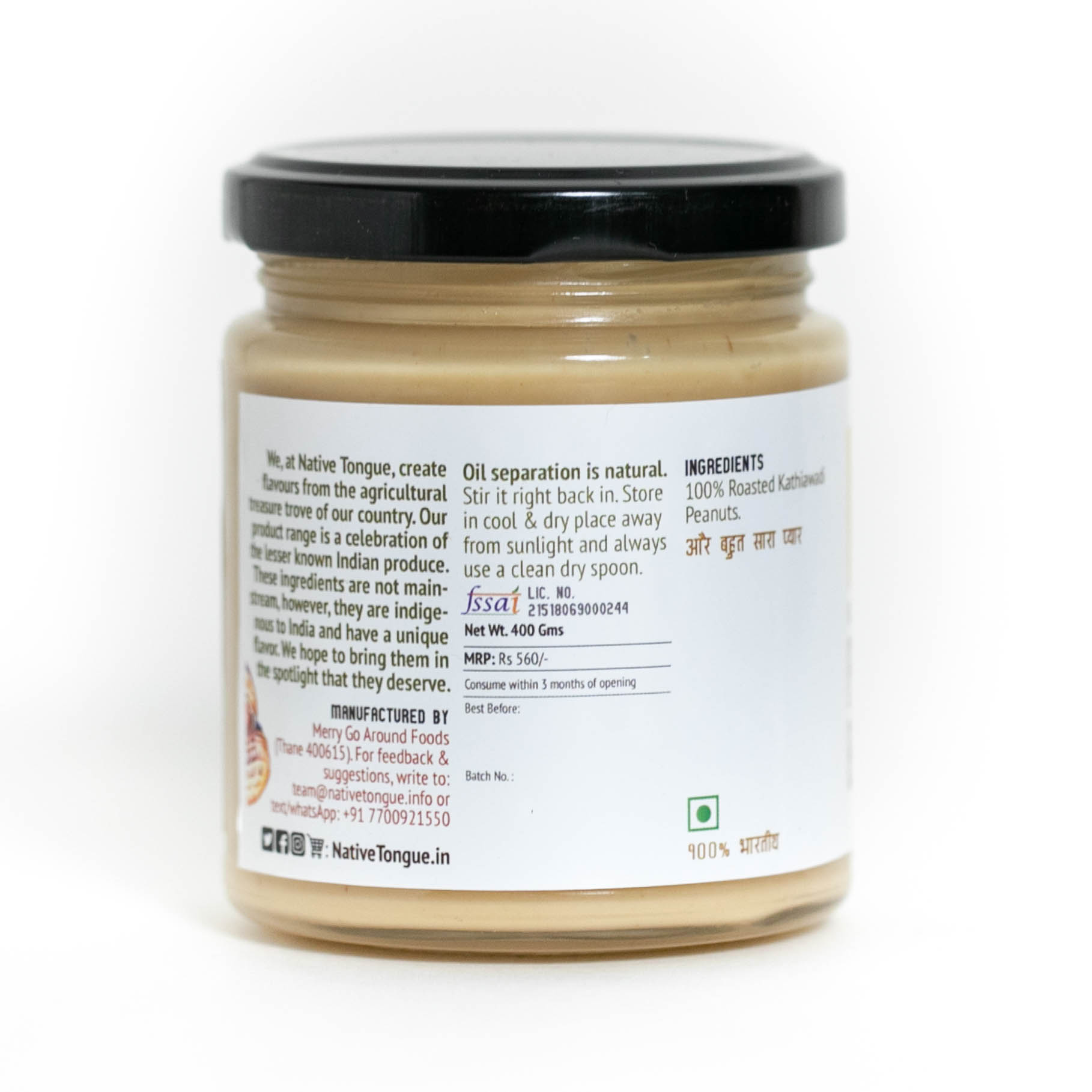 Premium quality sand-roasted peanuts from Kathiawad peninsula in Gujarat are slowly crushed in a traditional stone grinder to whip up our delicious All Natural Peanut Butter. Contains no added flavours, spices, oil, salt or sugar. 100% pure Kathiyawadi Peanuts.