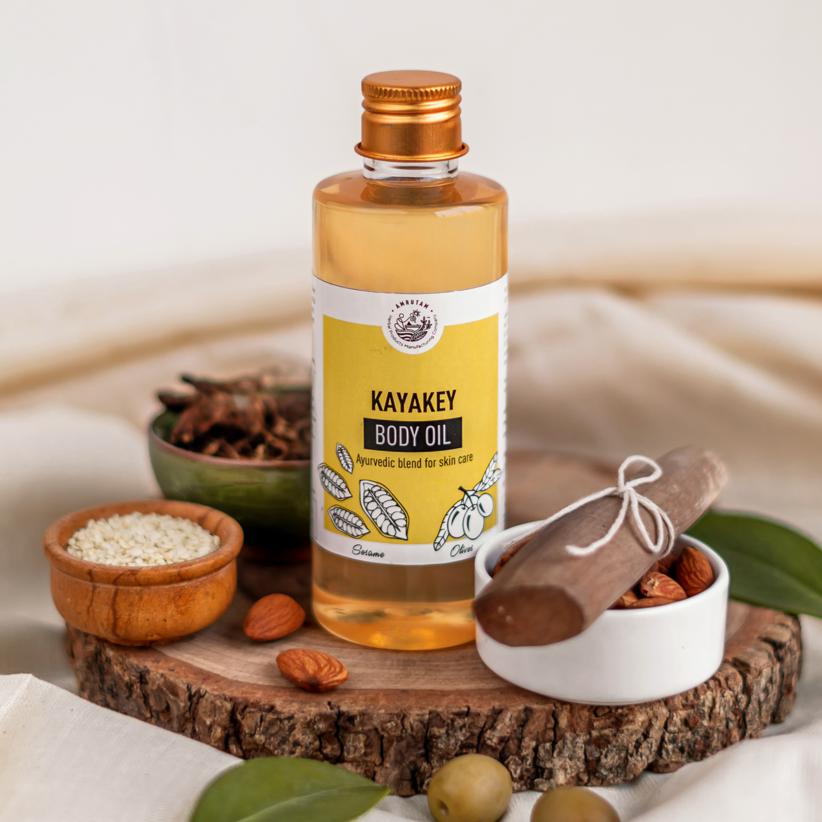 Amrutams Kayakey Body Oil is a herbal blend of Sesame, Olive, Jatamansi, and Almond oils. An Ayurvedic massage oil that nourishes and protects the skin, making it soft and supple. This herbal body oil protects your skin against UV radiation damage and soothes the burning sensation of the skin, while also improving your skin complexion.