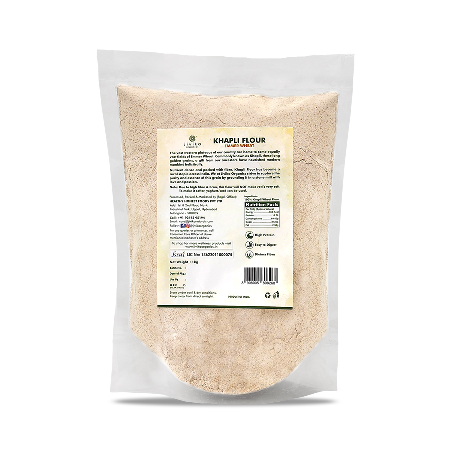 Nutrient dense and packed with fibre, Khapli Flour is a staple across India. We at Jivika Organics strive to capture the purity and essence of our rural farming communities in every batch of our Emmer Wheat (Khapli) Flour. The long, golden grains are ground in a stone mill, keeping their nutrients undisturbed and unadulterated. Khapli Flour is a great replacement for regular wheat flour due to its Low GI and high bran content.