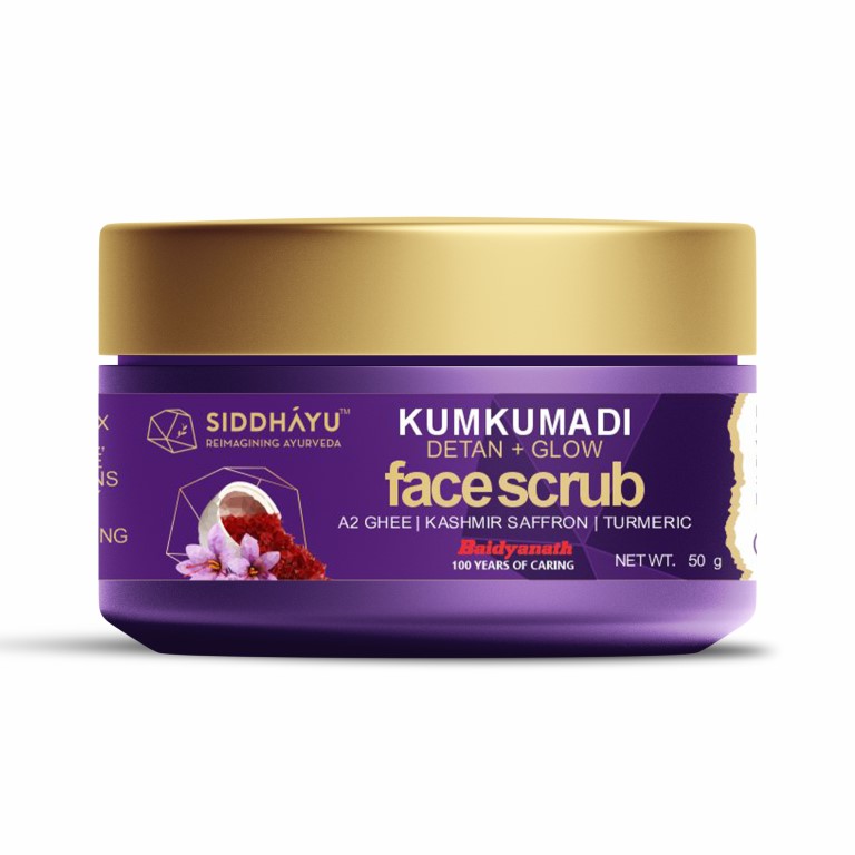 An exclusive herbal scrub enriched with kumkumadi oil, Siddhayu traditionally-crafted skin elixir. Revive your ever-fresh, de-tanned, youthful bloom! A fortifying, saffron-infused face scrub that helps revive dull and damaged skin. It gently exfoliates the skin to remove the tan and brighten it. It helps fade pigmentation and blemishes to reveal your naturally glowing skin. Look and feel younger with Siddhayu Kumkumadi Skin Brightening Face Scrub. Its exfoliating power peels away compromised skin, grime, and suntan to unveil the underlying freshness. Ethically sourced, pure A2 ghee adds a luxurious creaminess that keeps your skin hydrated with a dewy soft look. Nano-sized walnut shell particles exfoliate, while premium Kashmiri saffron adds the touch of a golden glow. Use regularly for healthy, and blemish-free skin.