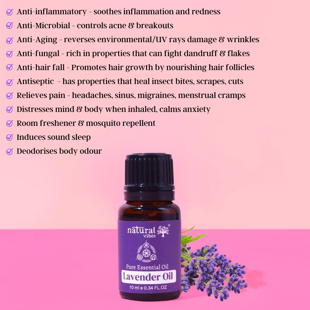 Natural Vibes Lavender Essential Oil offers a diverse range of wellness and therapeutic benefits. With its soothing aroma and medicinal properties, Lavender oil is highly effective in addressing various skin, hair, and body ailments. Its potent properties make it a valuable asset for healing purposes. In aromatherapy, Lavender oil works wonders on the mind by reducing stress and anxiety, promoting relaxation, and enhancing mental well-being. Whether applied topically or used in diffusers, Lavender oil provides a holistic approach to health and tranquilly. Harnessing the power of Lavender, this essential oil provides a natural and versatile solution for promoting overall balance and harmony in both body and mind.