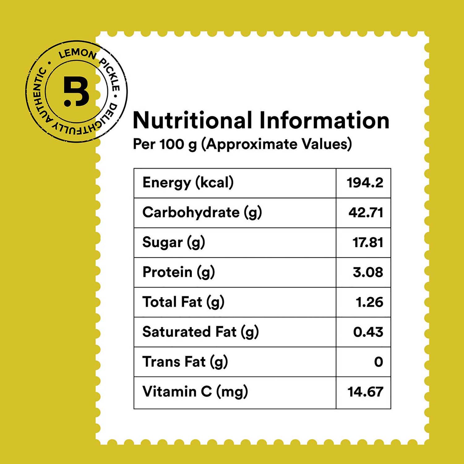 Healthy Bite: Barosi Lemon Pickle is Oil free. It is a good source of Vitamin C. It also helps in digestion, cures nausea, avoids loss of appetite and motion sickness.