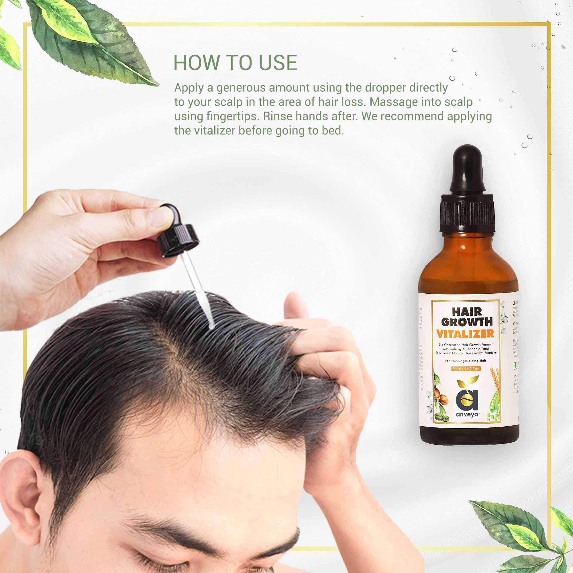 1. Hair growth vitalizer serum: Apply directly onto your scalp in the area of hair loss, using the dropper. Massage into the scalp using fingertips. Rinse hands after use.