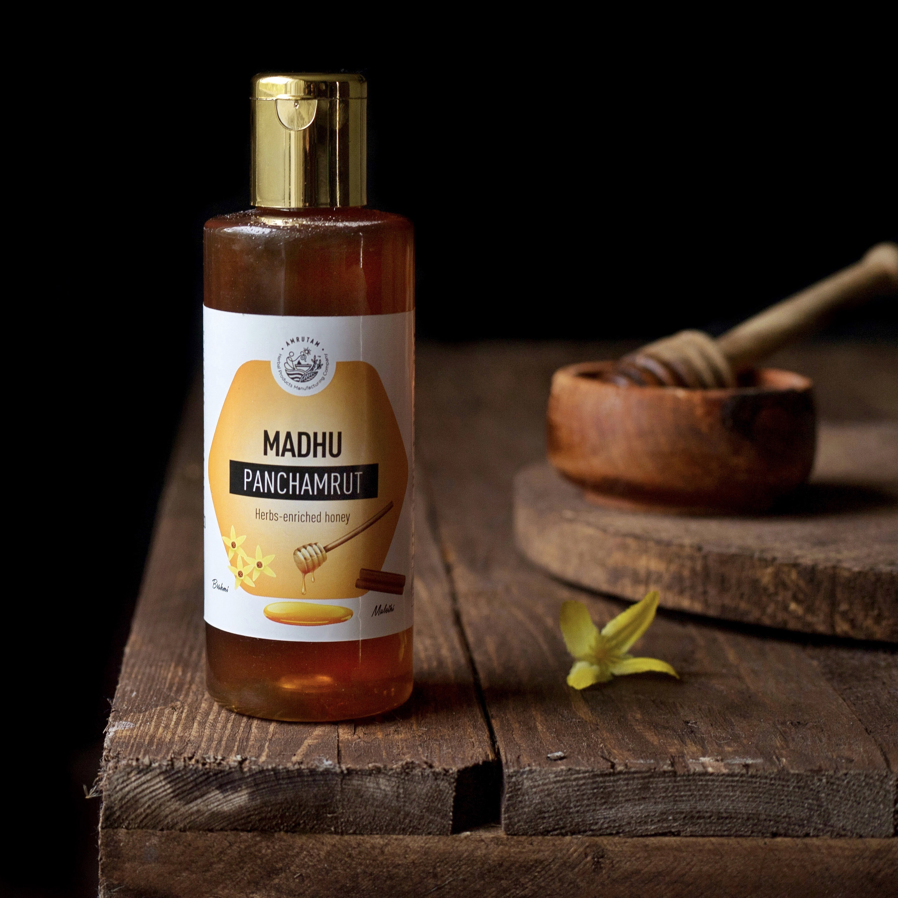 Enriched with the goodness of herbs like Tulsi, Mulethi, Brahmi and Madhu Sita, Amrutams Madhu Panchamrut is an authentic Ayurvedic formulation with healing properties. It is beneficial in treating sore throats, cold, fevers and seasonal flus and can be consumed in a variety of ways. It is also useful in improving the texture of the skin and acts as a natural conditioner for hair health when applied externally.