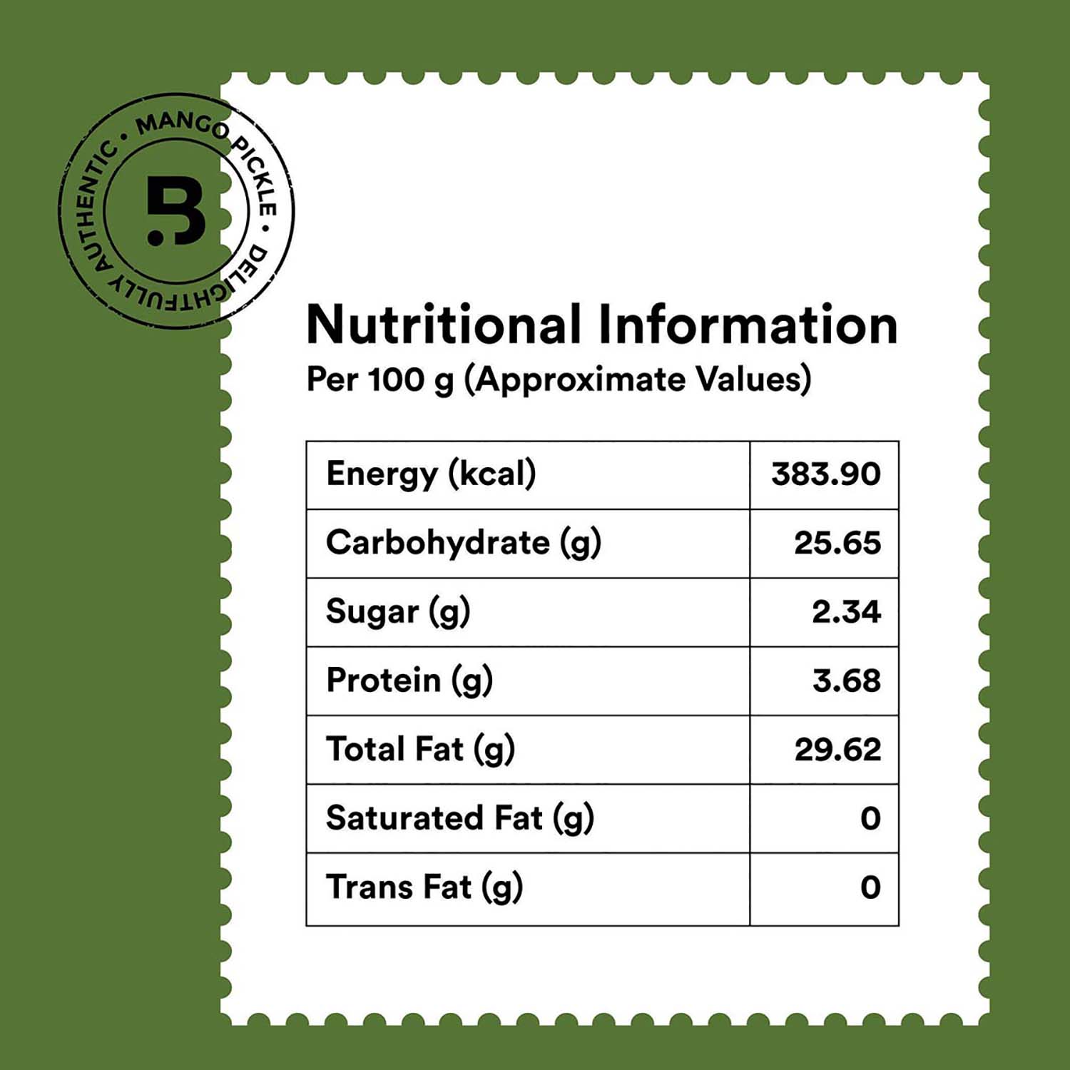 Serving Suggestion: Barosi Mango Pickle goes well with a full meal, as an evening snack with Tea & Mathri, to add a dash of flavour to khichdi, or as we love it - morning breakfast of triangle parantha, mango pickle & chai.