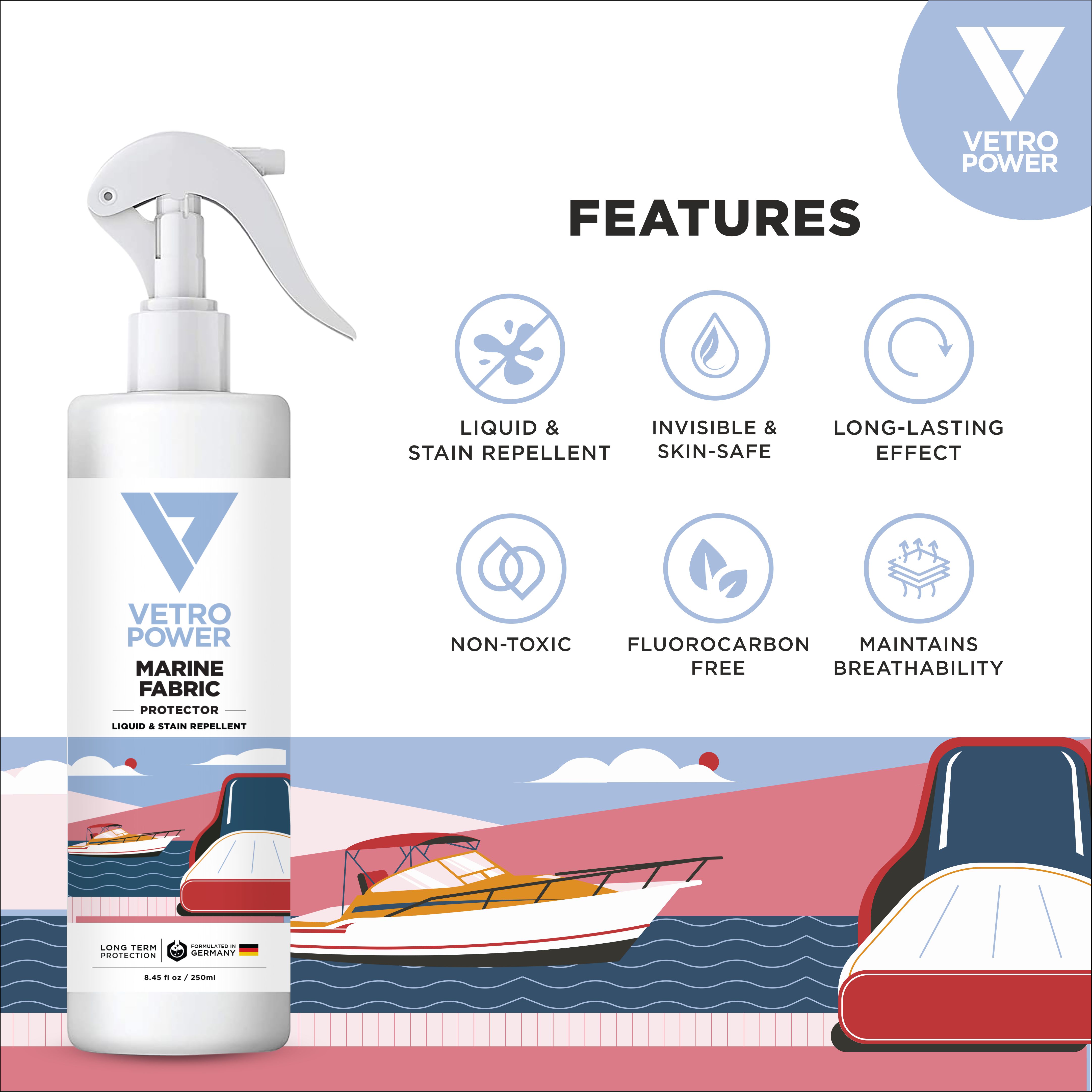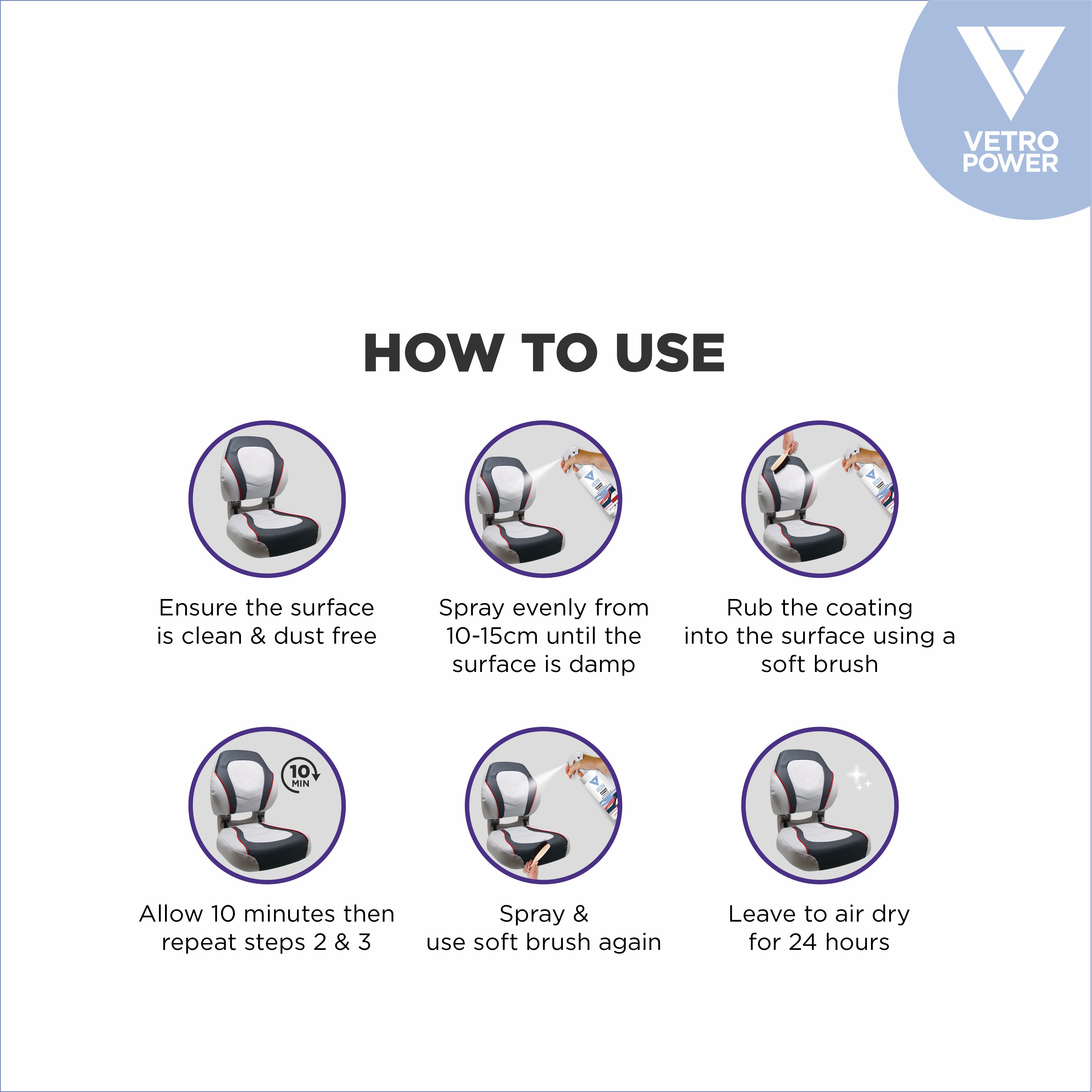 Marine Fabric Protector Spray Protector Spray is an innovative product designed to provide protection and enhance the durability of various fabrics and clothing items. This advanced formula creates an invisible shield that repels liquids, stains, and dirt, keeping your fabrics cleaner for longer periods. The spray is formulated using state-of-the-art nanotechnology, which allows it to penetrate deep into the fabric fibers and create a protective barrier. This barrier prevents liquids and stains from seeping into the fabric, making it easier to clean and maintain the appearance of your clothing and other fabric items. Vetro Power Fabric & Clothing Protector Spray is suitable for use on a wide range of fabrics, including clothing, upholstery, curtains, carpets, and more. It is safe to use on both natural and synthetic fibers, ensuring that your favorite items remain protected regardless of their composition. One of the key features of this spray is its long-lasting effectiveness. Once applied, it forms a durable coating that can withstand multiple washes and wear, ensuring continuous protection. This makes it an ideal choice for high-traffic areas or frequently used clothing items that are prone to spills and stains. The spray is colorless and odorless, so it won't alter the appearance or scent of your fabrics. In summary, Vetro Power Fabric & Clothing Protector Spray is a cutting-edge solution for protecting and preserving the quality of your fabrics and clothing items. With its advanced formula, long-lasting effectiveness, and easy application, it provides an excellent solution for maintaining the cleanliness and longevity of your favorite fabrics.
