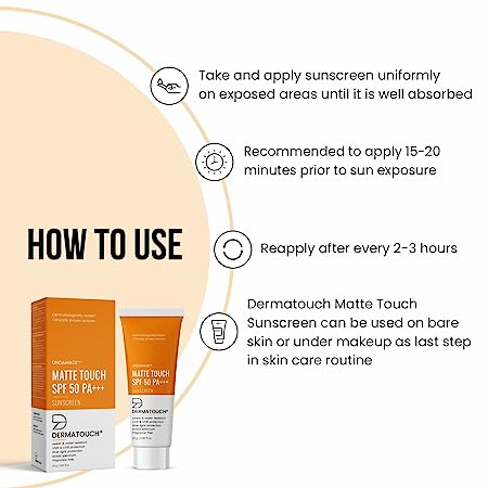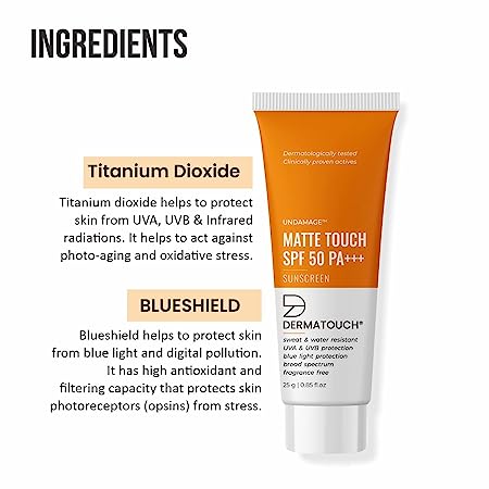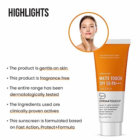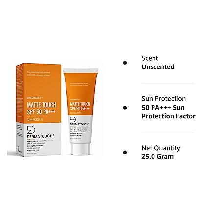 Dermatouch Matte Touch Sunscreen is dermatologically tested and formulated with clinically proven actives to provide a broad spectrum of 50 SPF that is perfect for outdoor activities.This sunscreen is water/sweat resistant with both UVA-UVB and blue light protections. Dermatouch Undamage Matt Touch Sunscreen has a silky smooth texture for a perfect mattified look.