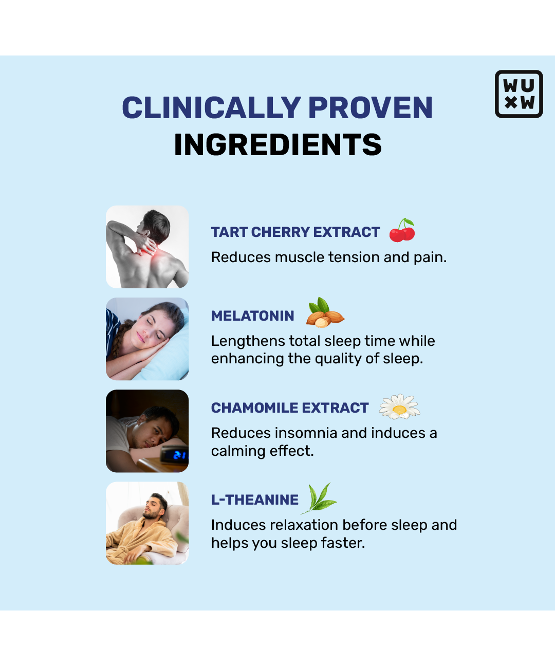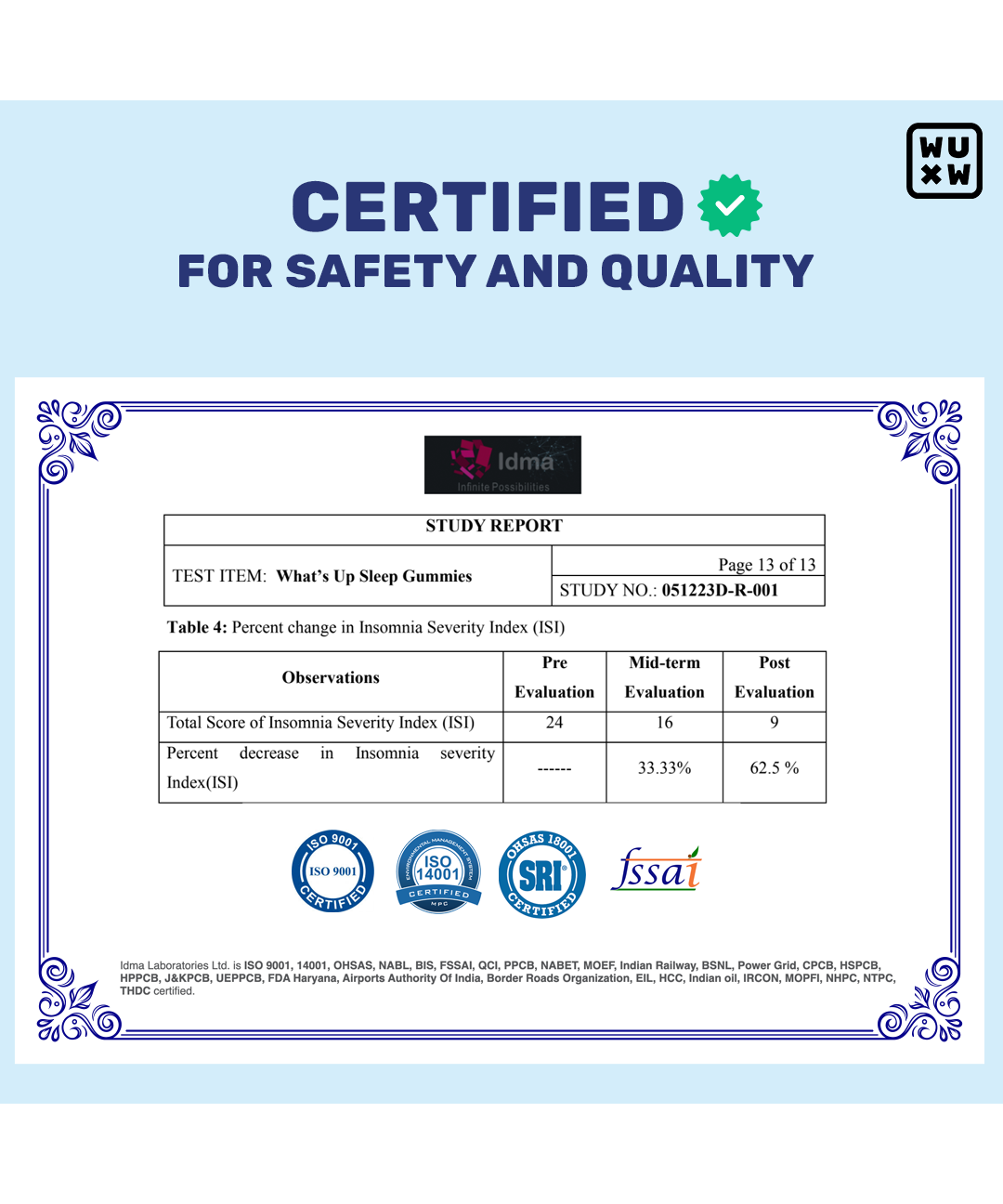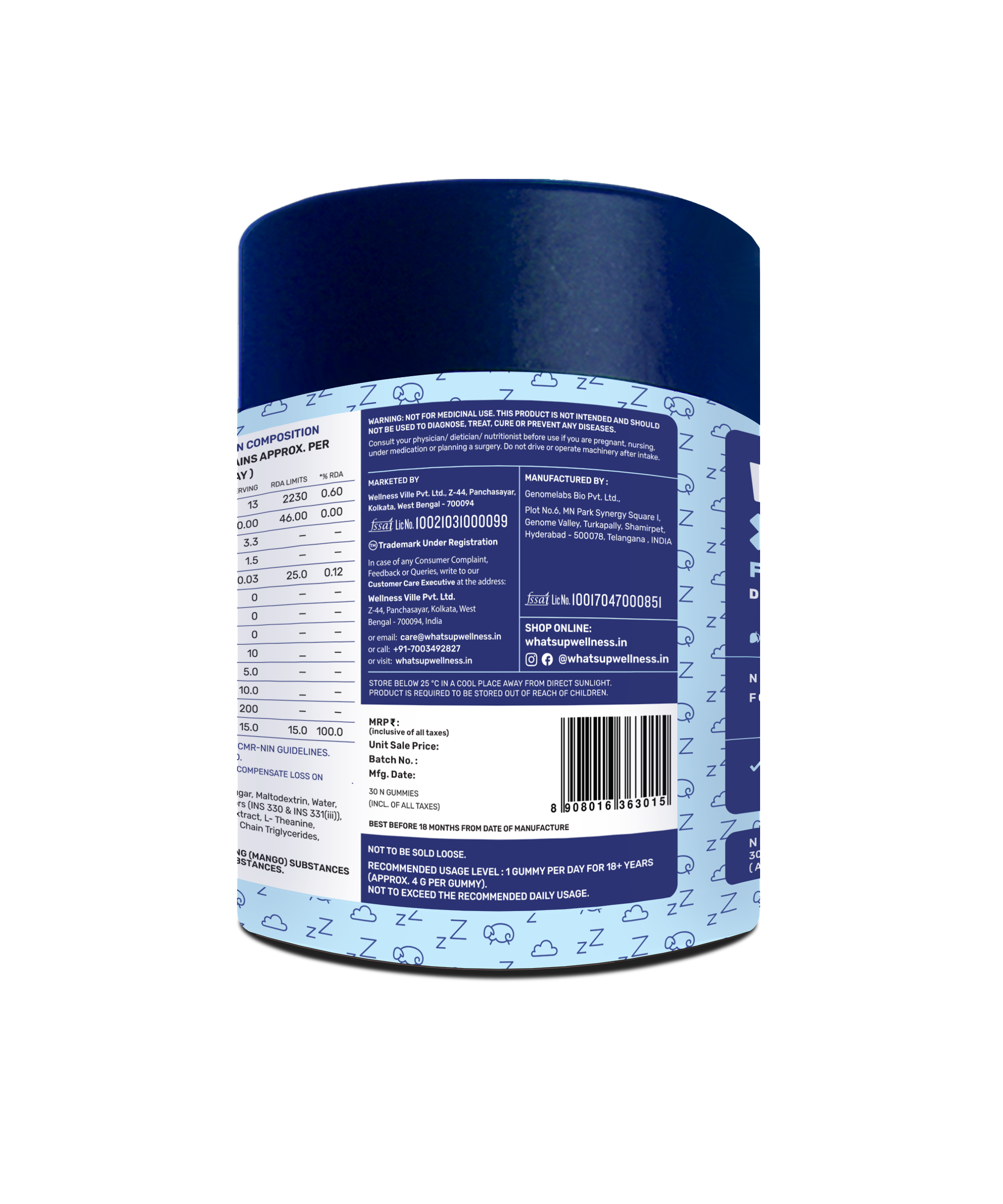 Whats Up Sleep Gummies for adults deliver a unique blend of active ingredients that work together to calm your mind and promote restful sleep so you wake up feeling refreshed with relaxed muscles. These Melatonin gummies, with L-Theanine and Botanicals like Chamomile and Tart Cherry Extracts, along with Vitamin D2 work with your body to help you fall asleep and stay asleep and rebuild muscles and reduces stiffness and soreness .Naturally flavored with Mango Extracts, our 5mg Melatonin Gummy help you drift off. They're naturally delicious, scientifically formulated and gluten-free. Good health is at the center of everything we do. That's why weve made it our mission to make nutrition easy to understand. We do it by crafting products that are as effective as they are deliciousbecause we know when something feels good, youre more likely to do it. This product is not intended to diagnose, treat, cure or prevent any disease. For occasional sleeplessness.