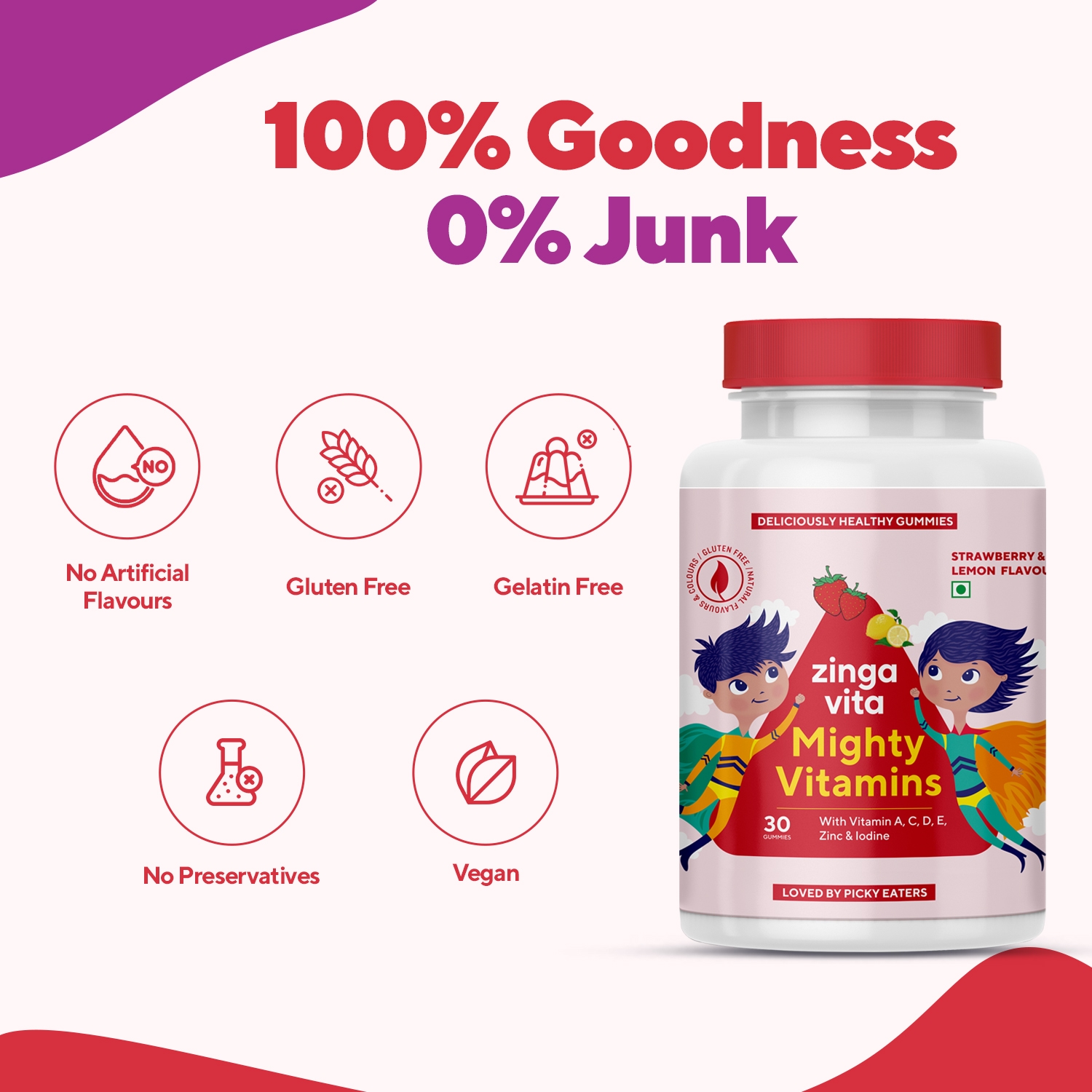 Specially Formulated For Picky Eater Kids: Not Every Part Of Getting Your Little One To Eat Healthy Needs To Be A Struggle. Zingavita Delicious Mighty Vitamins Gummies Are A Worry-Free Way To Give Your Child Wholesome Daily Nutrition. They Come In Delicious Strawberry And Lemon Flavors That Every Kid, Including Your Picky Eater, Loves. You Wont Even Have To Remember To Give Them Daily, Because Your Children Will Ask For These Yummy Gummies Themselves