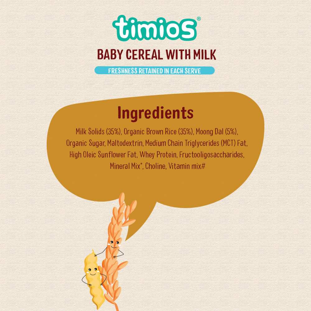 Timios Baby Cereal with Milk, Rice Ragi is a complementary food for babies from 6 to 12 months. Babies have growth spurts in stages and they need adequate nutrition along with vitamins and minerals. Timios Baby Cereal has 26 vitamins and minerals needed for healthy development in babies. Hygiene and cleanliness is of utmost importance for babies. Hence, Timios Baby Cereal is BIS certified and packed prescribed quantities in sachets to retain maximum freshness in each serve, making it easy to carry and on-the-go cereal for babies. Important Notice: Mothers milk is best for your baby. Safety Warnings: Infant food should be used only on the advice of a health worker as to the need for its use and the proper method of its use. Infant food is not the sole nourishment. Use prepared feed immediately. Discard unused feed.