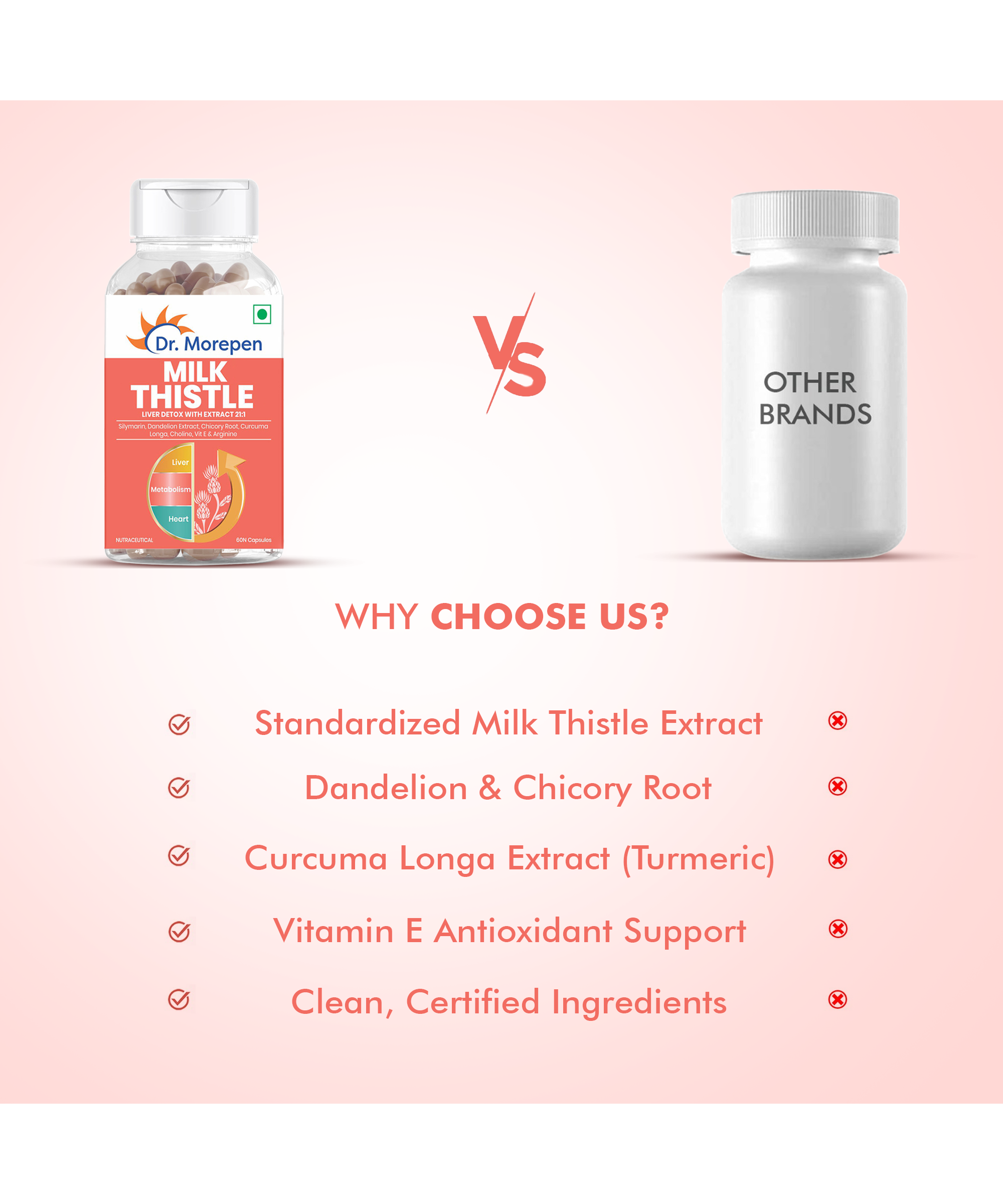 Your liver is an unsung hero despite the fact it does a thousand jobs in our body. Being liver healthy is equally important to being heart healthy. And Thats why Dr. Morepen brings to you, Milk Thistle Tablets with a unique combination of Milk Thistle Extract, Dandelion Extract, Curcuma Longa Extract, Chicory Root Extracts, Vitamin-E, Choline & Arginine for a Healthy Liver, Stomach and Heart. The Livers health is majorly important to provide digestive enzymes, metabolism of fats, protein & carbohydrates and detoxifying of blood from various toxins. These tablets are enriched with organic herbs that protect your overall health along with Liver with No Preservatives or flavours added. Try today!